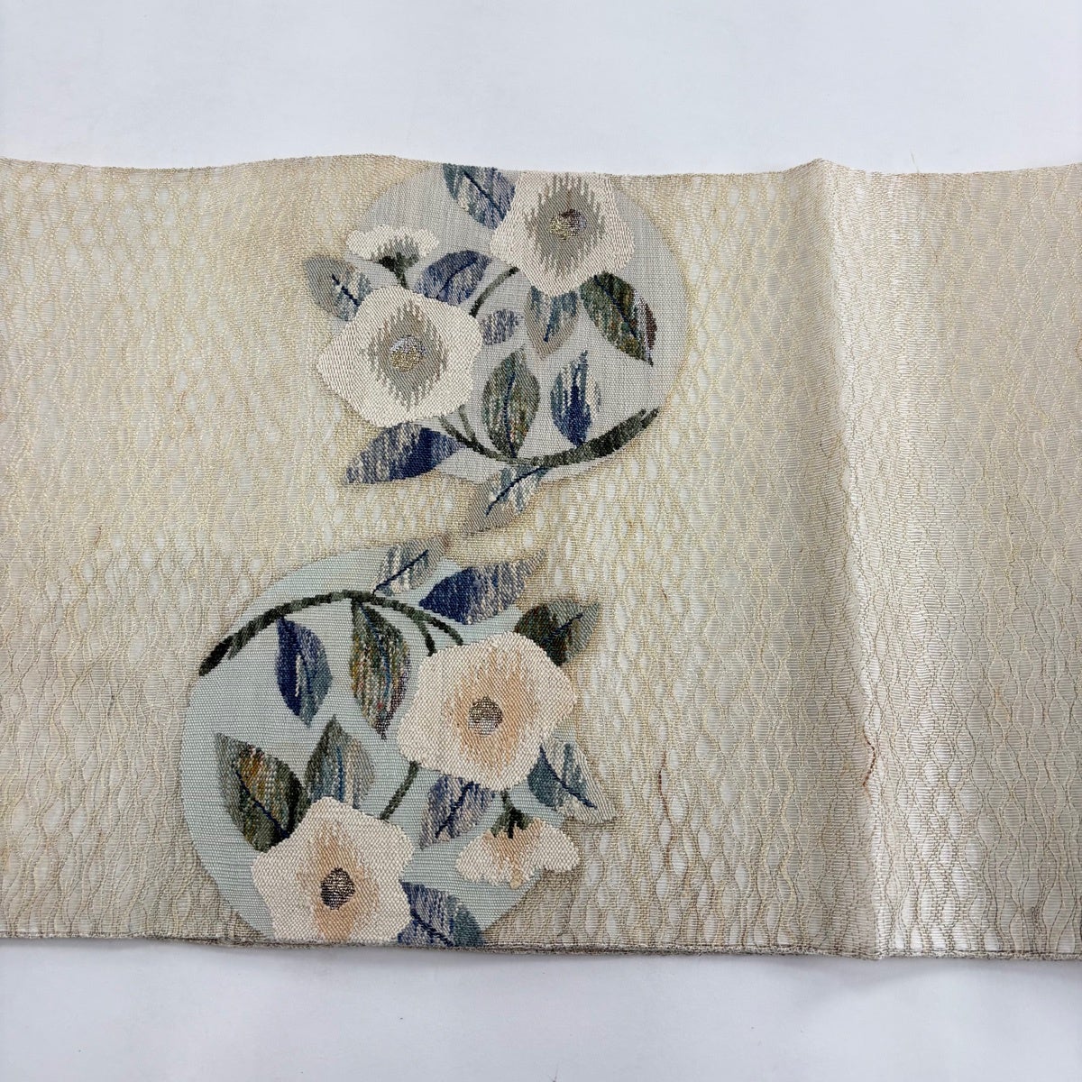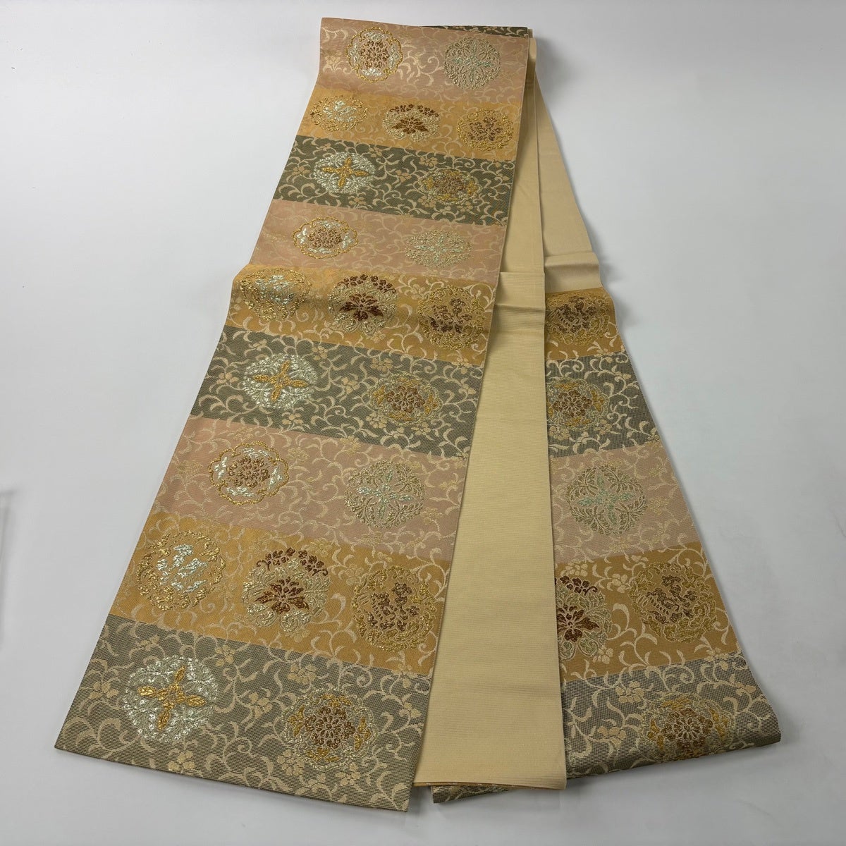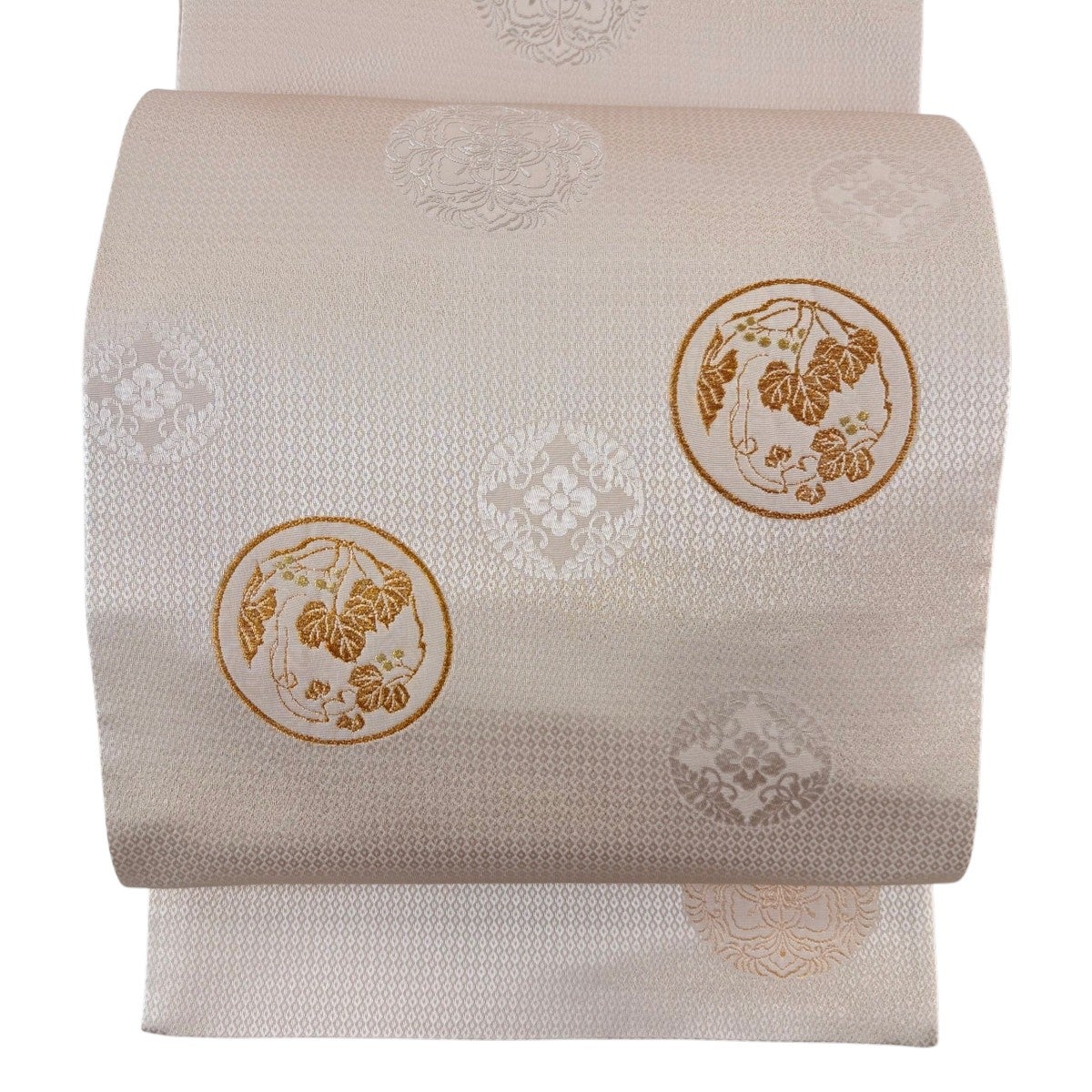 袋帯 秀品 夏帯 花丸文 金通し 箔 ベージュ お太鼓柄 正絹