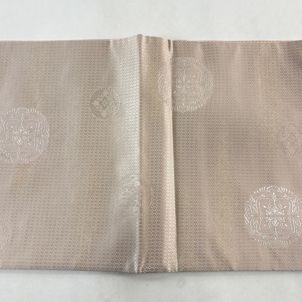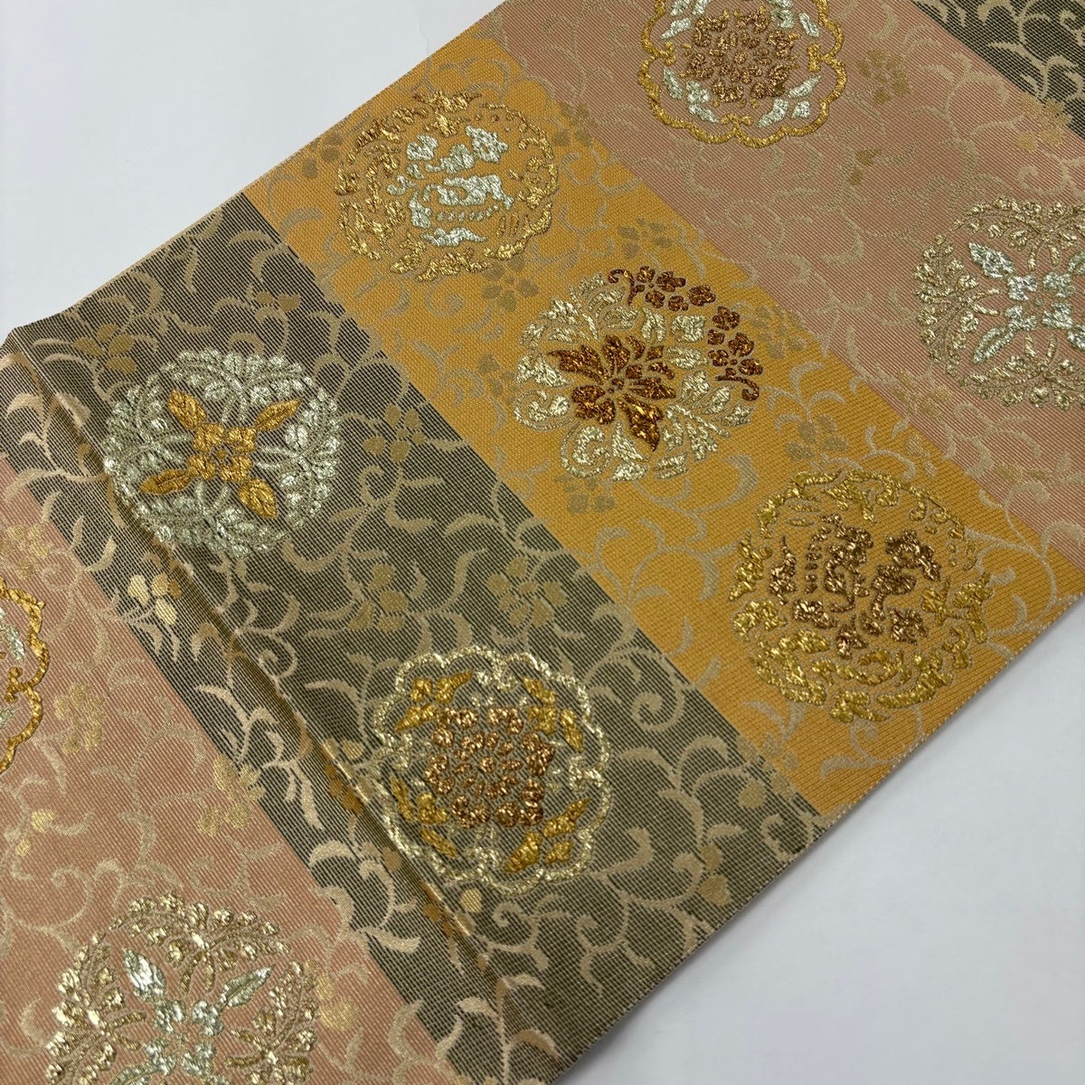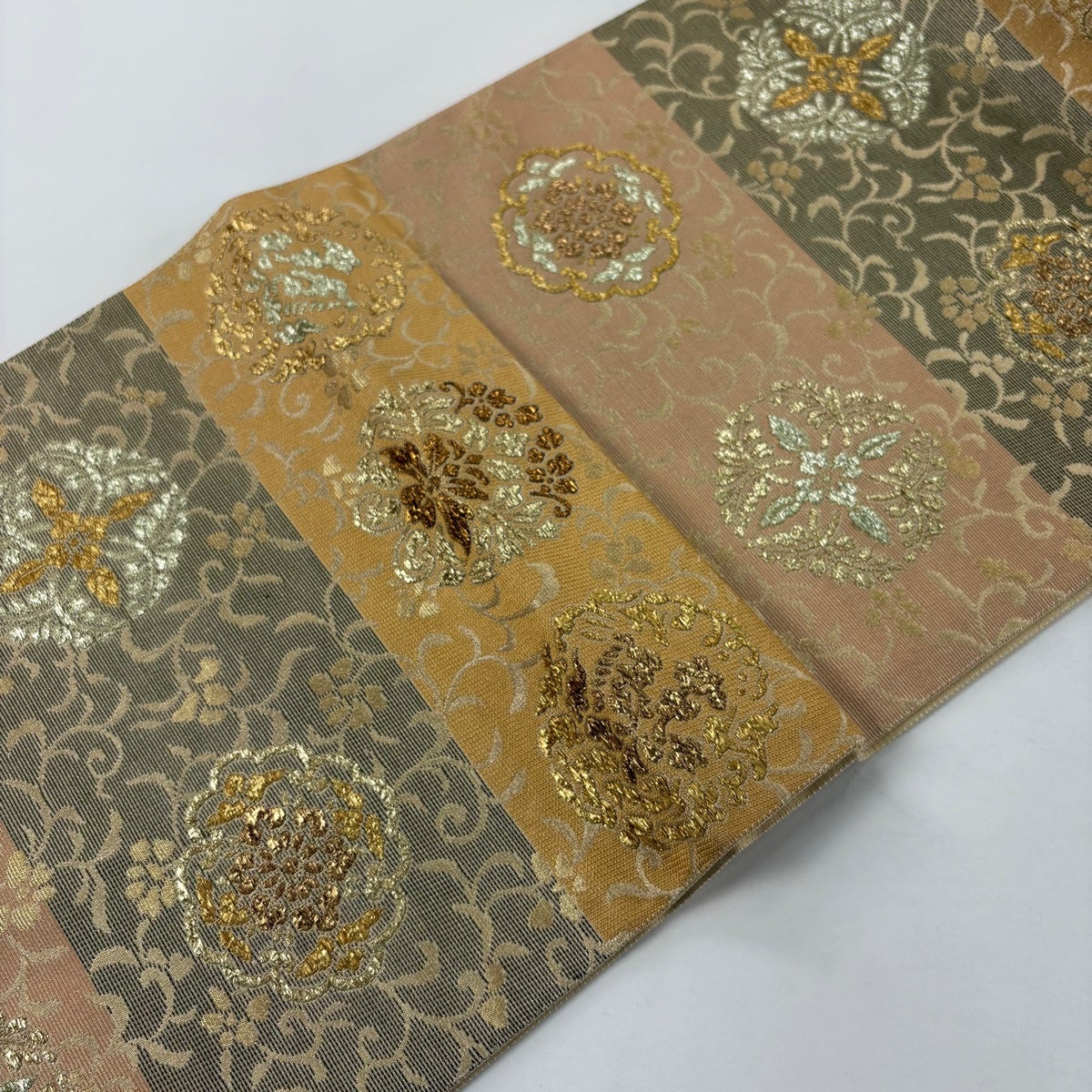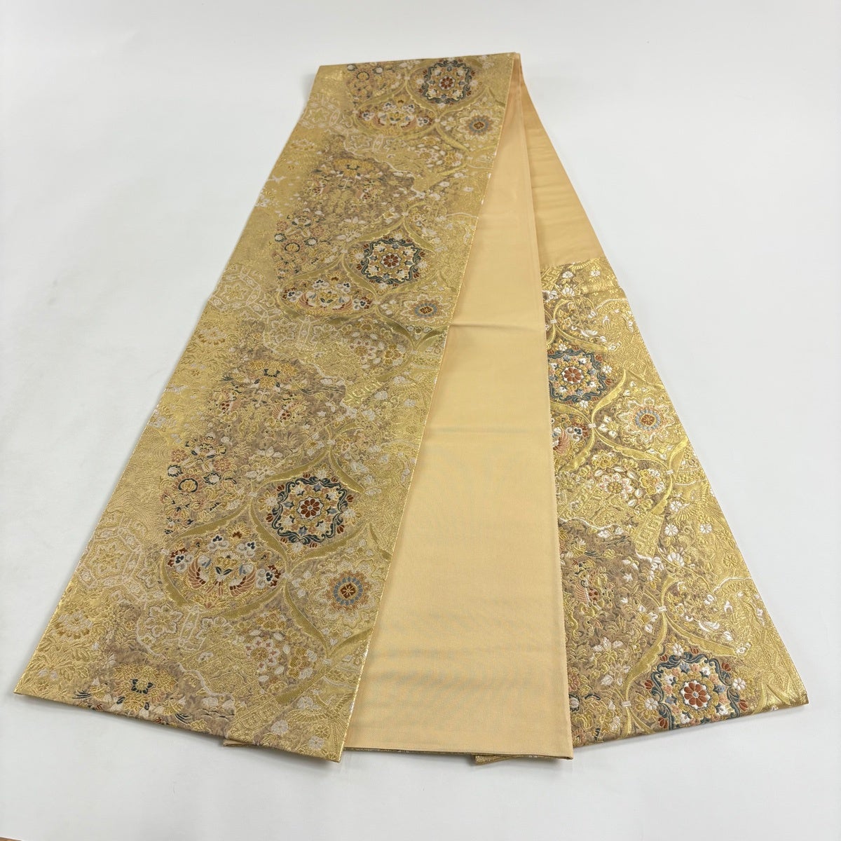 袋帯 秀品 夏帯 花丸文 金通し 箔 ベージュ お太鼓柄 正絹