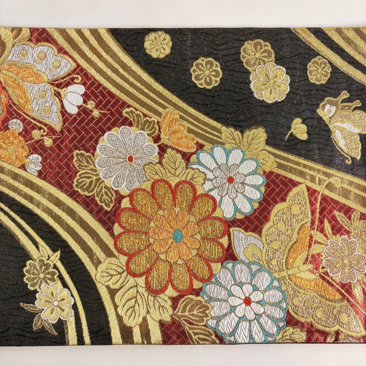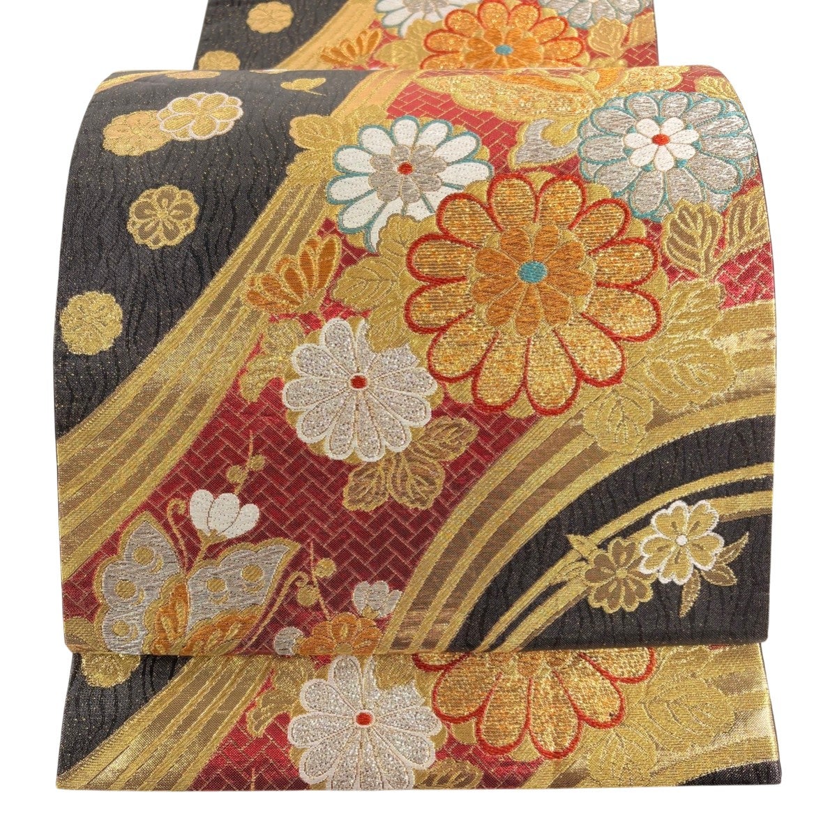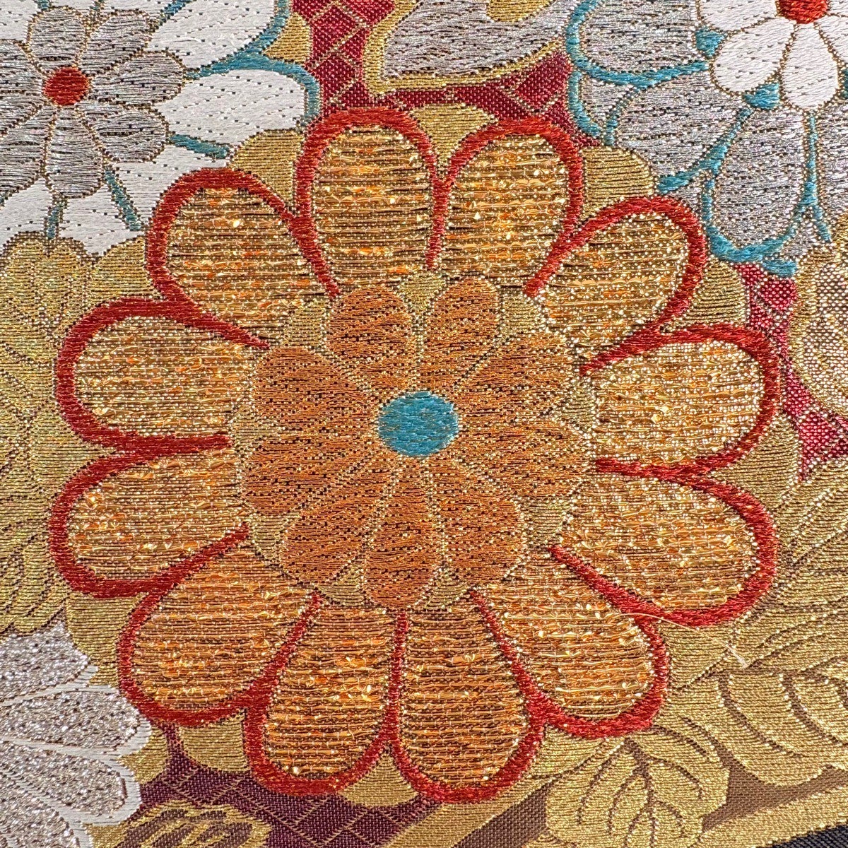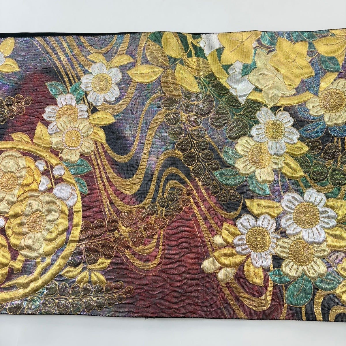 【美品】 袋帯 秀品 草花 流水 金銀糸 箔 えんじ色 六通 正絹