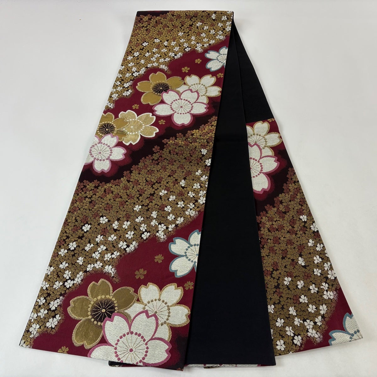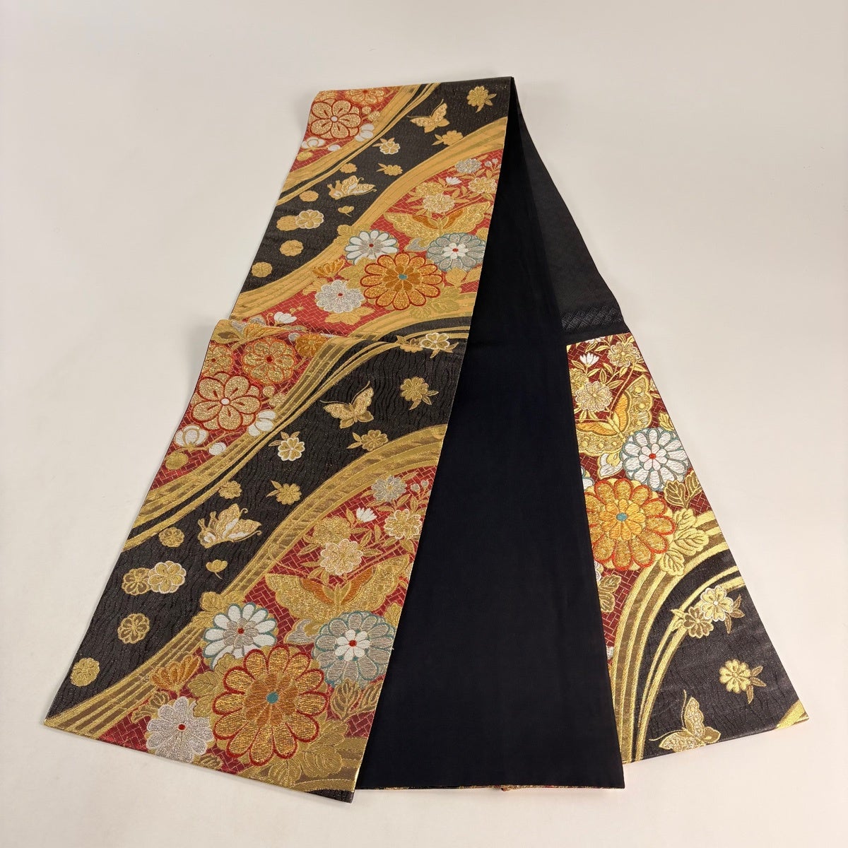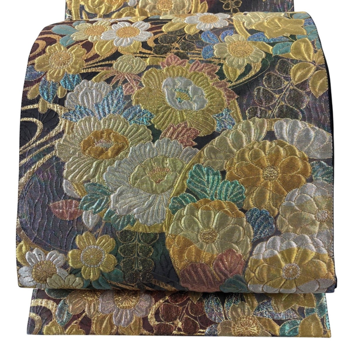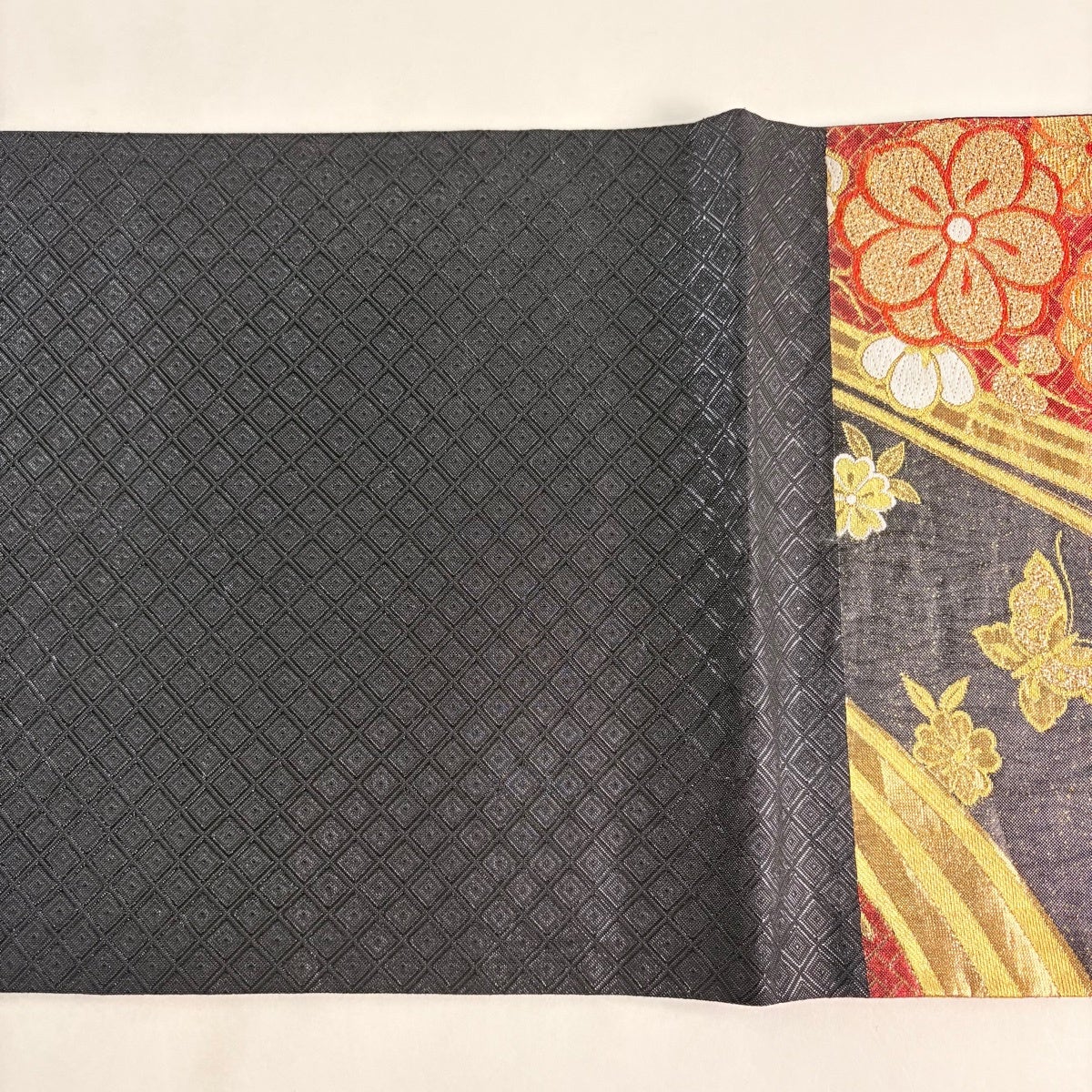 【美品】 袋帯 秀品 草花 流水 金銀糸 箔 えんじ色 六通 正絹