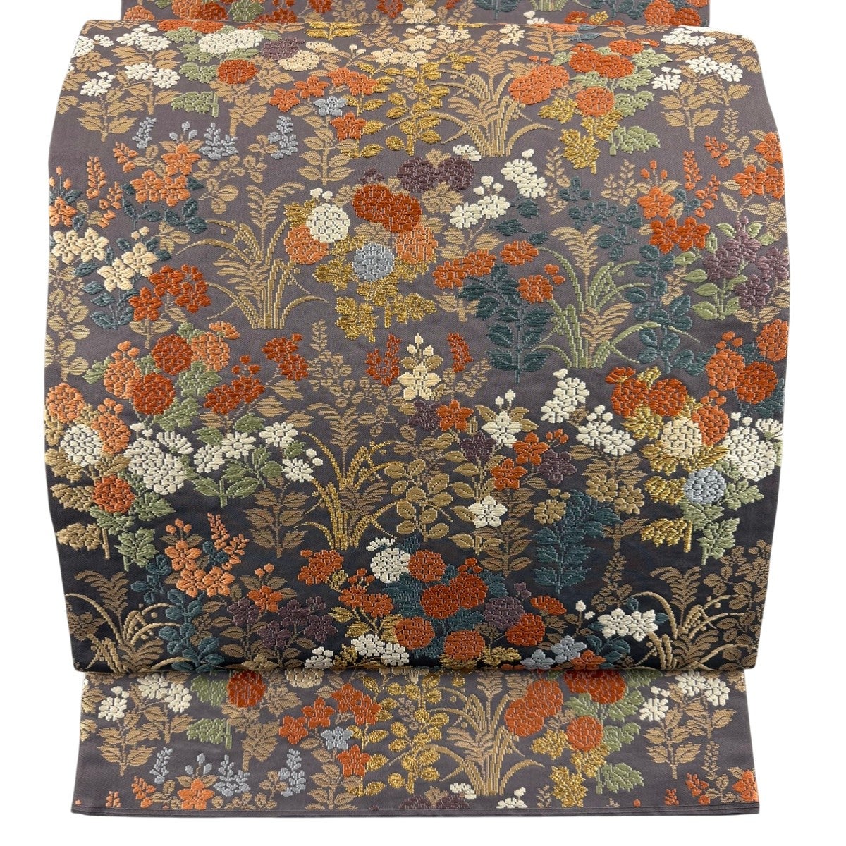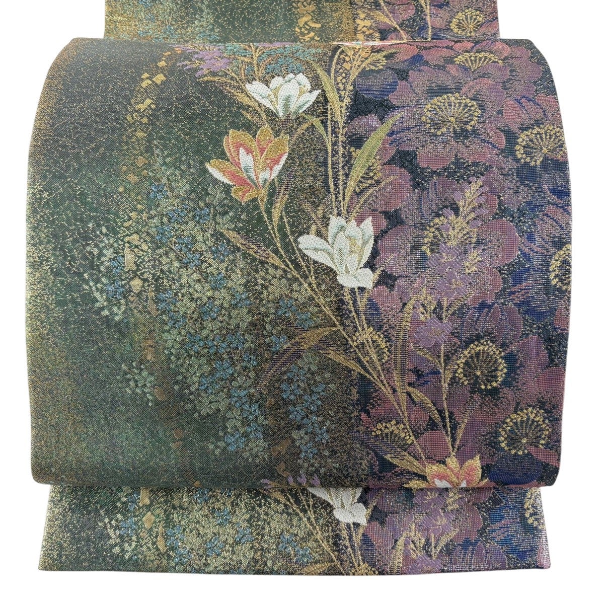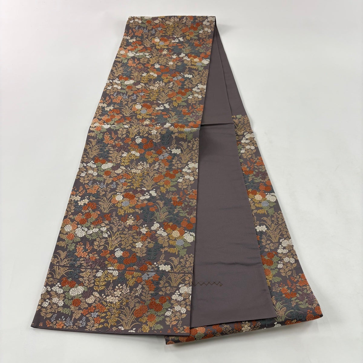 【美品】 袋帯 秀品 関西仕立て 秋草 金糸 箔 灰紫 六通 正絹