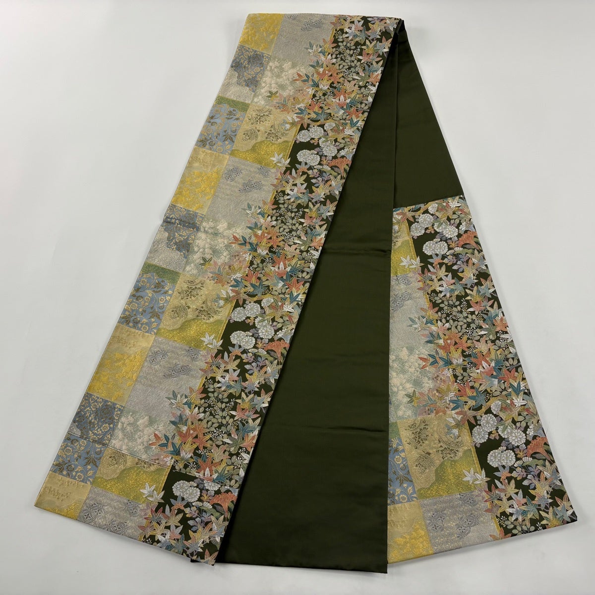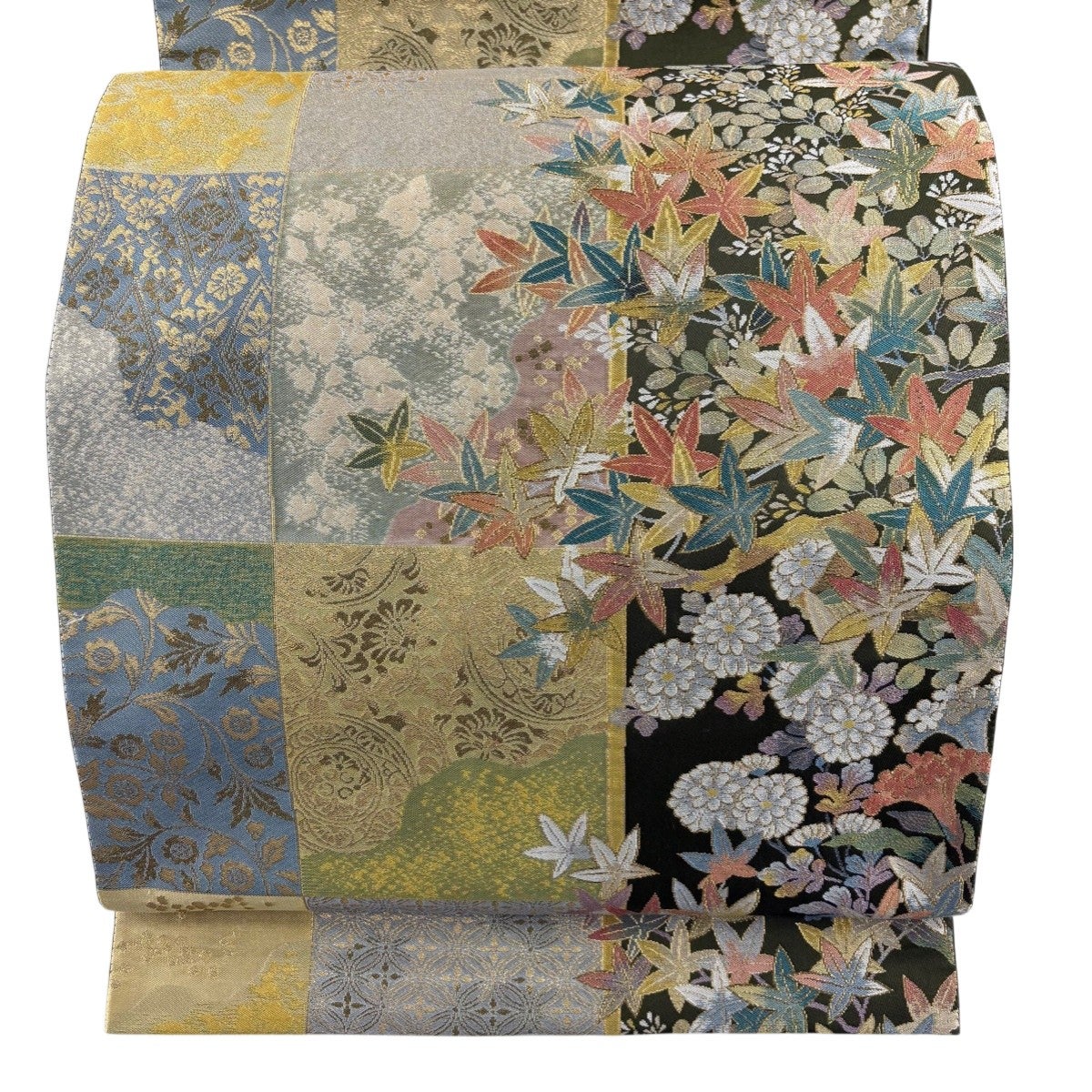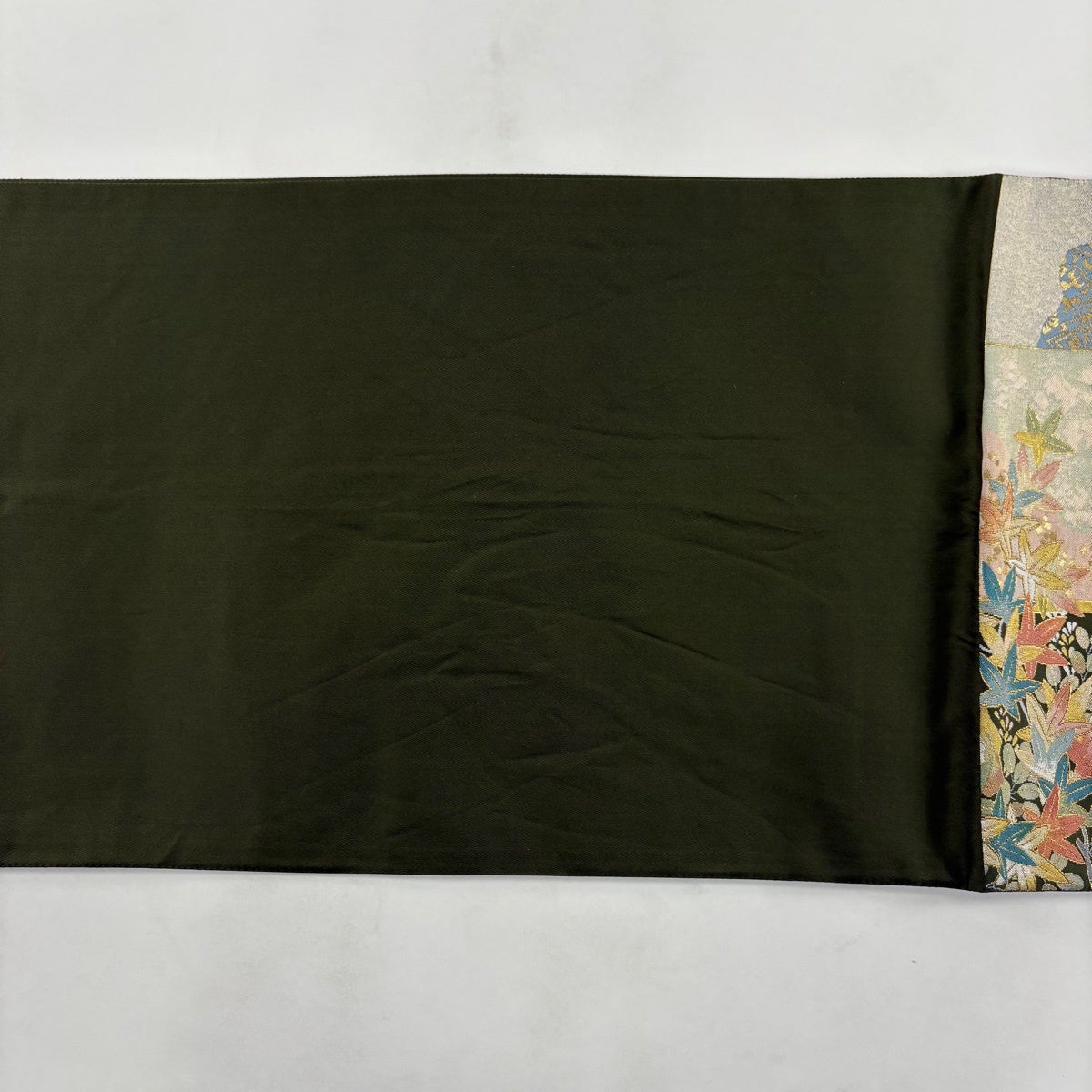 【美品】 袋帯 秀品 虹彩清遊文 紅葉 金糸 箔 灰緑 六通 正絹