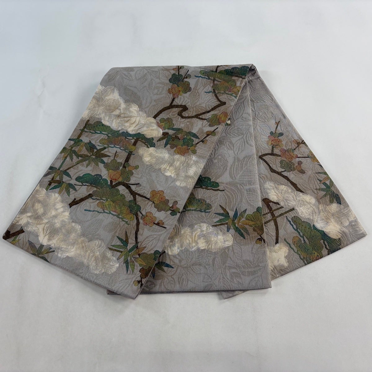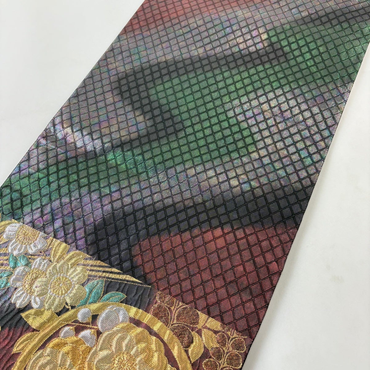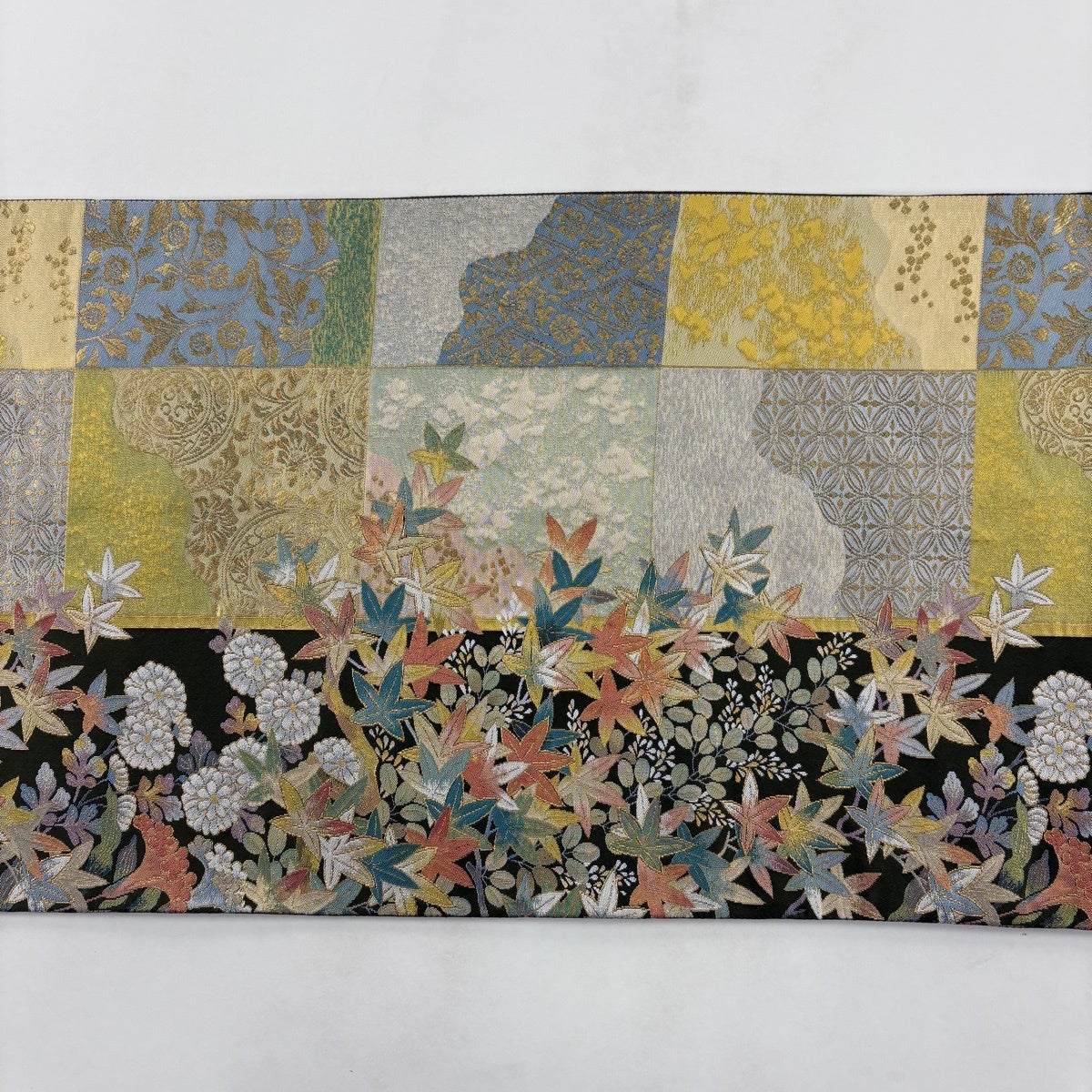 【美品】 袋帯 秀品 虹彩清遊文 紅葉 金糸 箔 灰緑 六通 正絹