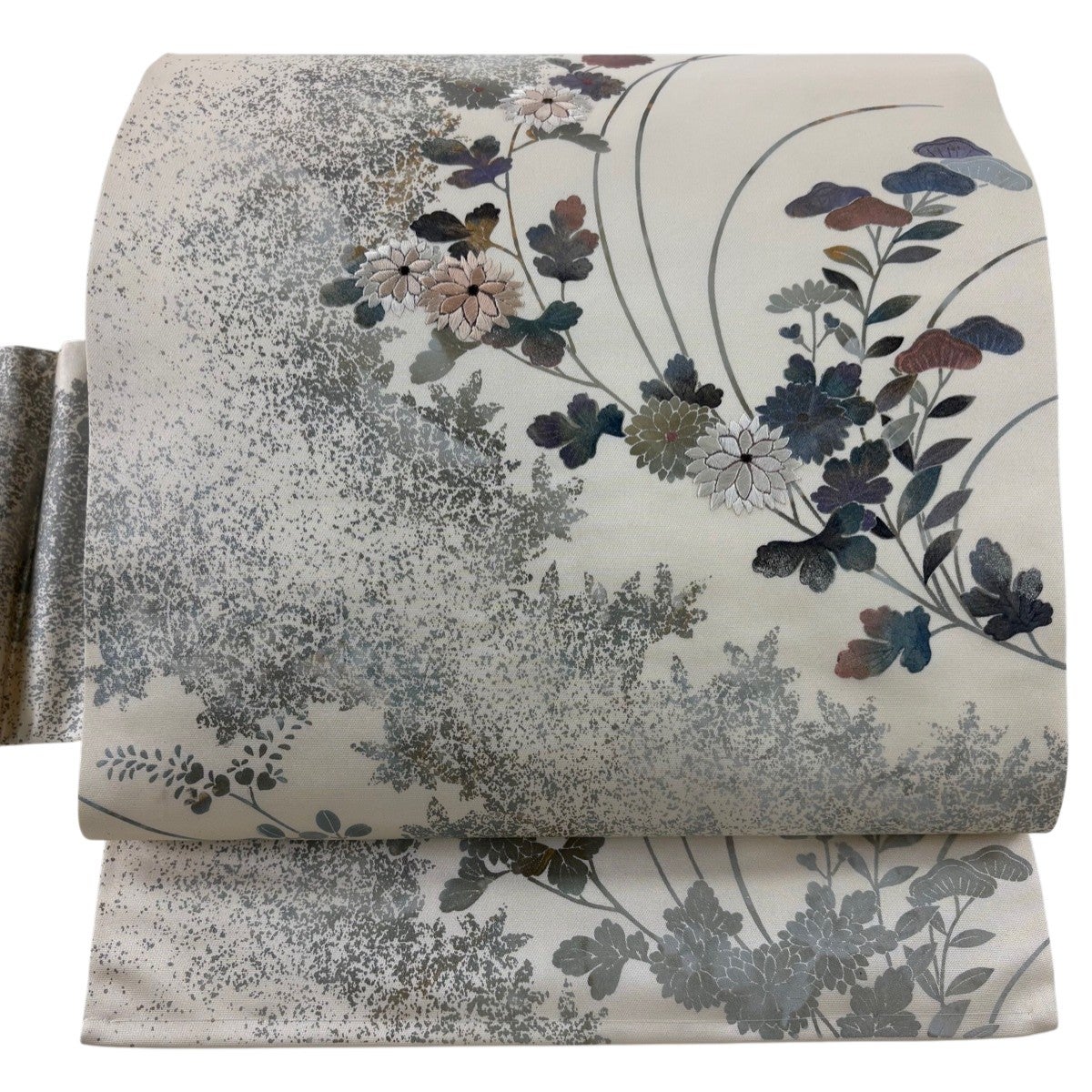 【美品】 名古屋帯 秀品 菊 女郎花 金銀彩 刺繍 クリーム 正絹