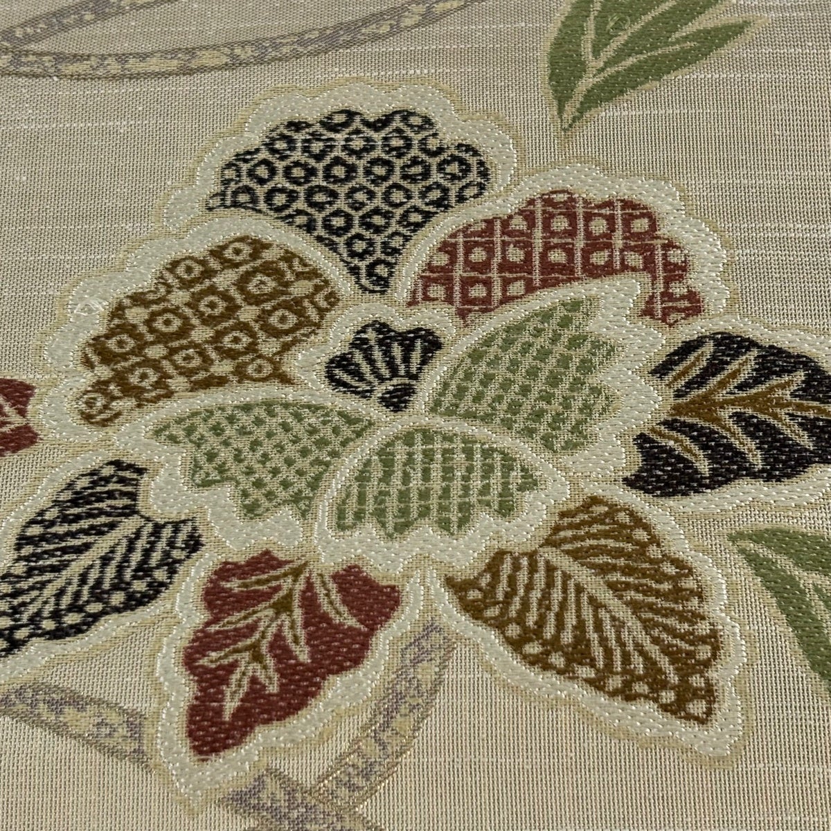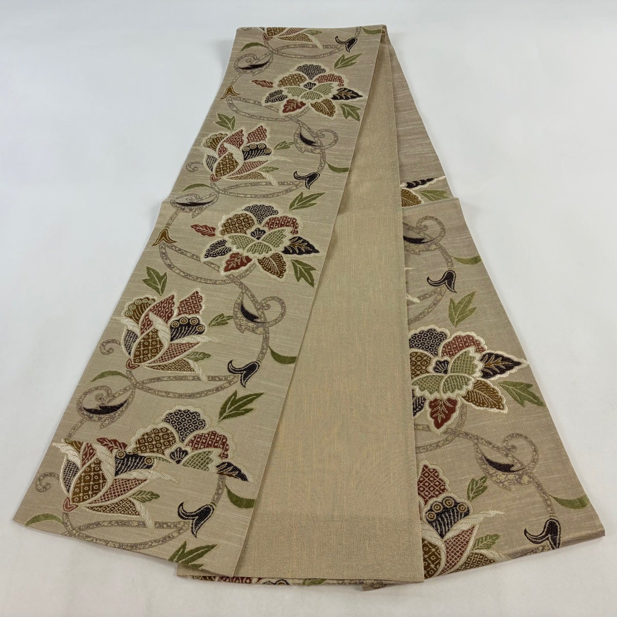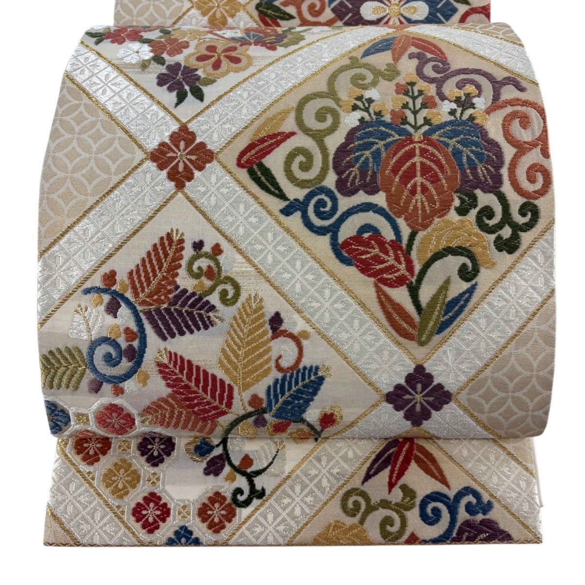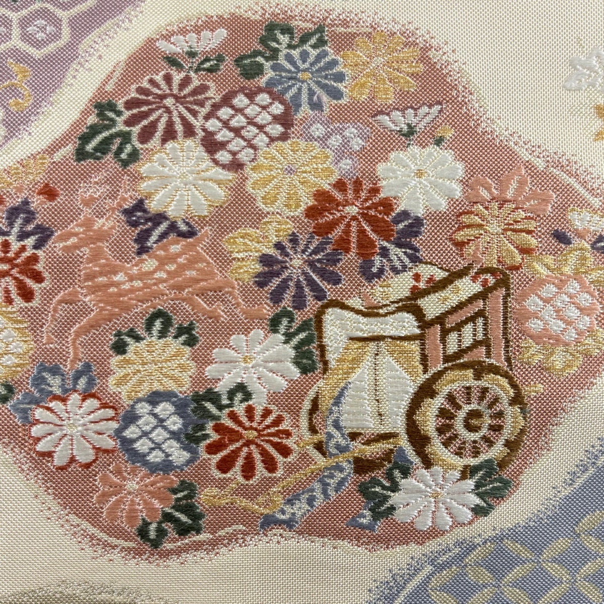 【美品】 袋帯 秀品 御所車 草花 金糸 ベージュ 六通 正絹