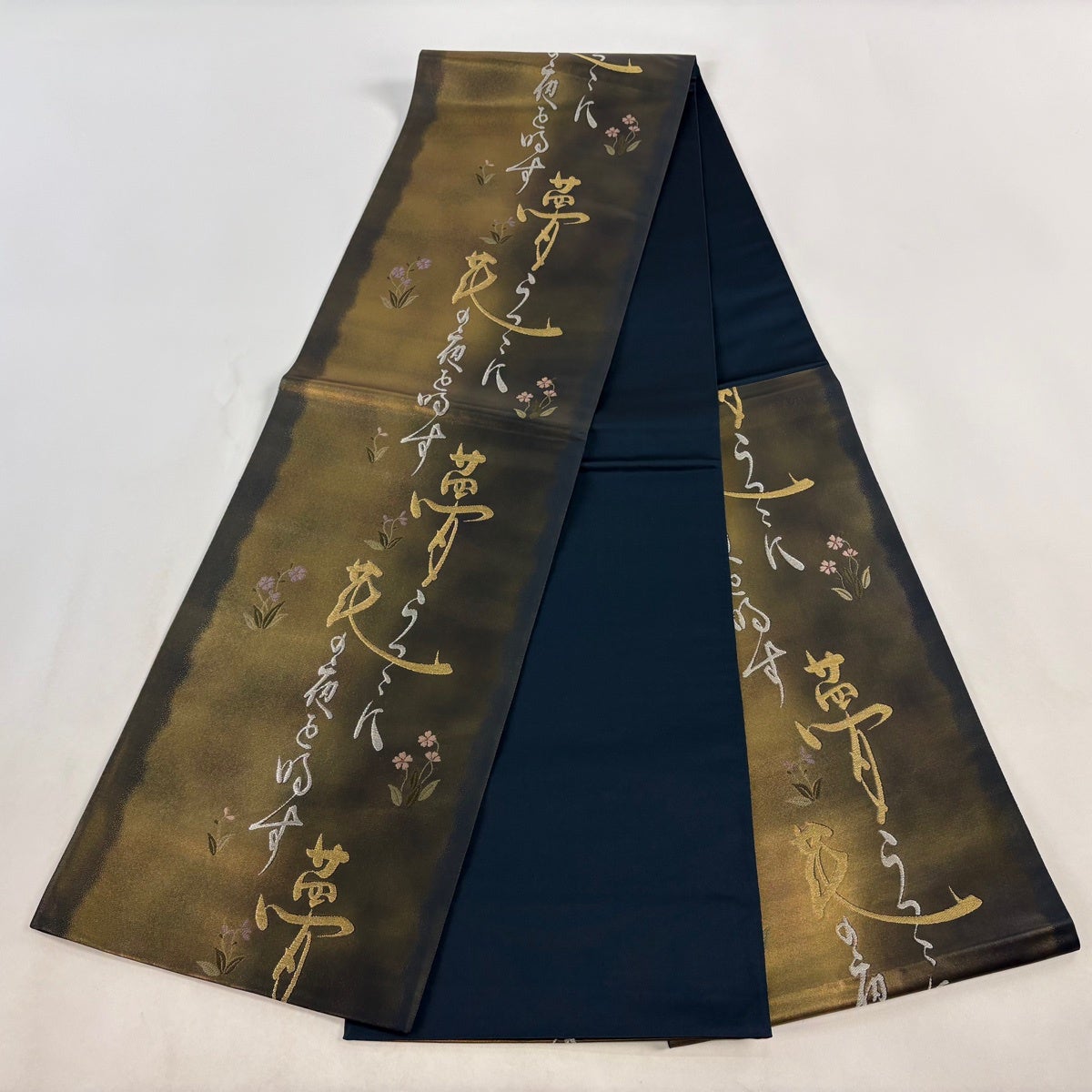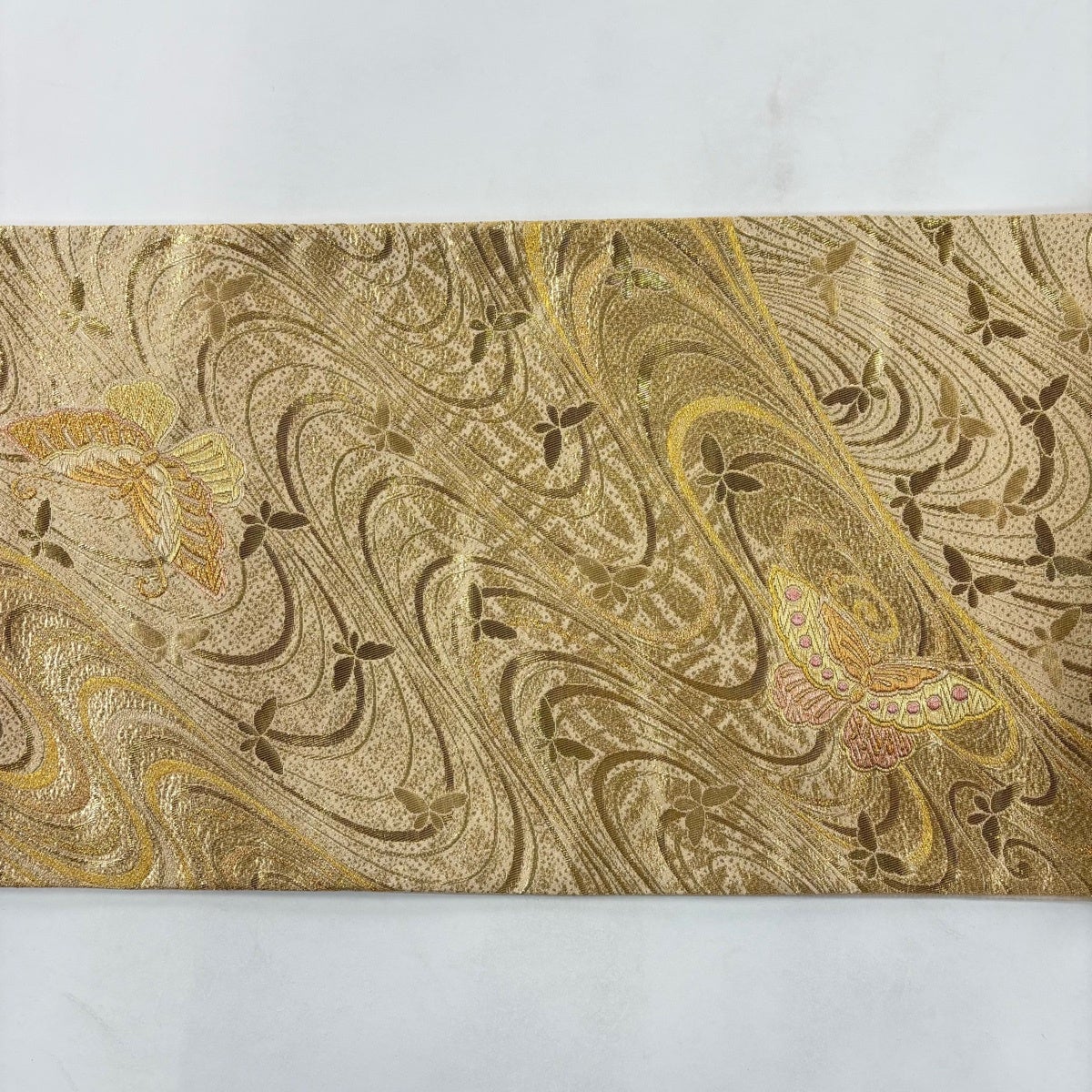 【美品】 袋帯 秀品 文字文 草花 金銀糸 箔 金色 お太鼓柄 正絹