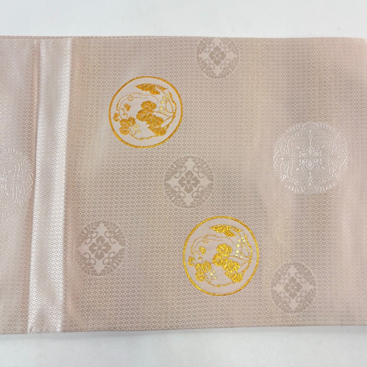 【美品】袋帯 秀品 丸文 葉と実 金糸 薄ピンク お太鼓柄 正絹