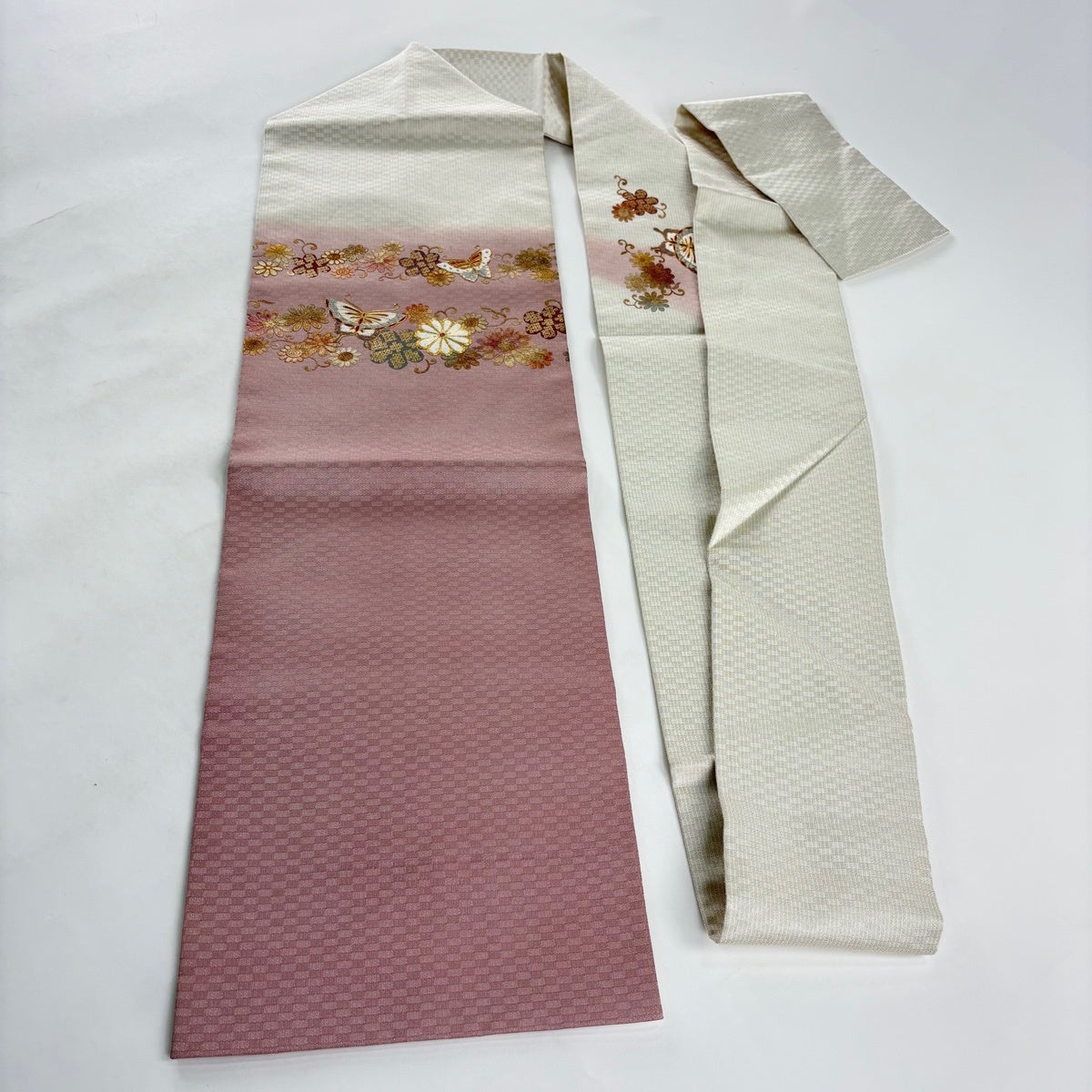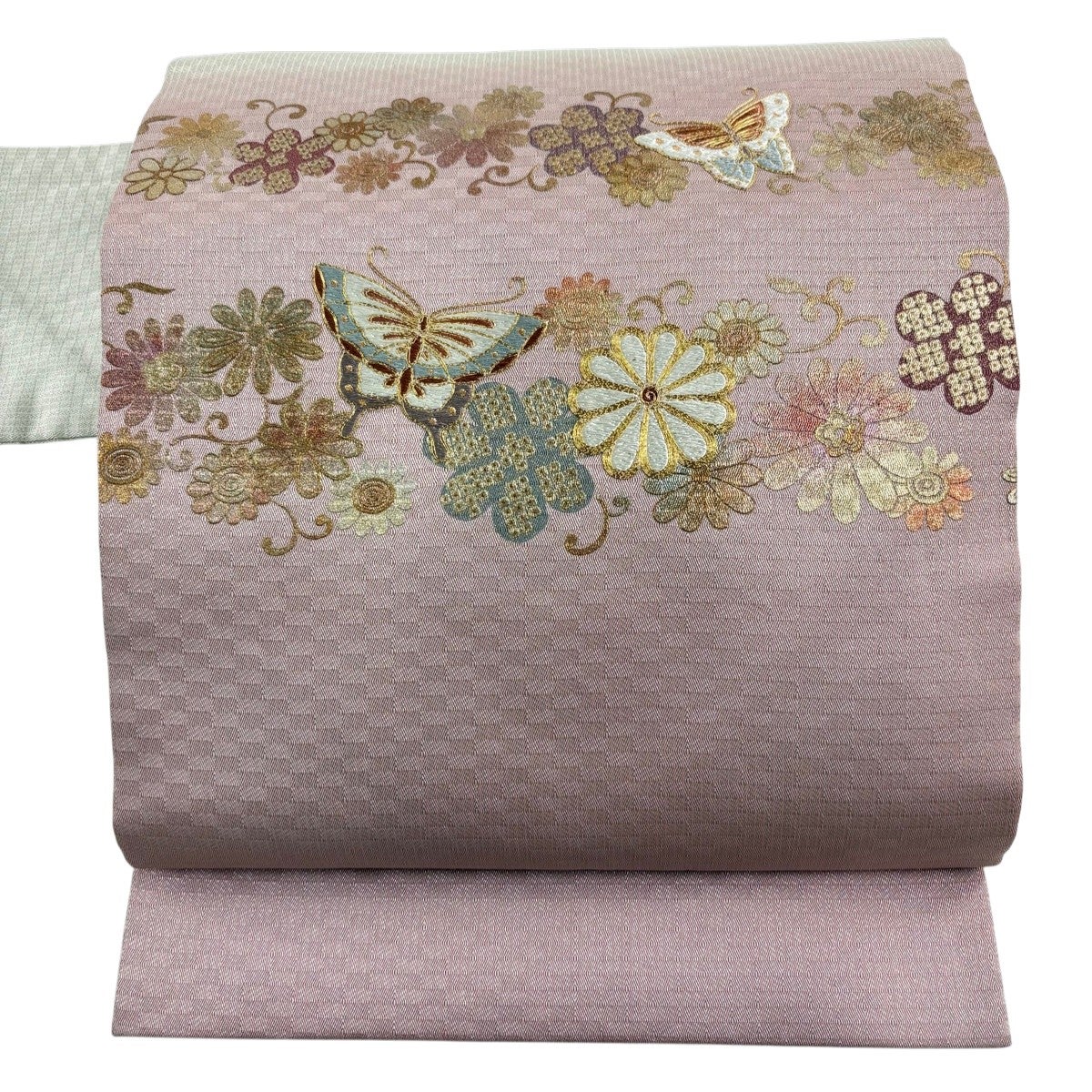 【美品】 名古屋帯 秀品 花唐草 蝶 銀通し 金糸 ピンク 正絹