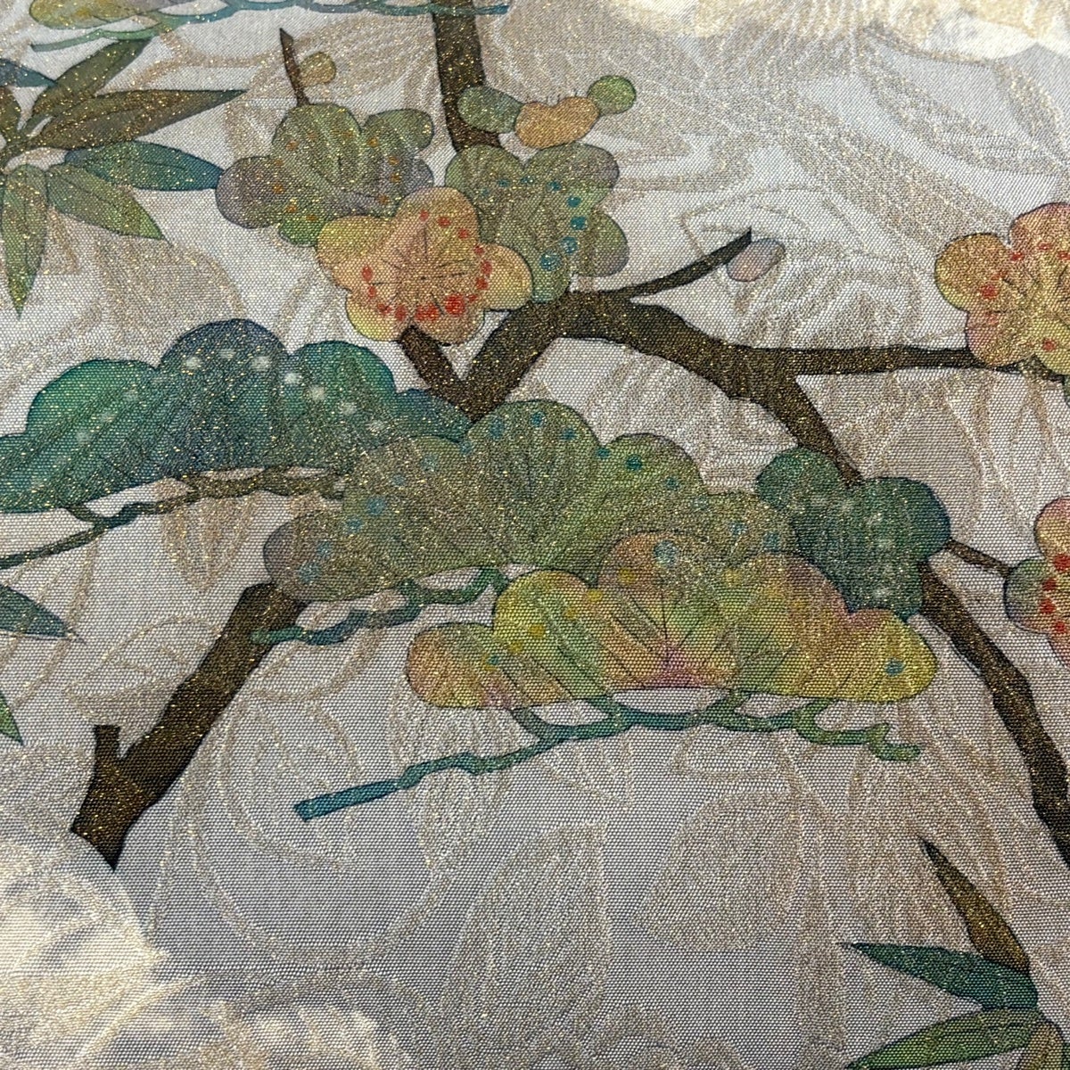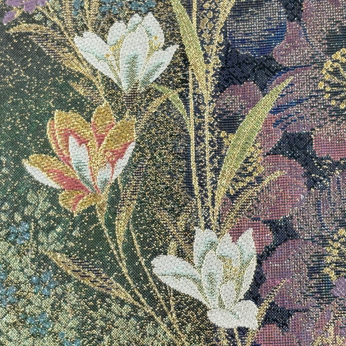 【美品】 袋帯 秀品 鈴乃屋 草花 鳥 金糸 箔 灰緑 六通 正絹