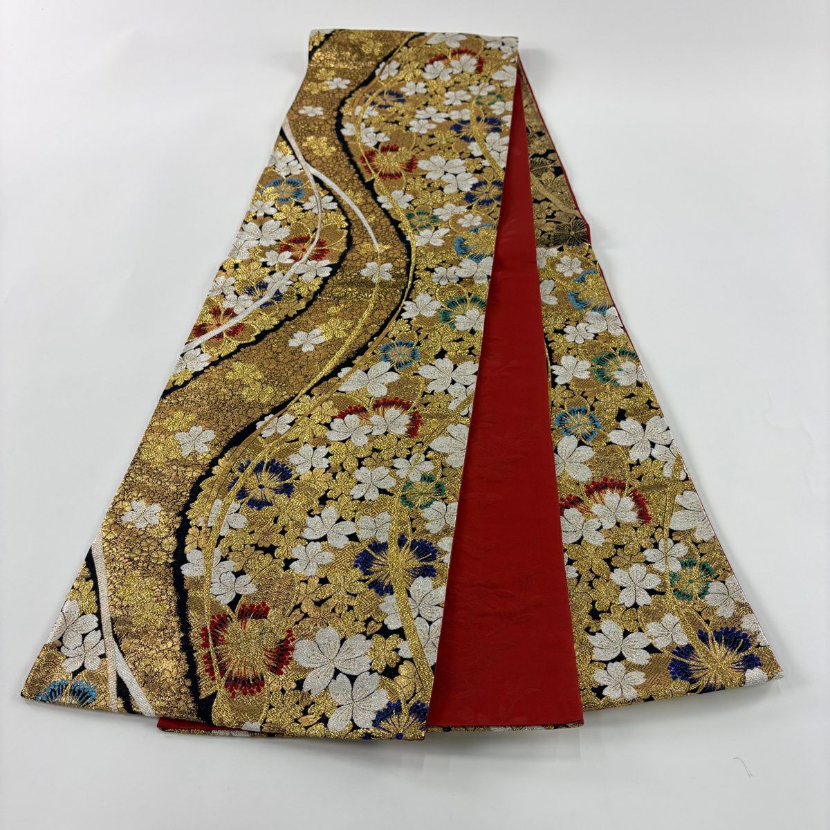 【美品】 袋帯 秀品 桜の花びら 流水 金糸 箔 茜色 六通 正絹