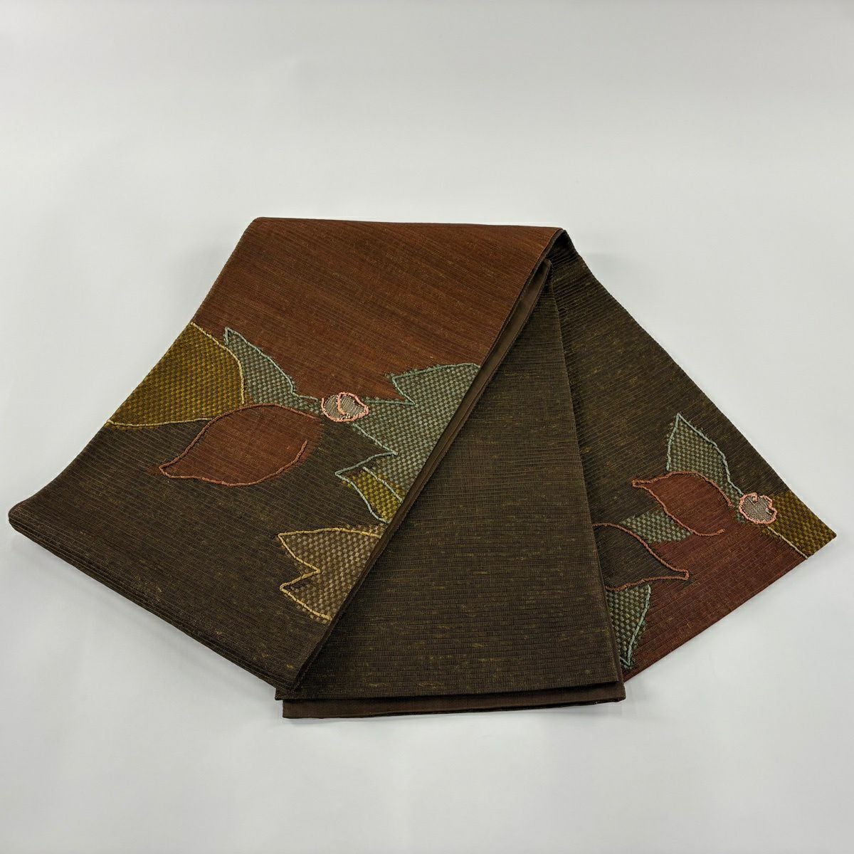 【美品】 袋帯 秀品 草花 幾何学模様 金糸 箔 茶色 六通 正絹