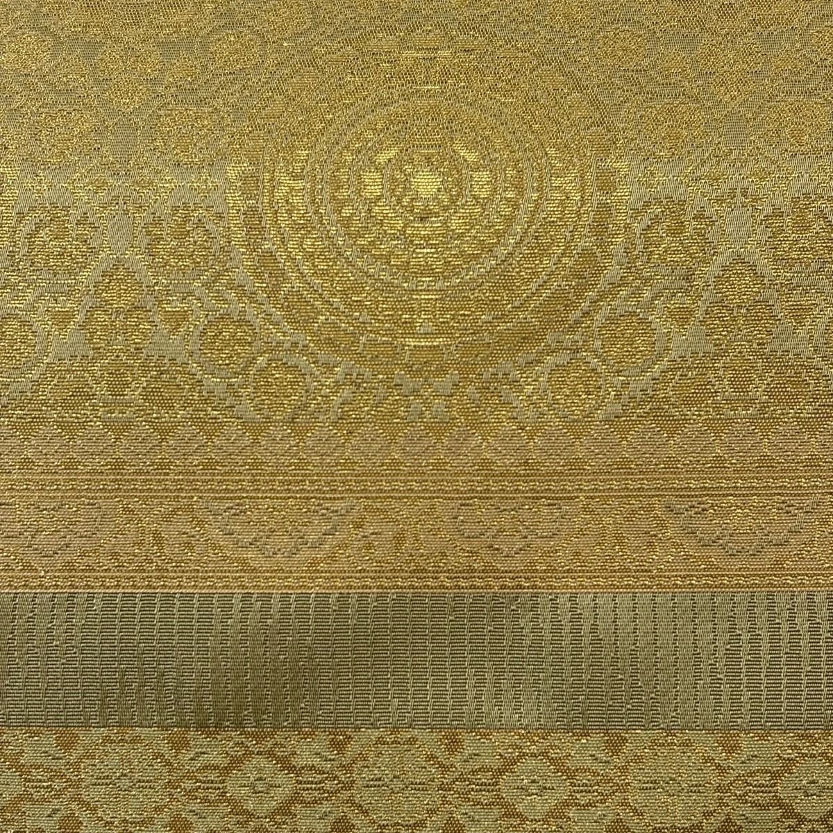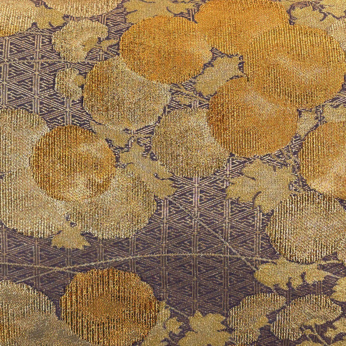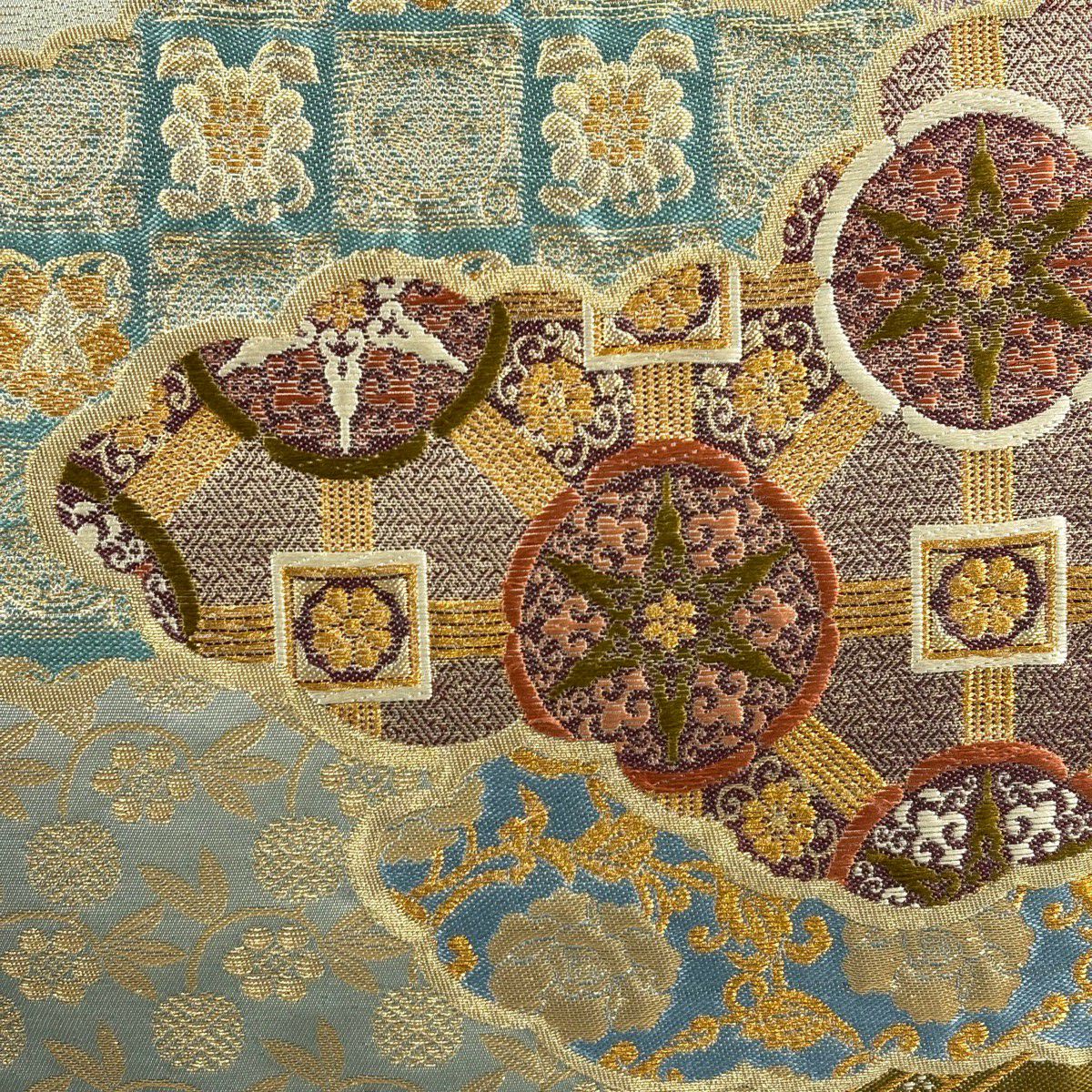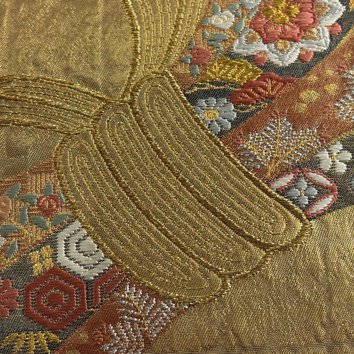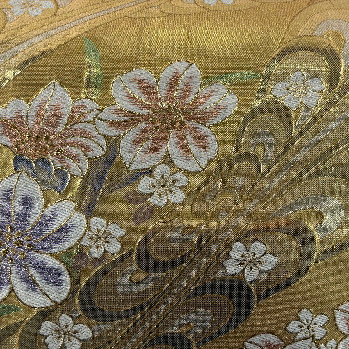 【美品】 袋帯 秀品 草花 幾何学模様 刺繍 箔 金色 六通 正絹