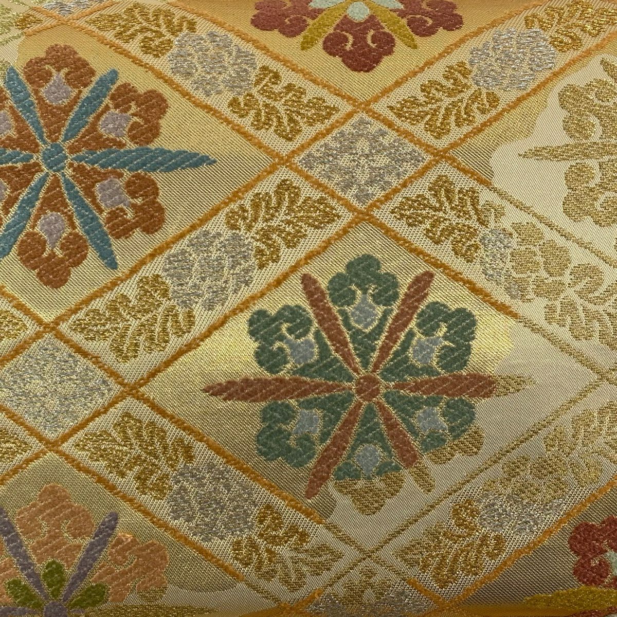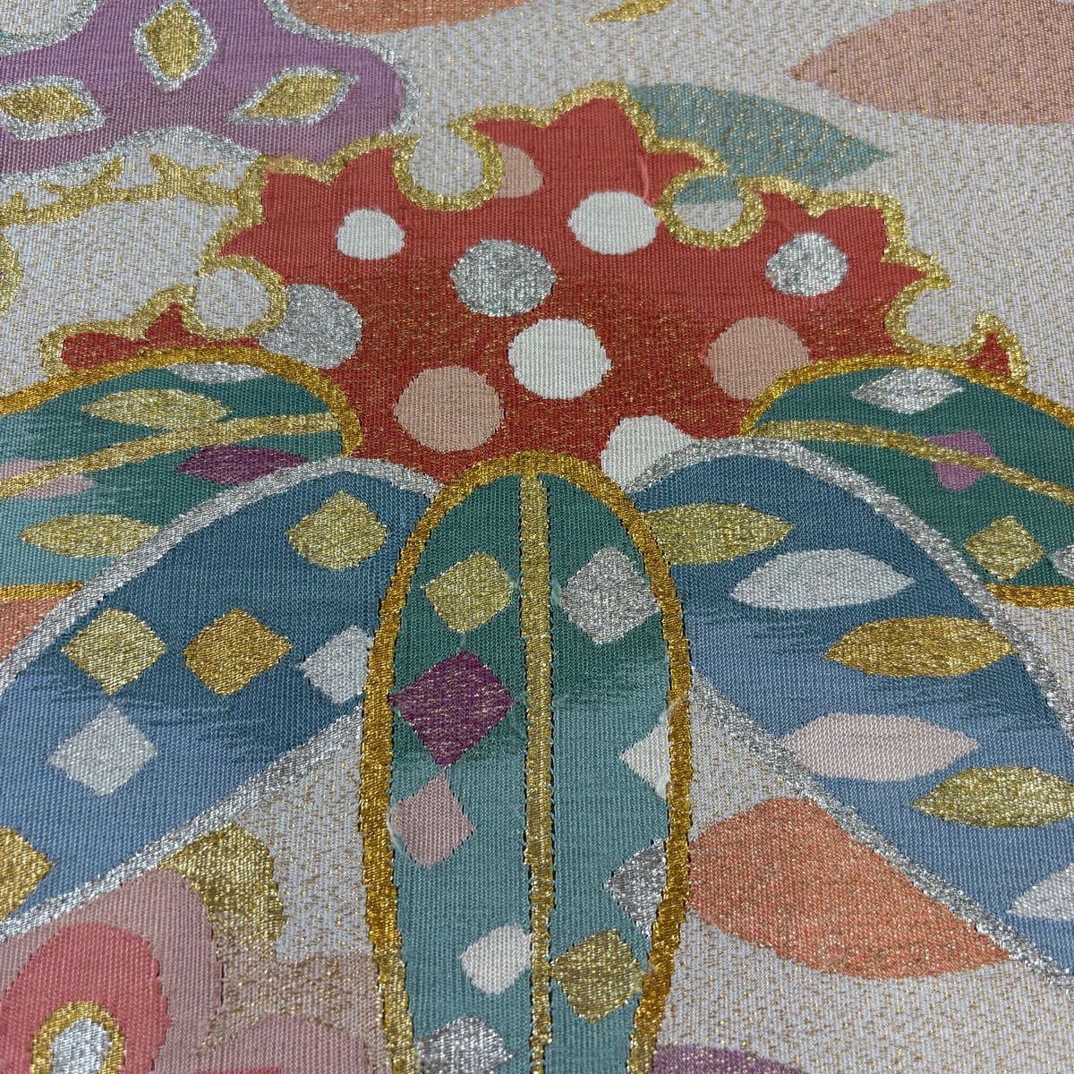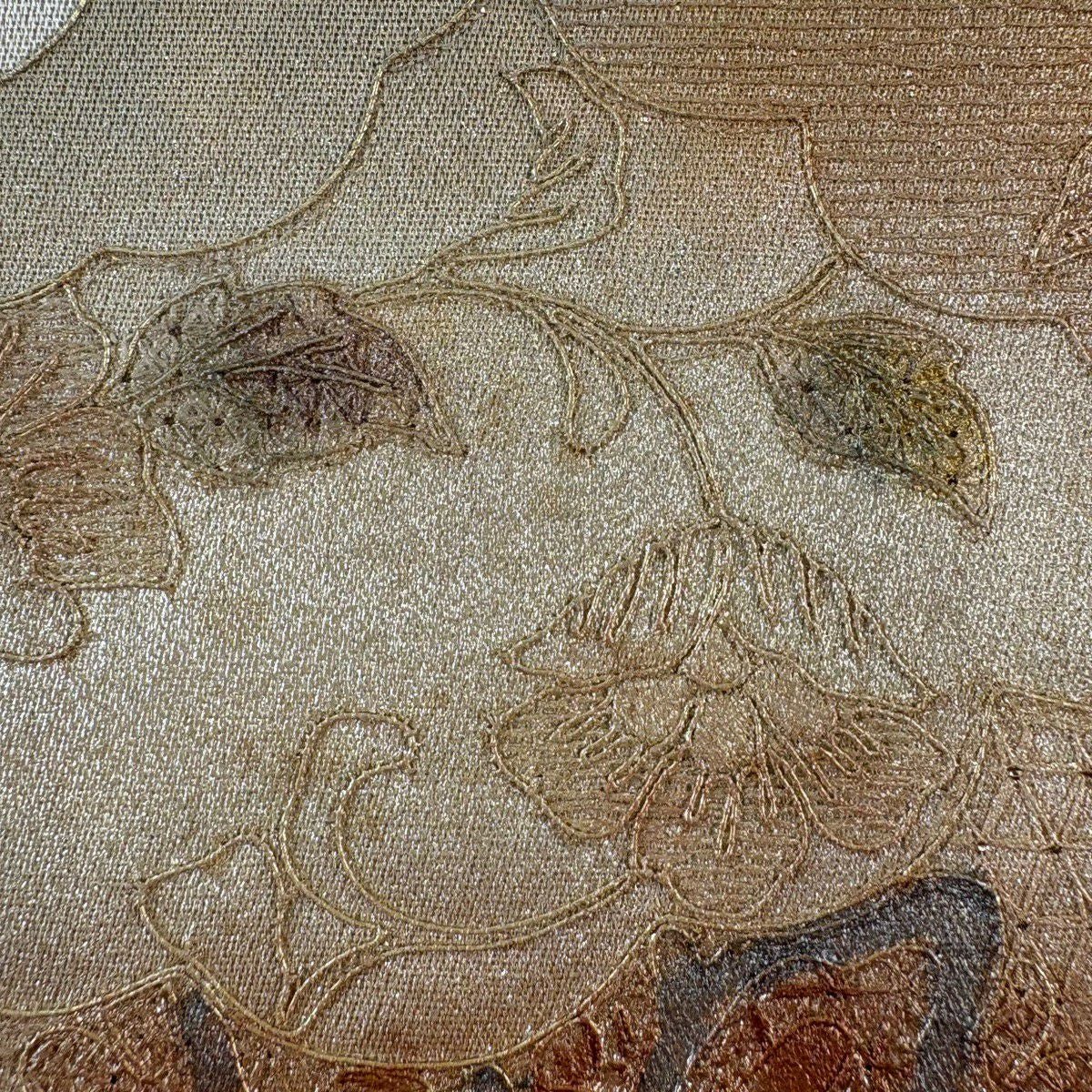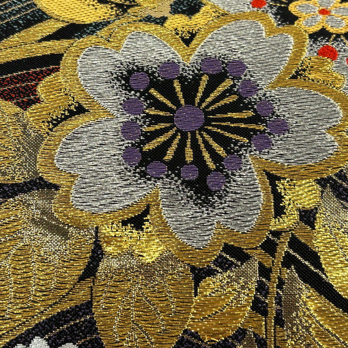 【美品】 袋帯 秀品 草花 幾何学模様 刺繍 箔 金色 六通 正絹