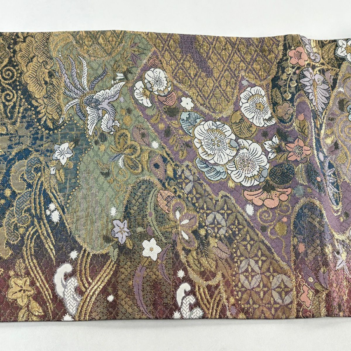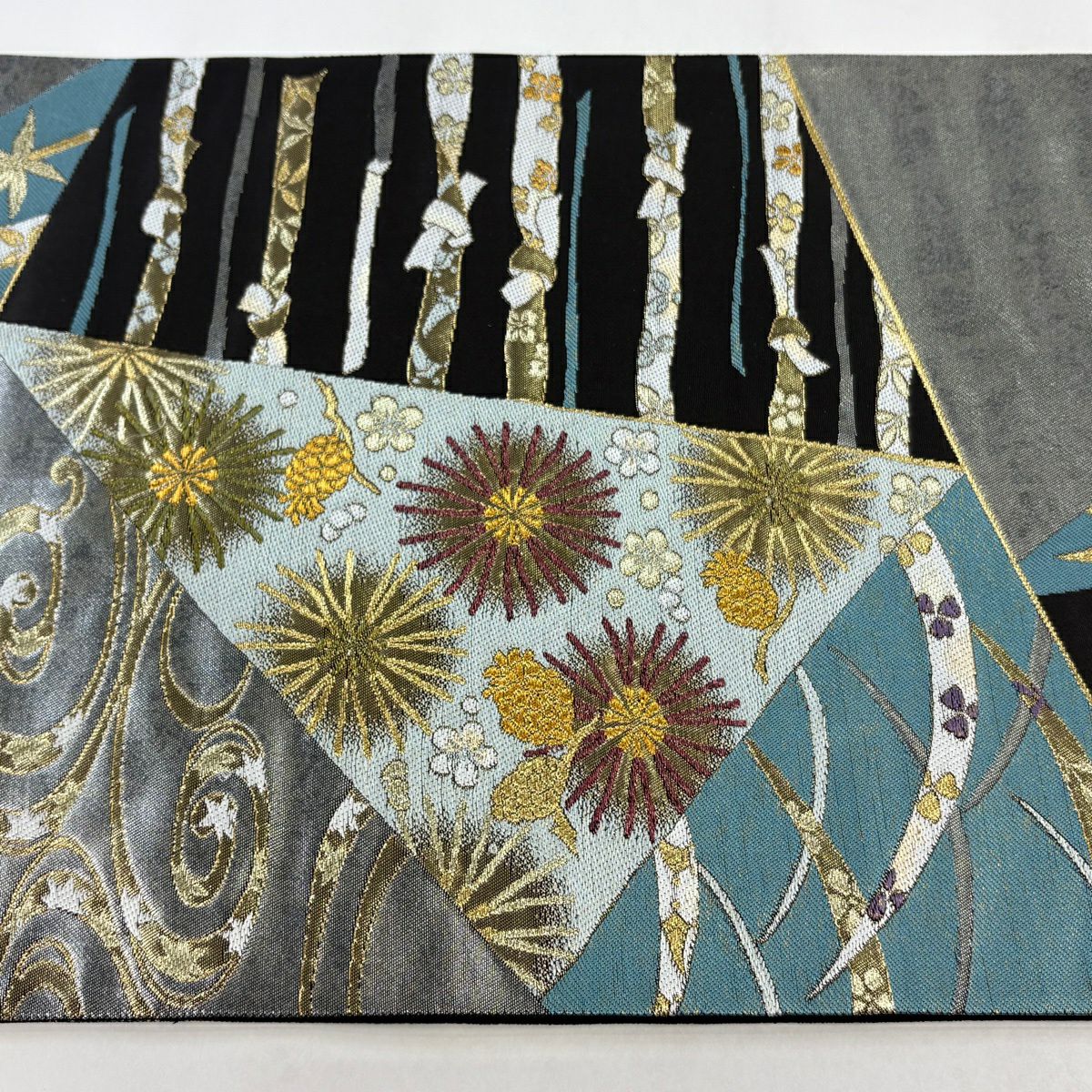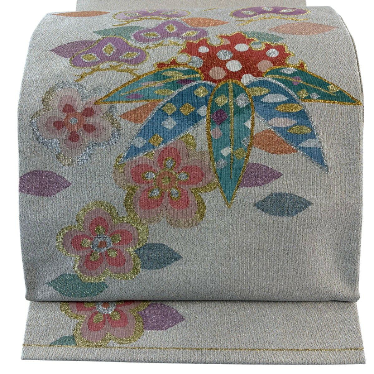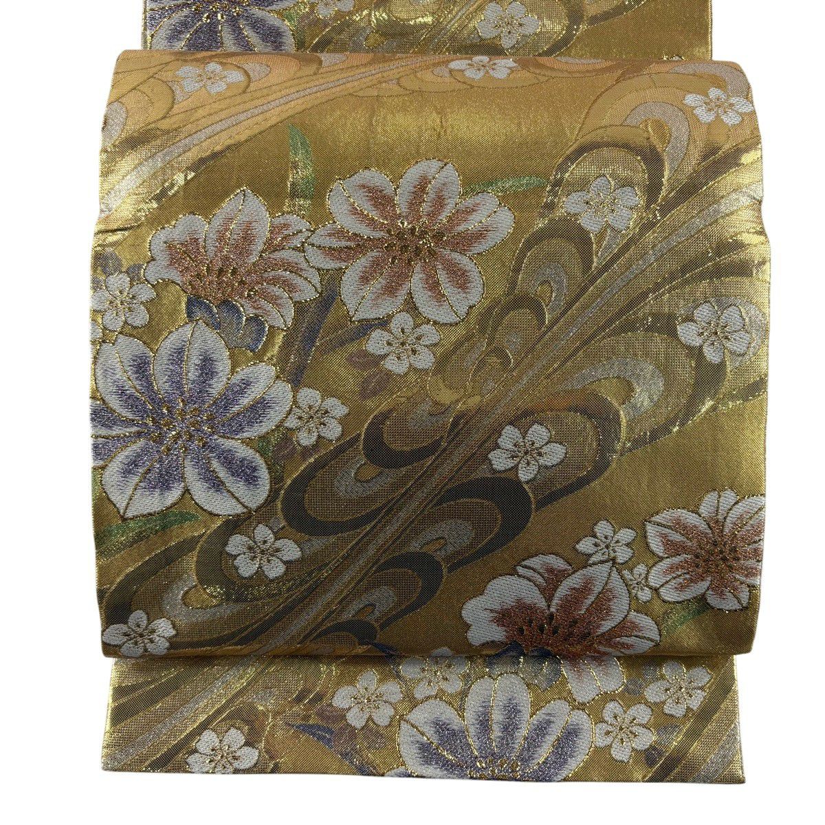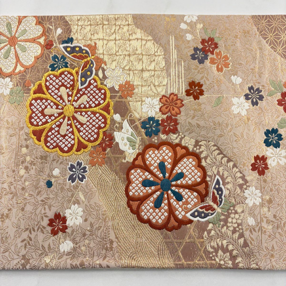 【美品】 袋帯 秀品 草花 幾何学模様 刺繍 箔 金色 六通 正絹