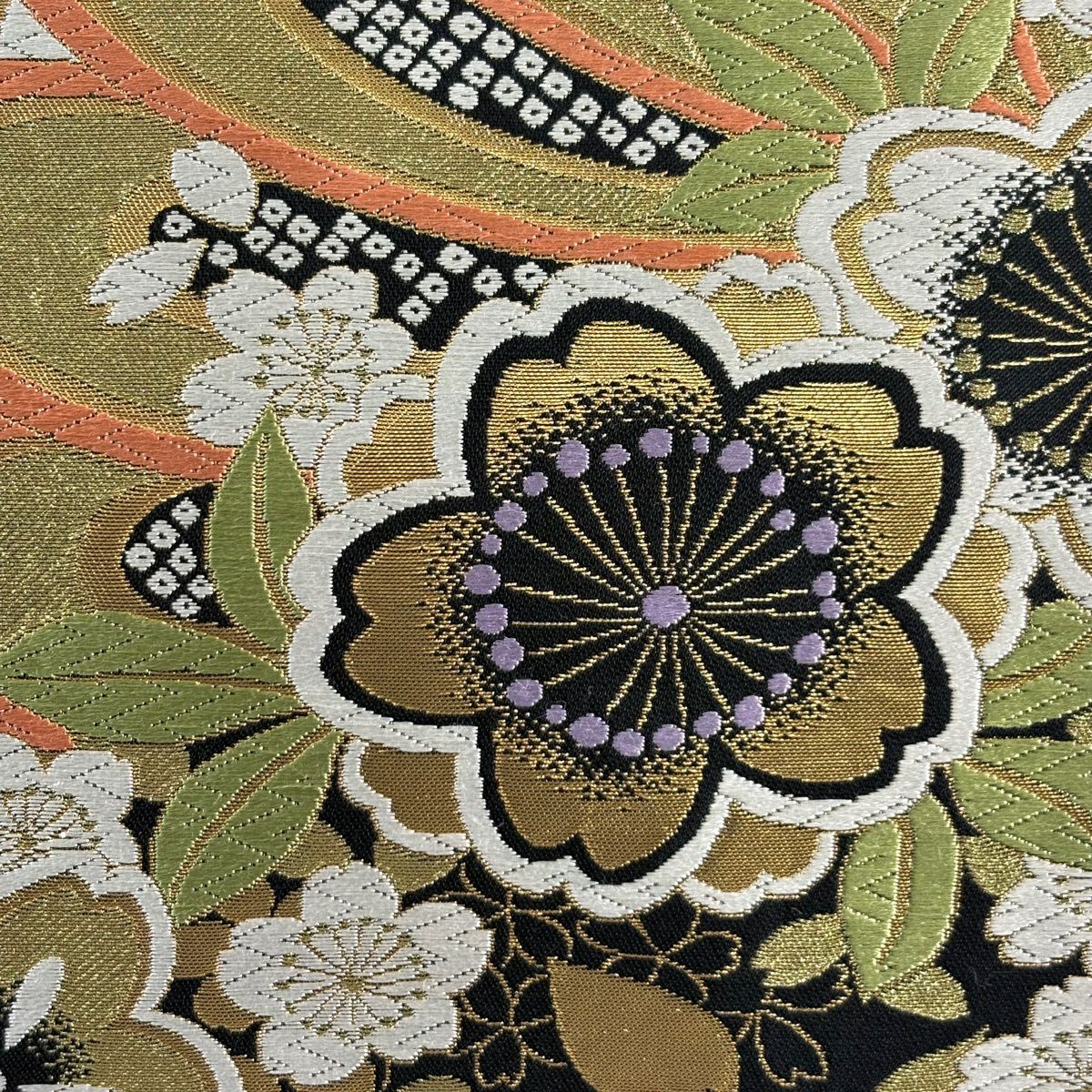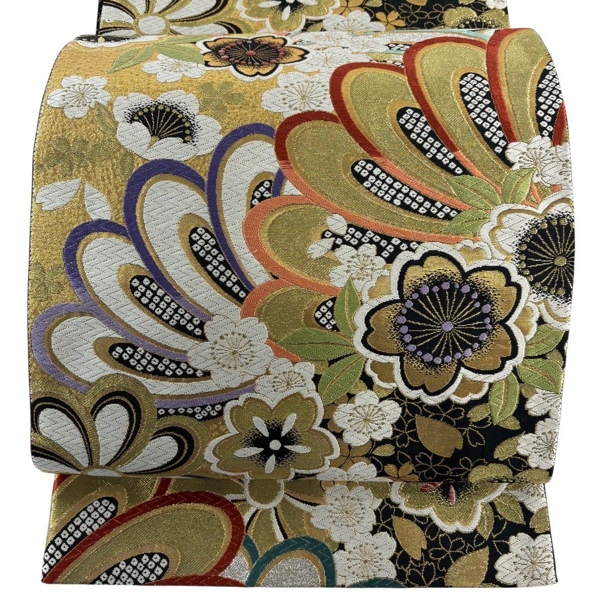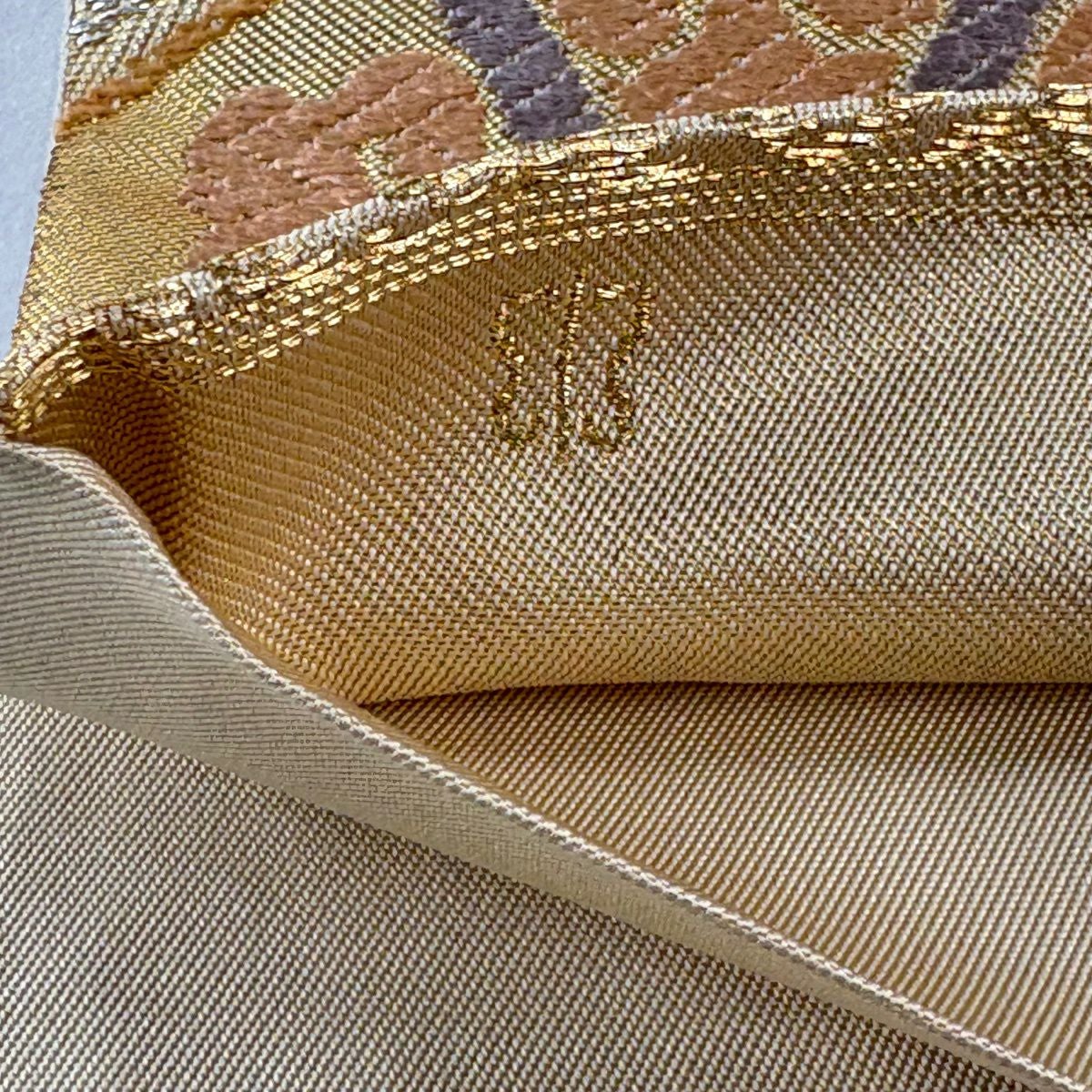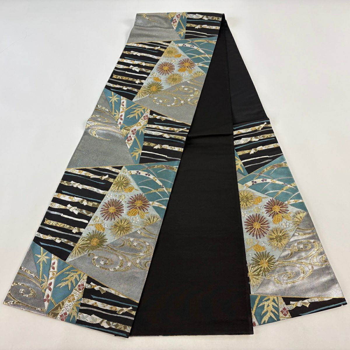 【美品】 袋帯 秀品 草花 幾何学模様 刺繍 箔 金色 六通 正絹
