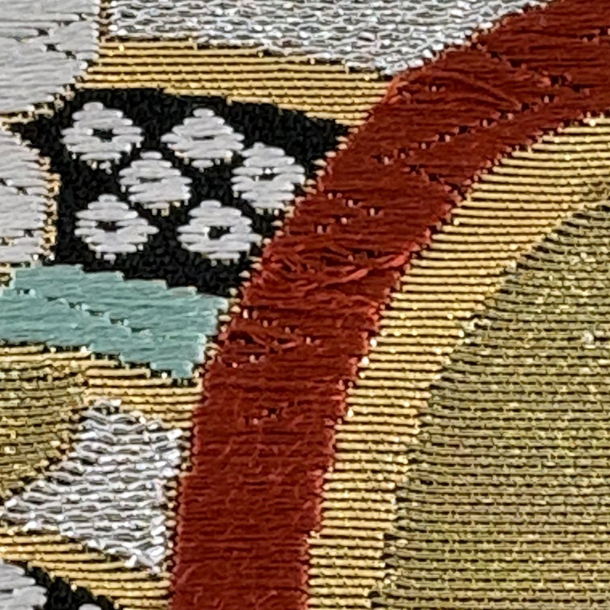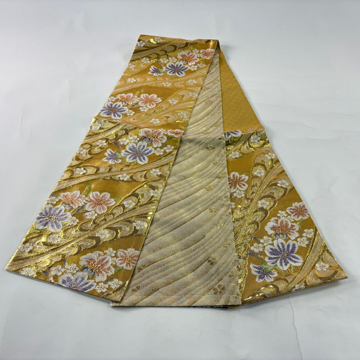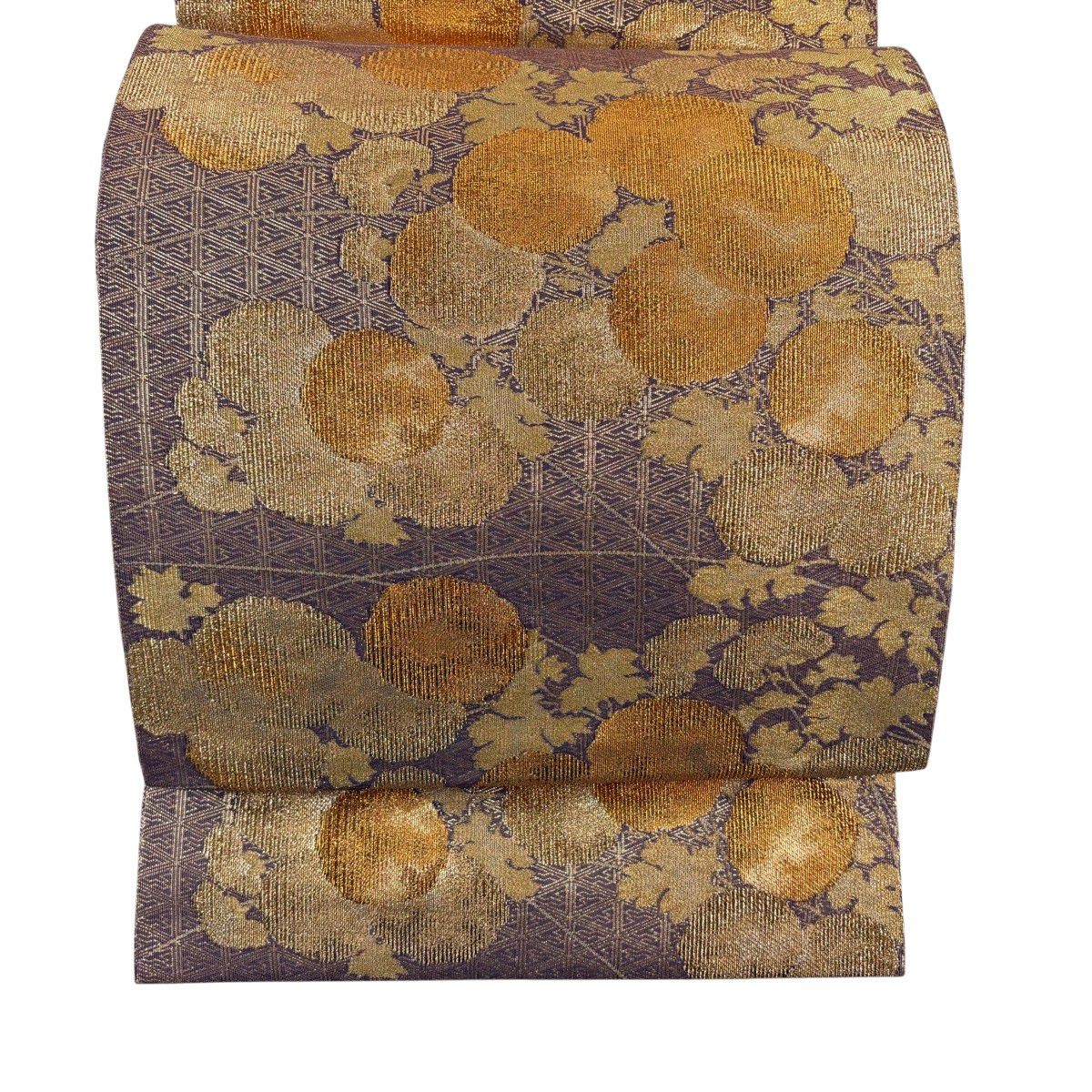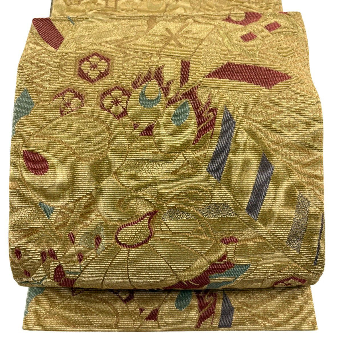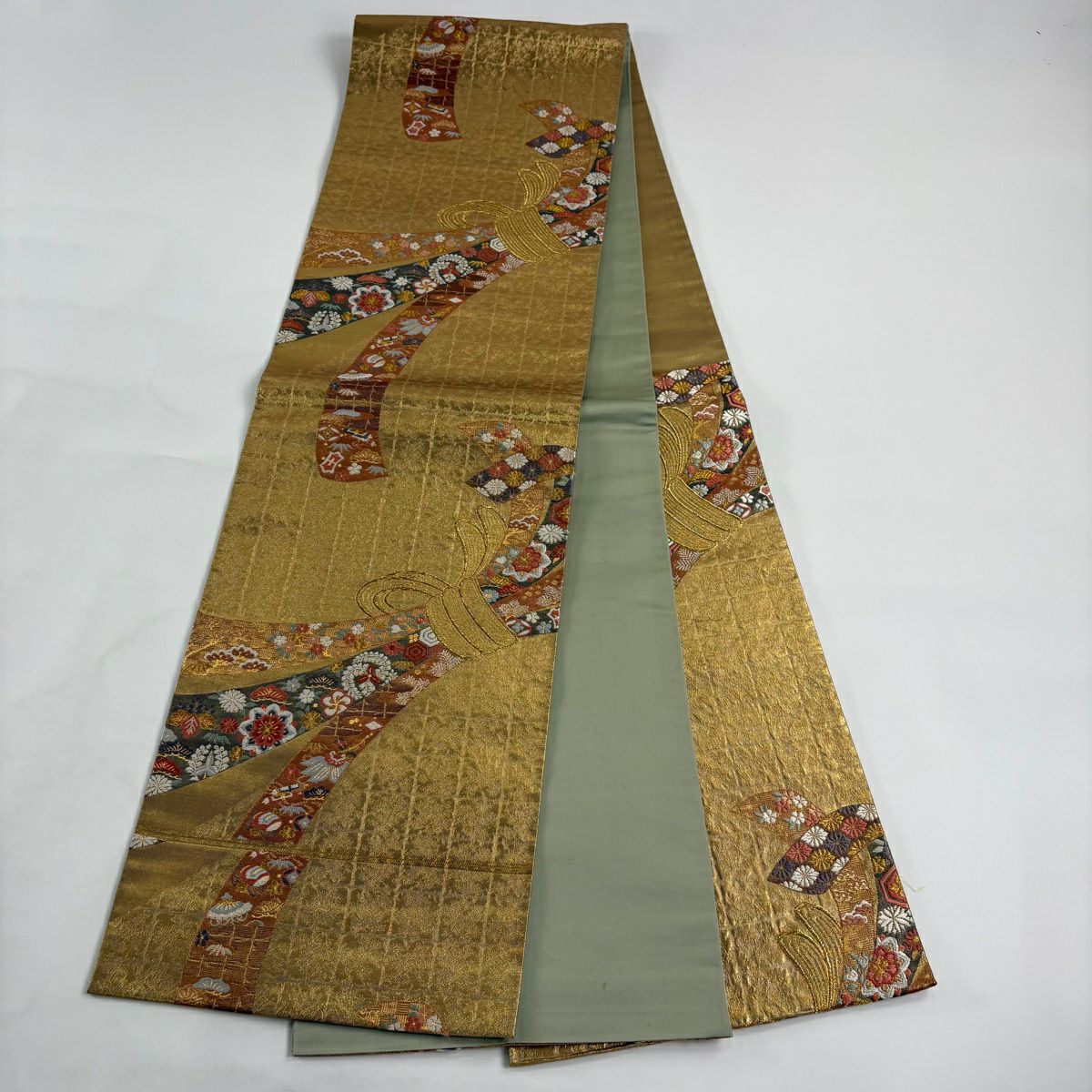 【美品】 袋帯 秀品 草花 幾何学模様 刺繍 箔 金色 六通 正絹