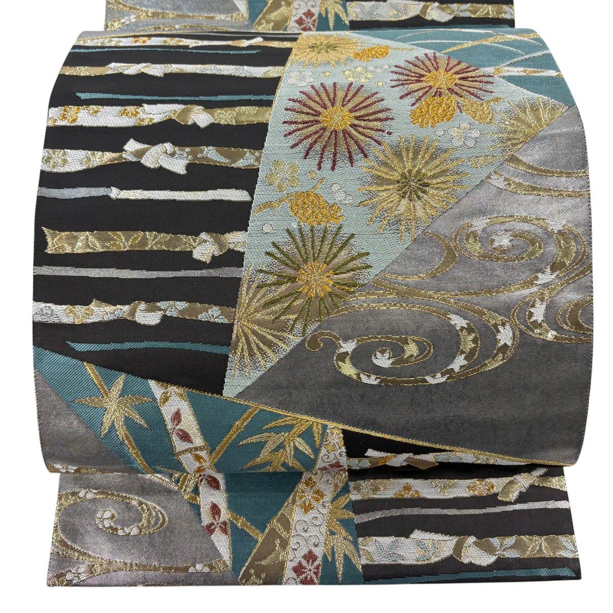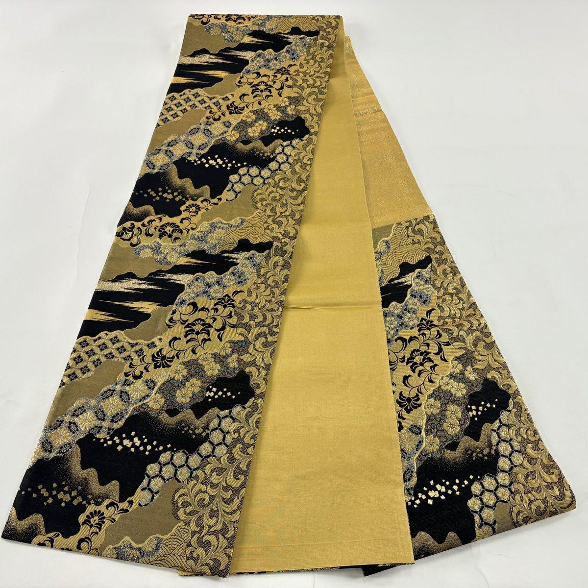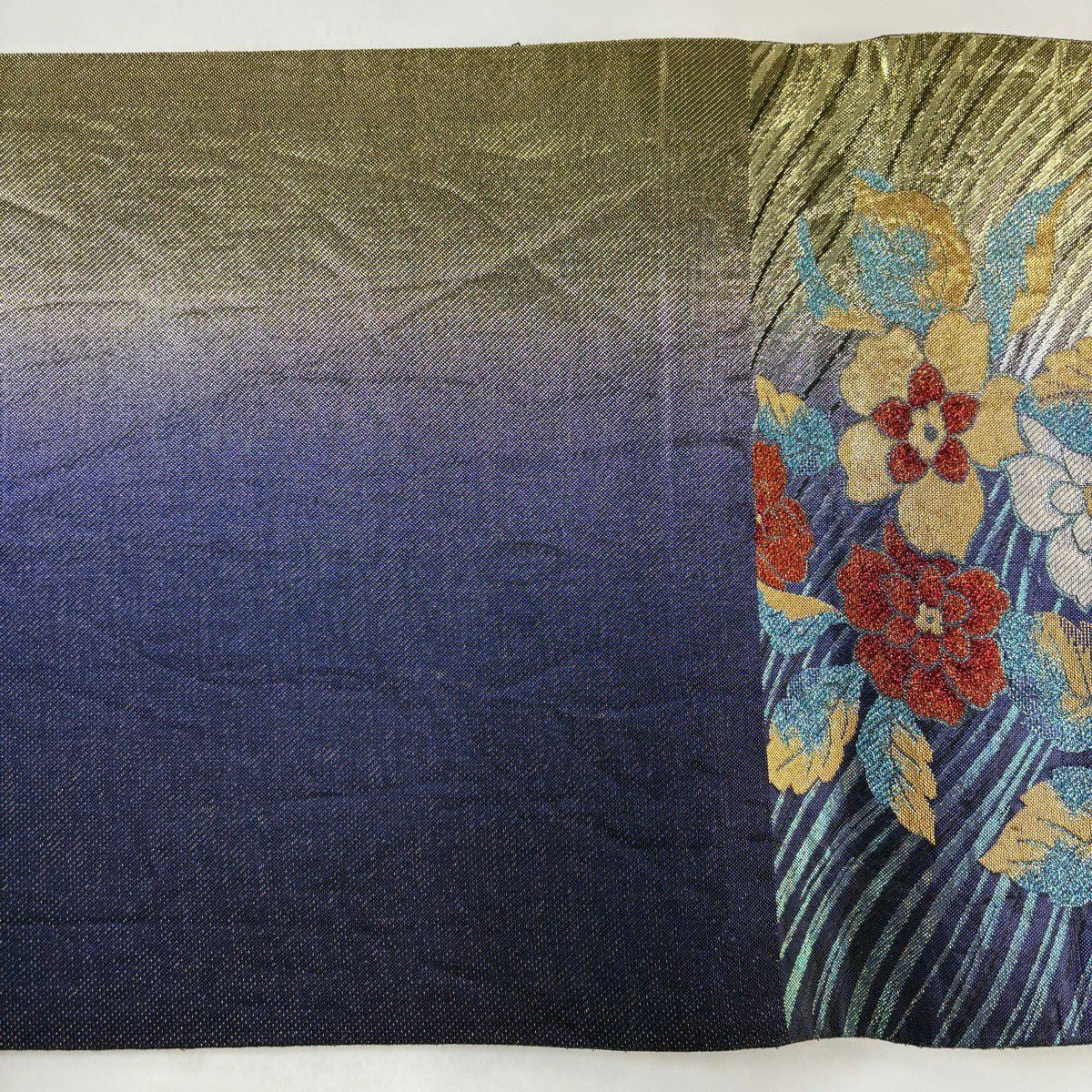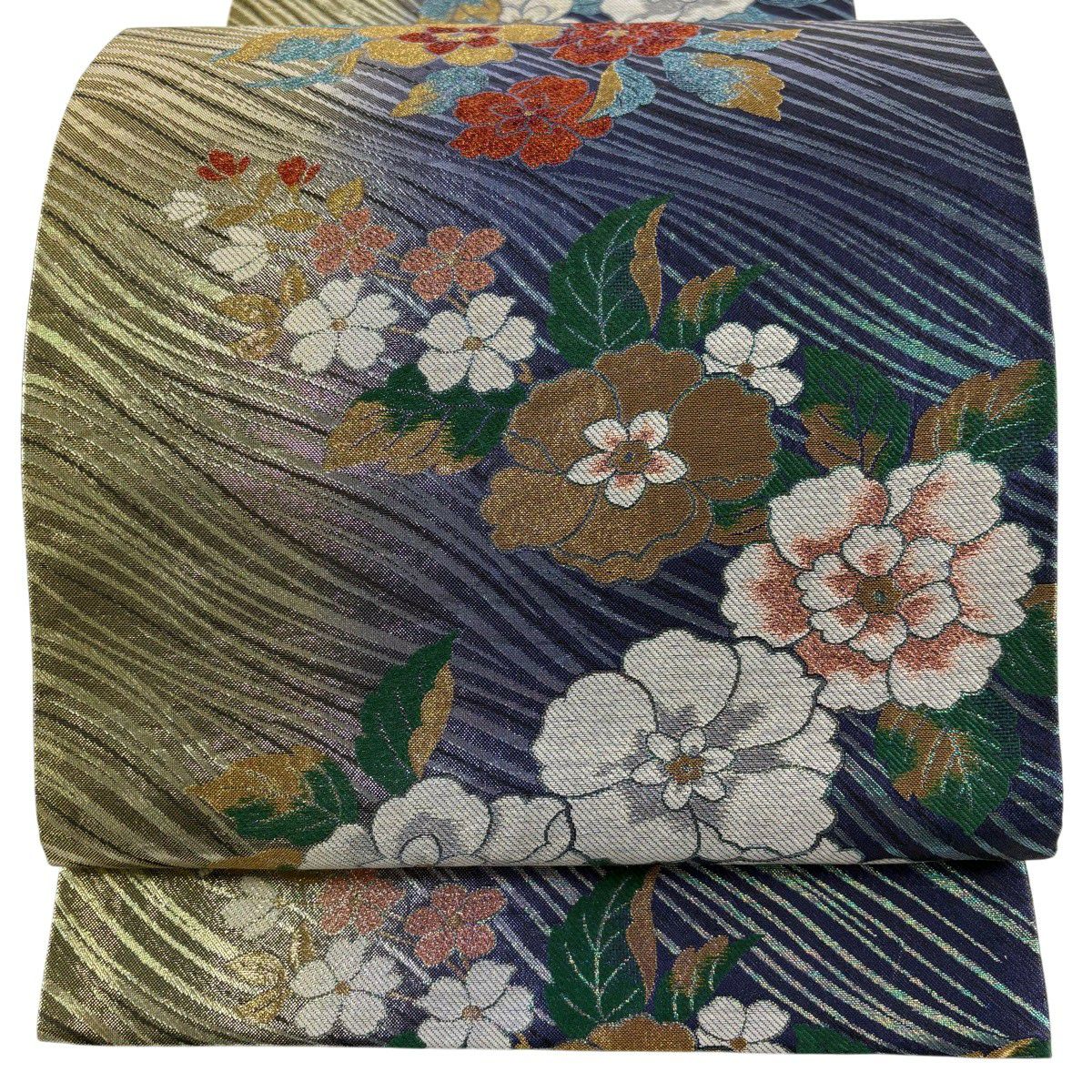 【美品】 袋帯 秀品 草花 幾何学模様 刺繍 箔 金色 六通 正絹