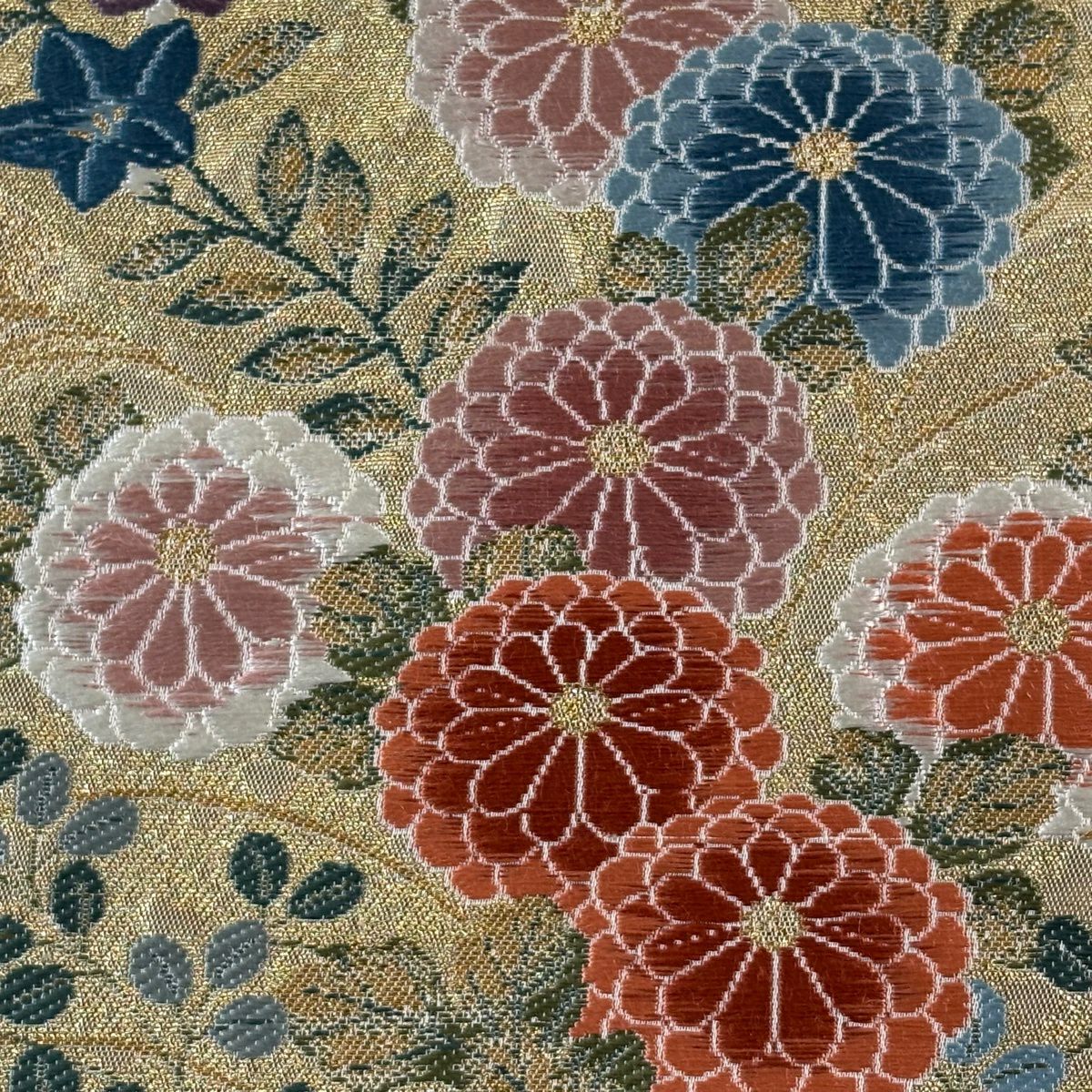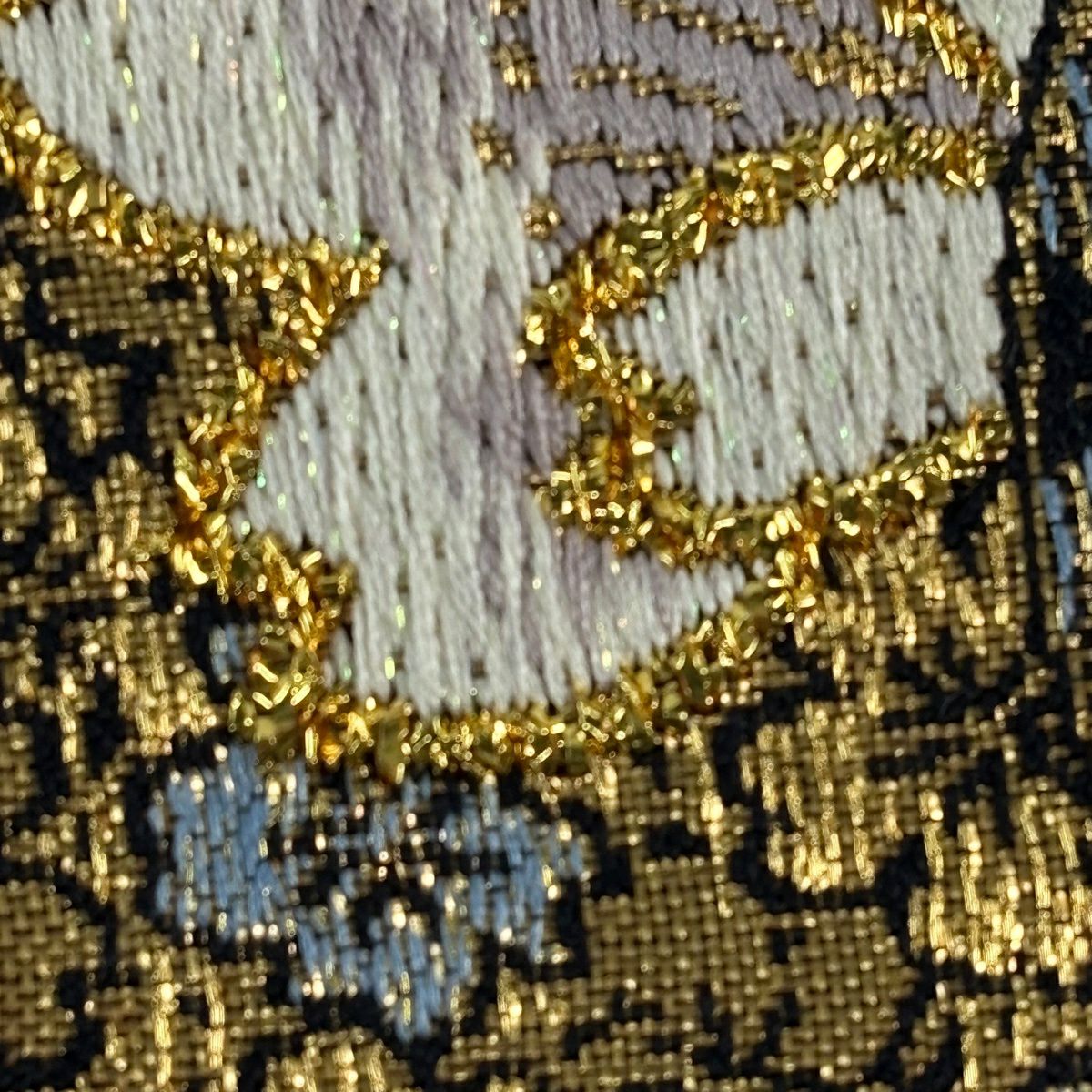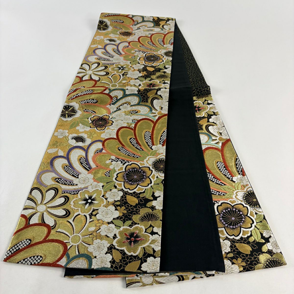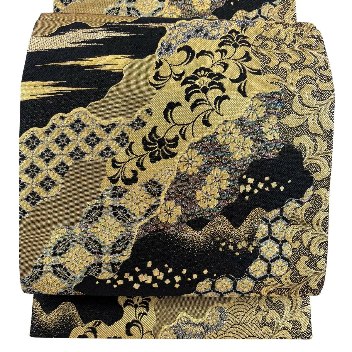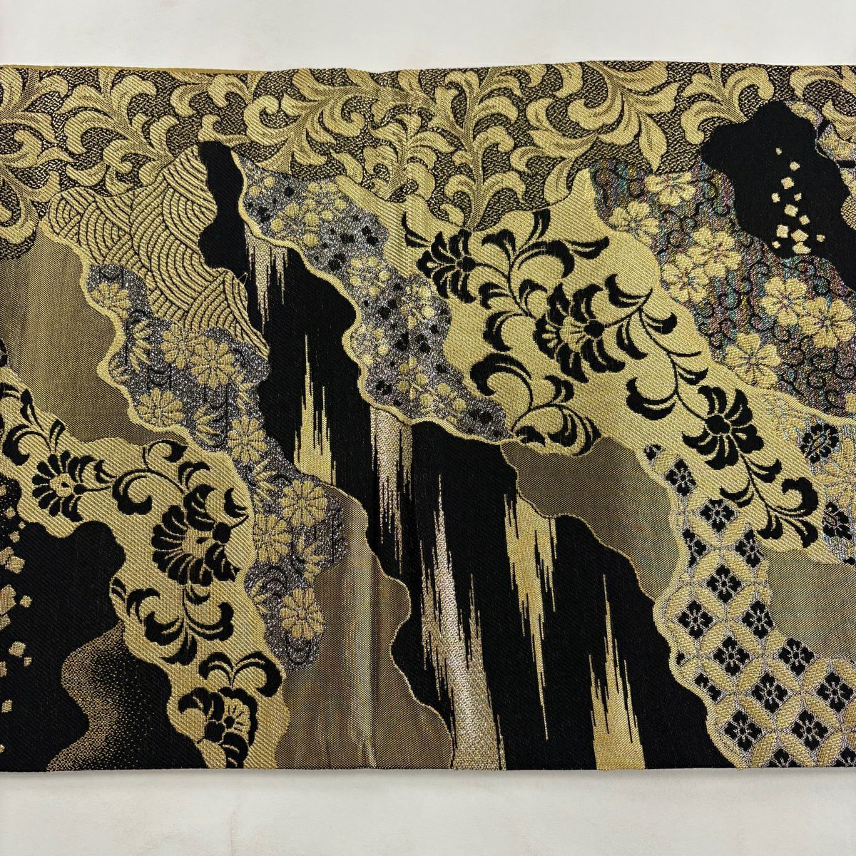 【美品】 袋帯 秀品 草花 幾何学模様 刺繍 箔 金色 六通 正絹