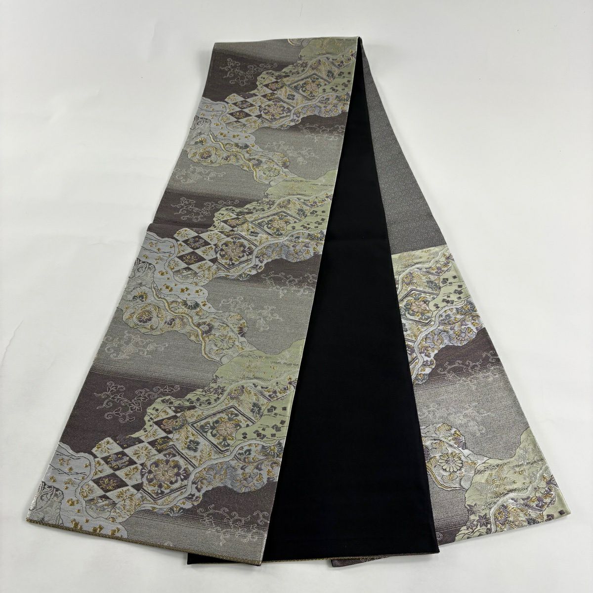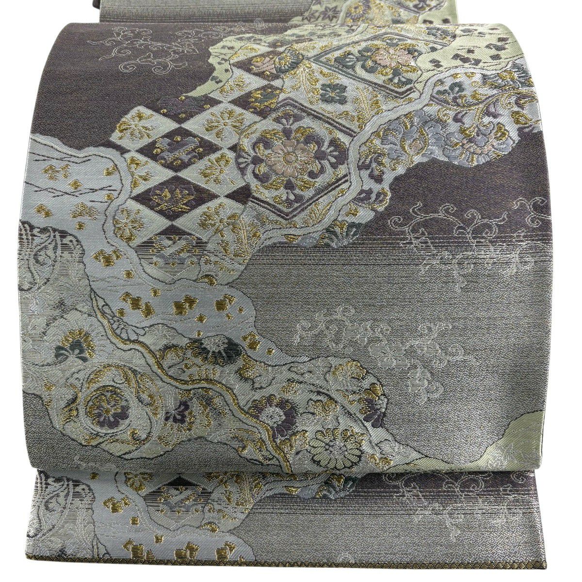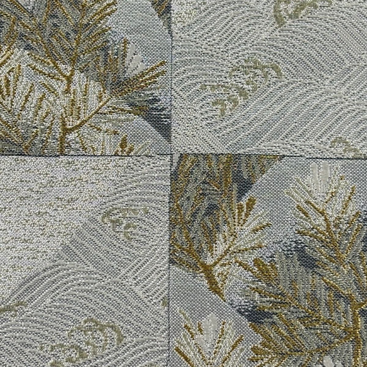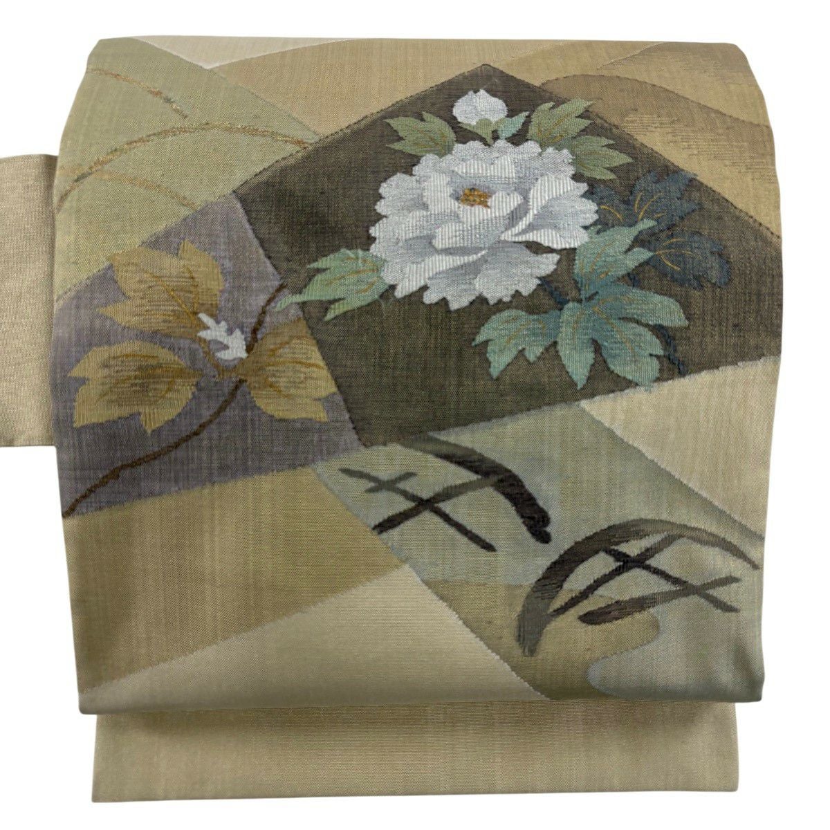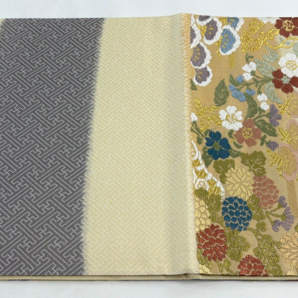 【美品】 袋帯 秀品 草花 幾何学模様 金糸 灰茶 お太鼓柄 正絹