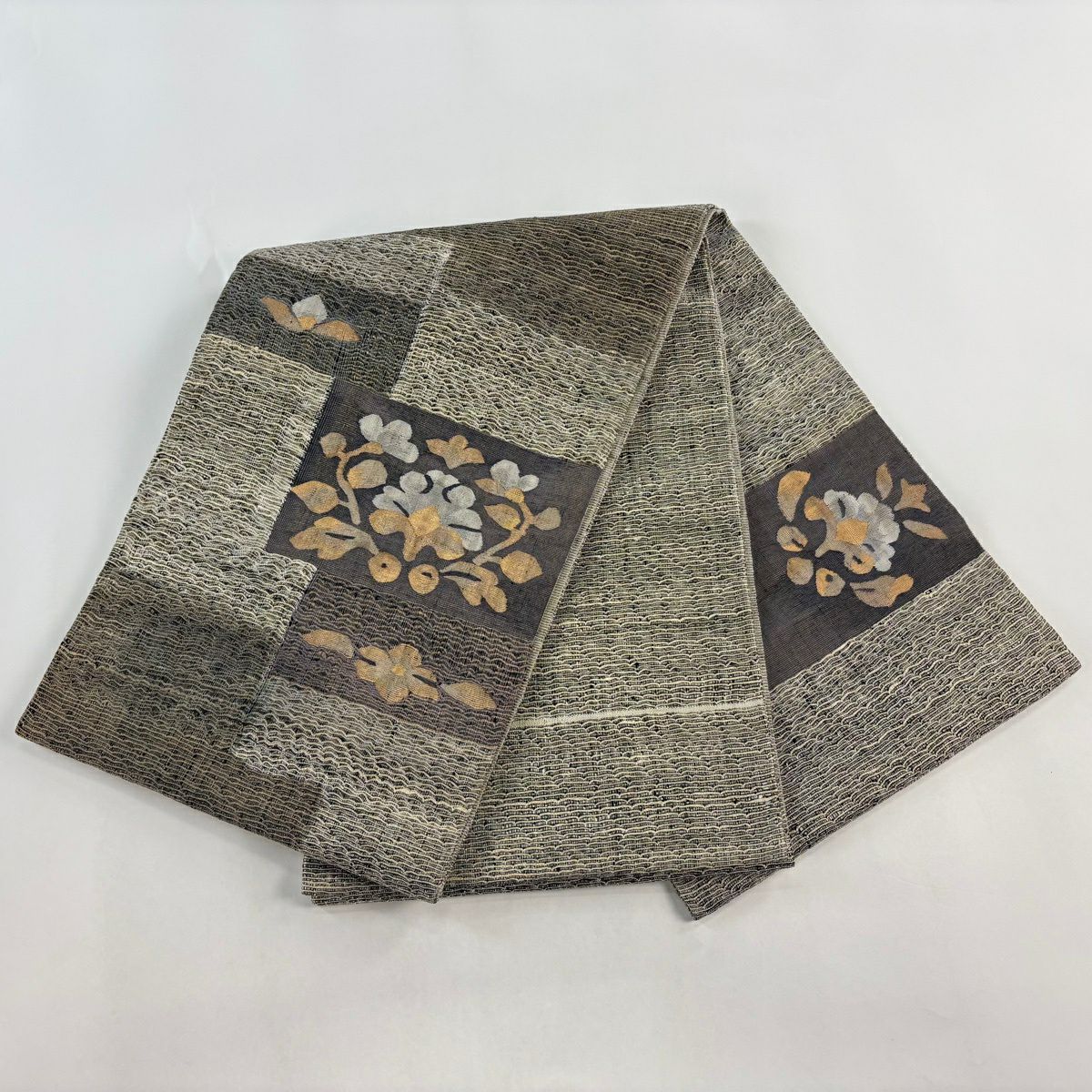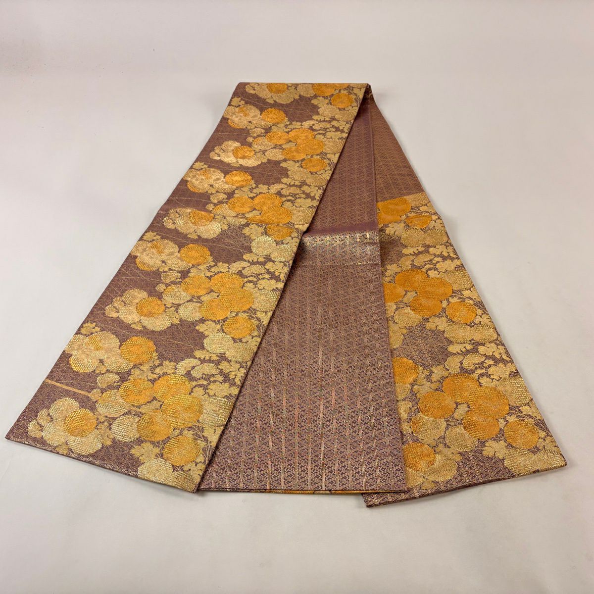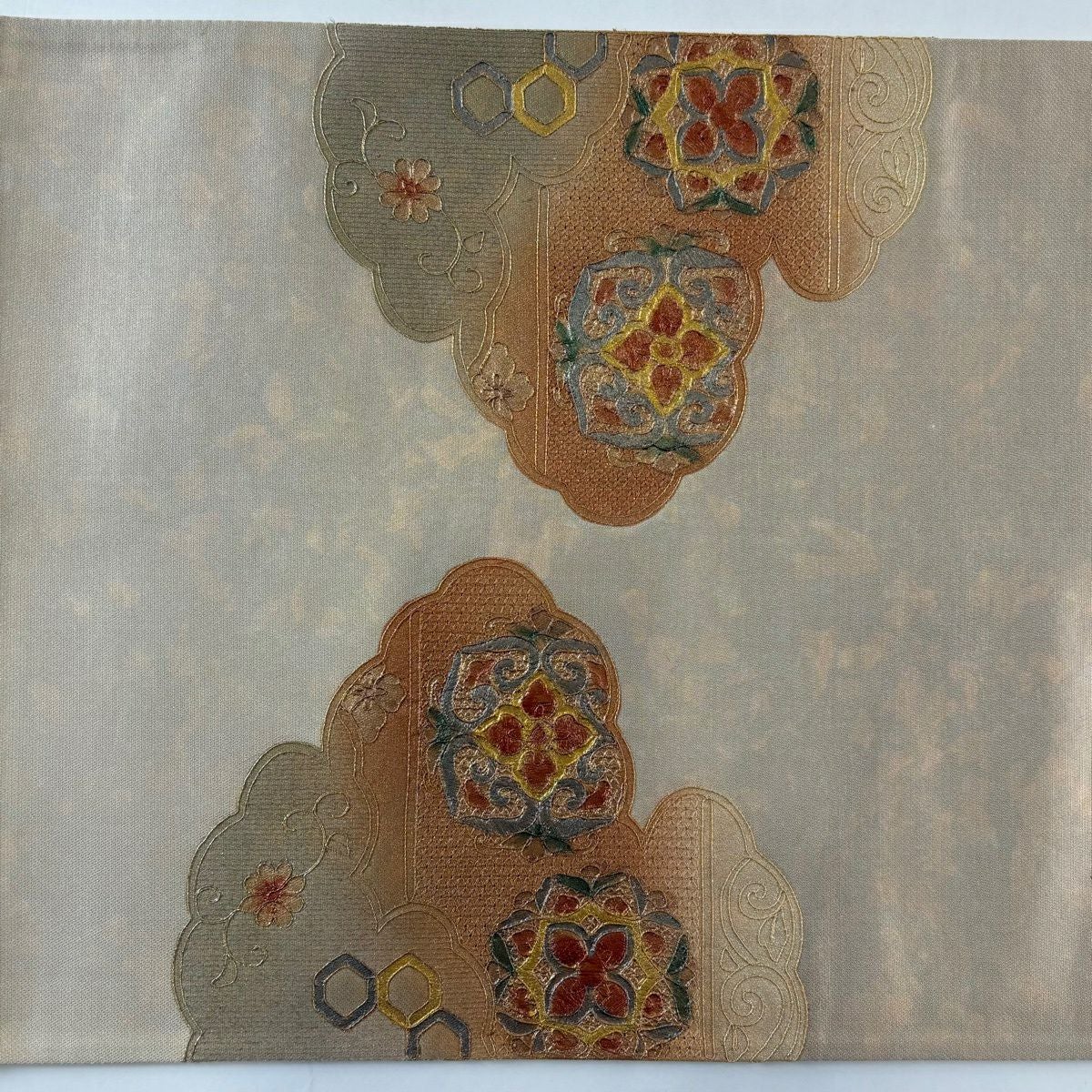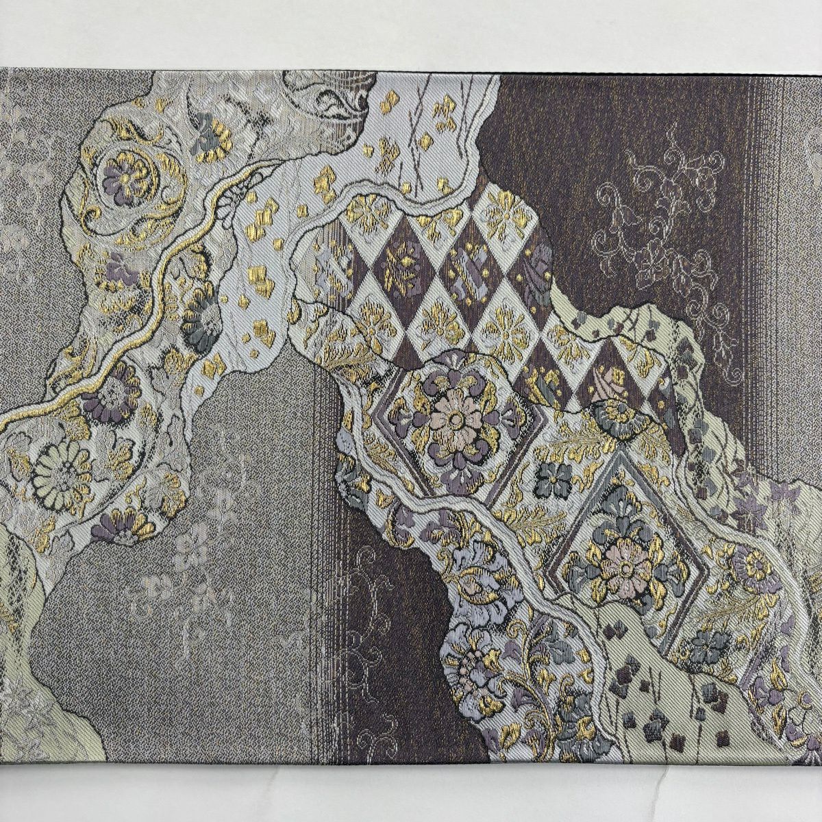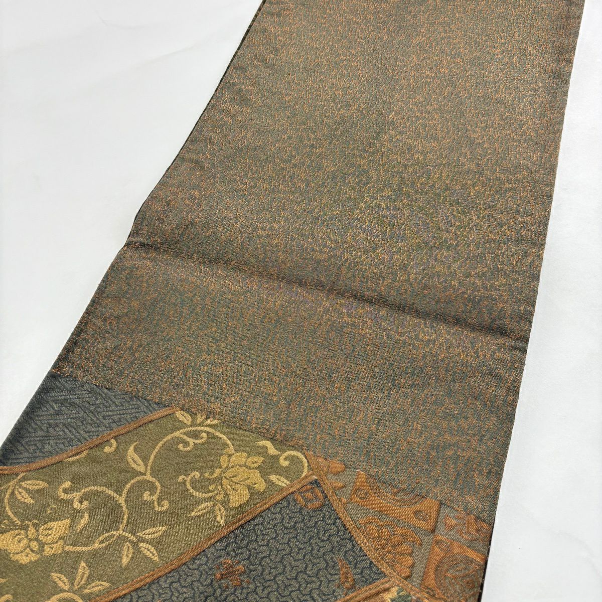 【美品】 袋帯 秀品 草花 幾何学模様 金糸 灰茶 お太鼓柄 正絹