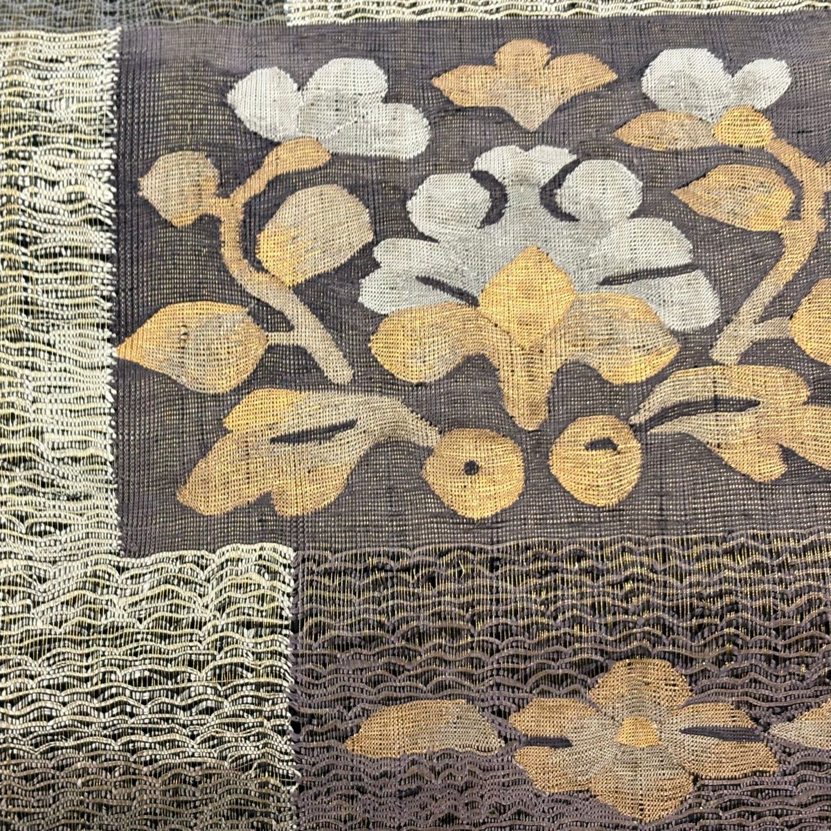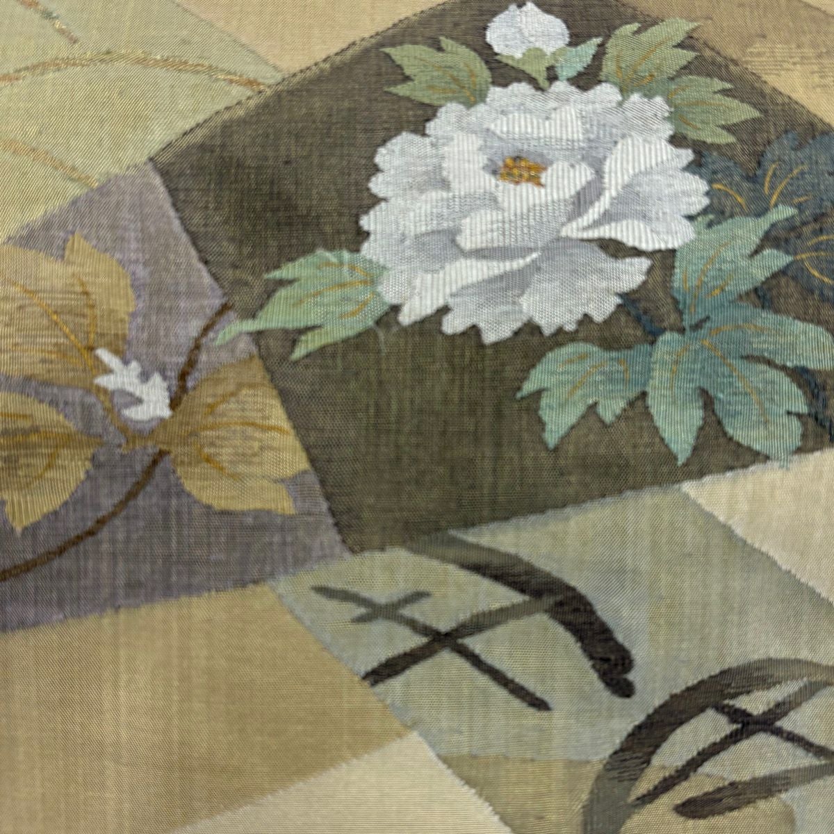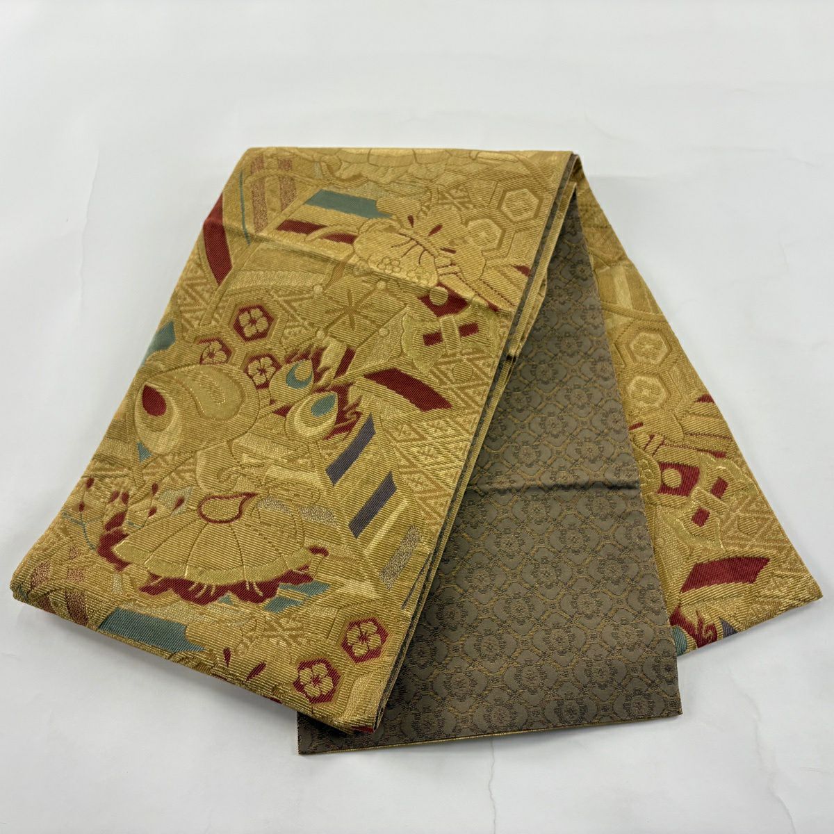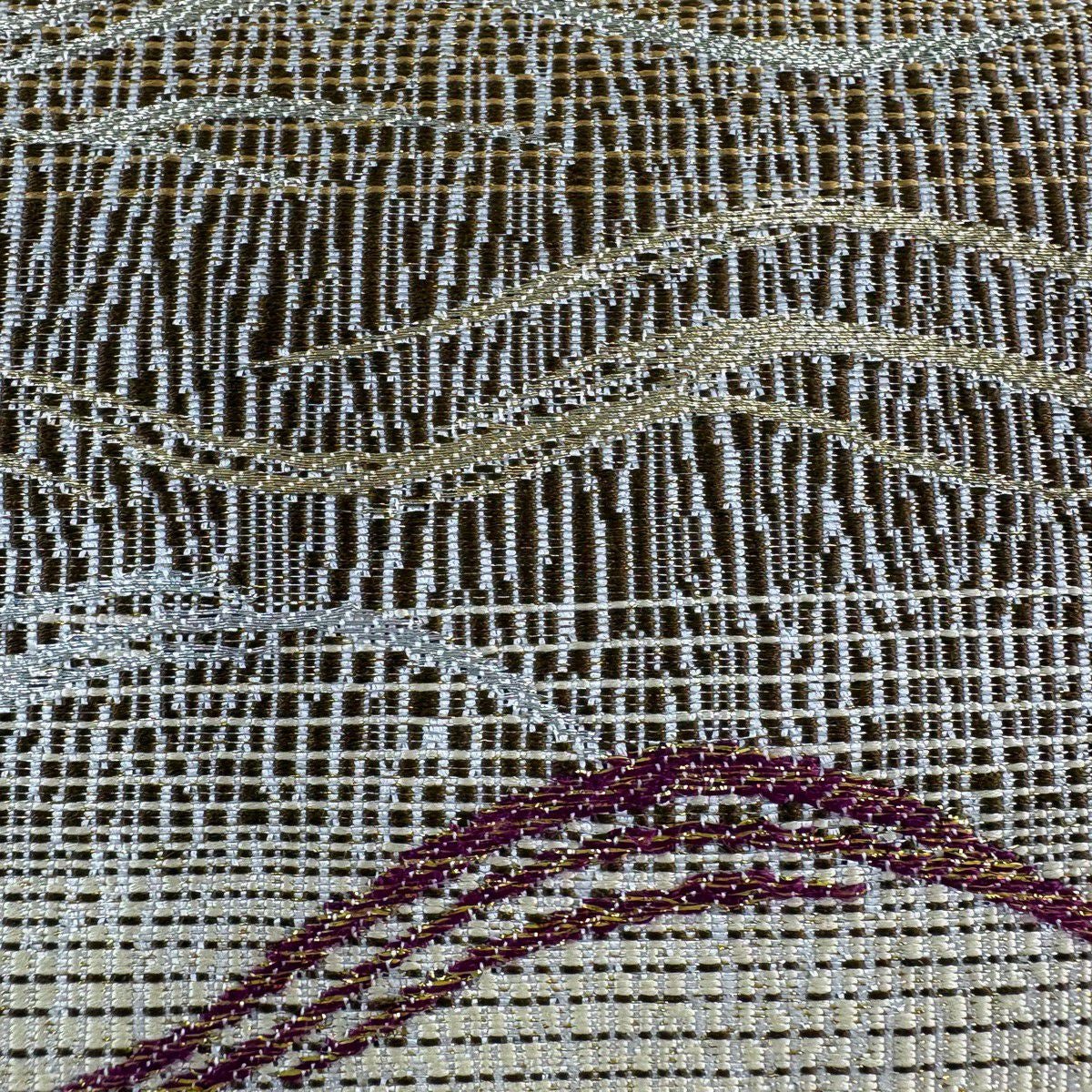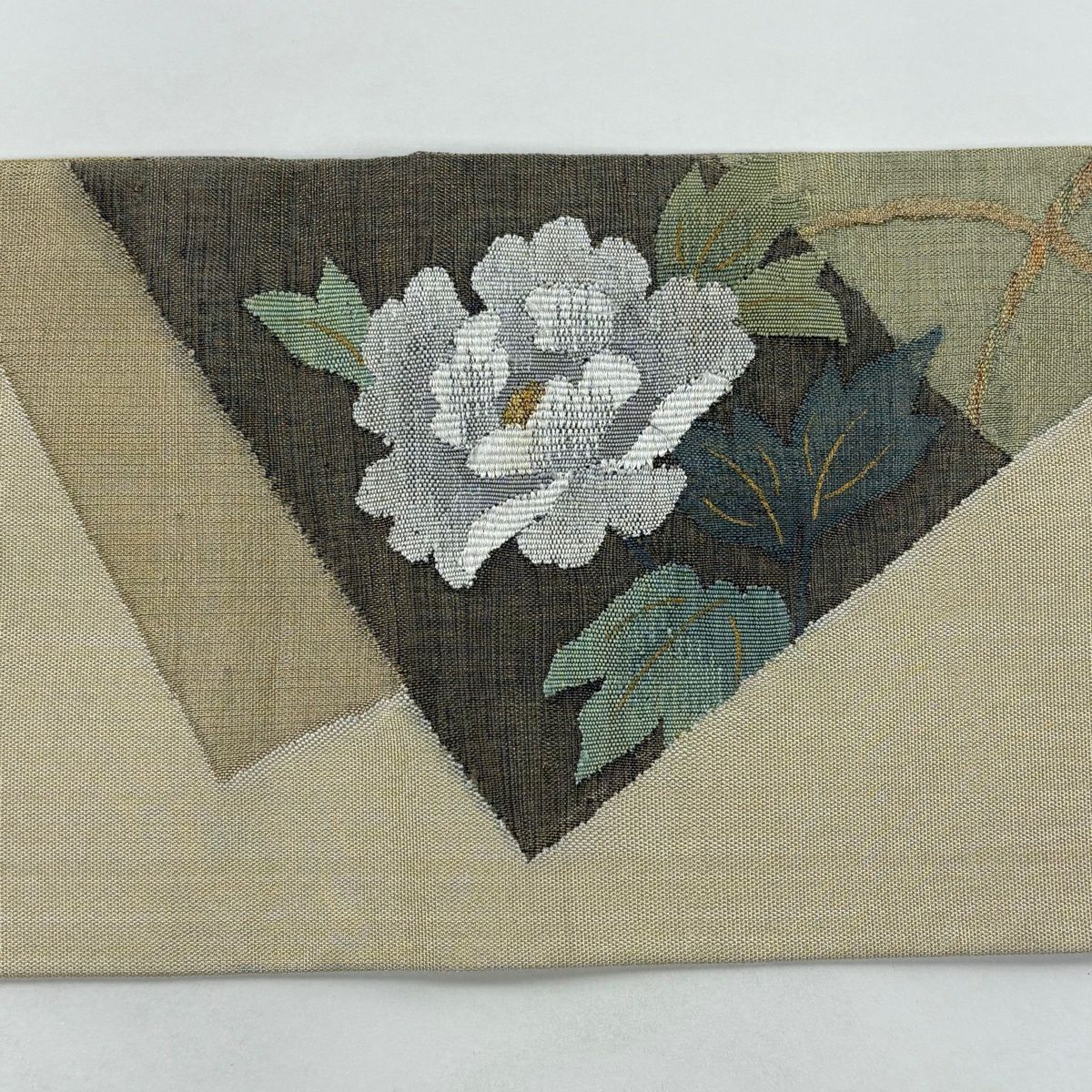 【美品】 袋帯 秀品 草花 幾何学模様 金糸 灰茶 お太鼓柄 正絹