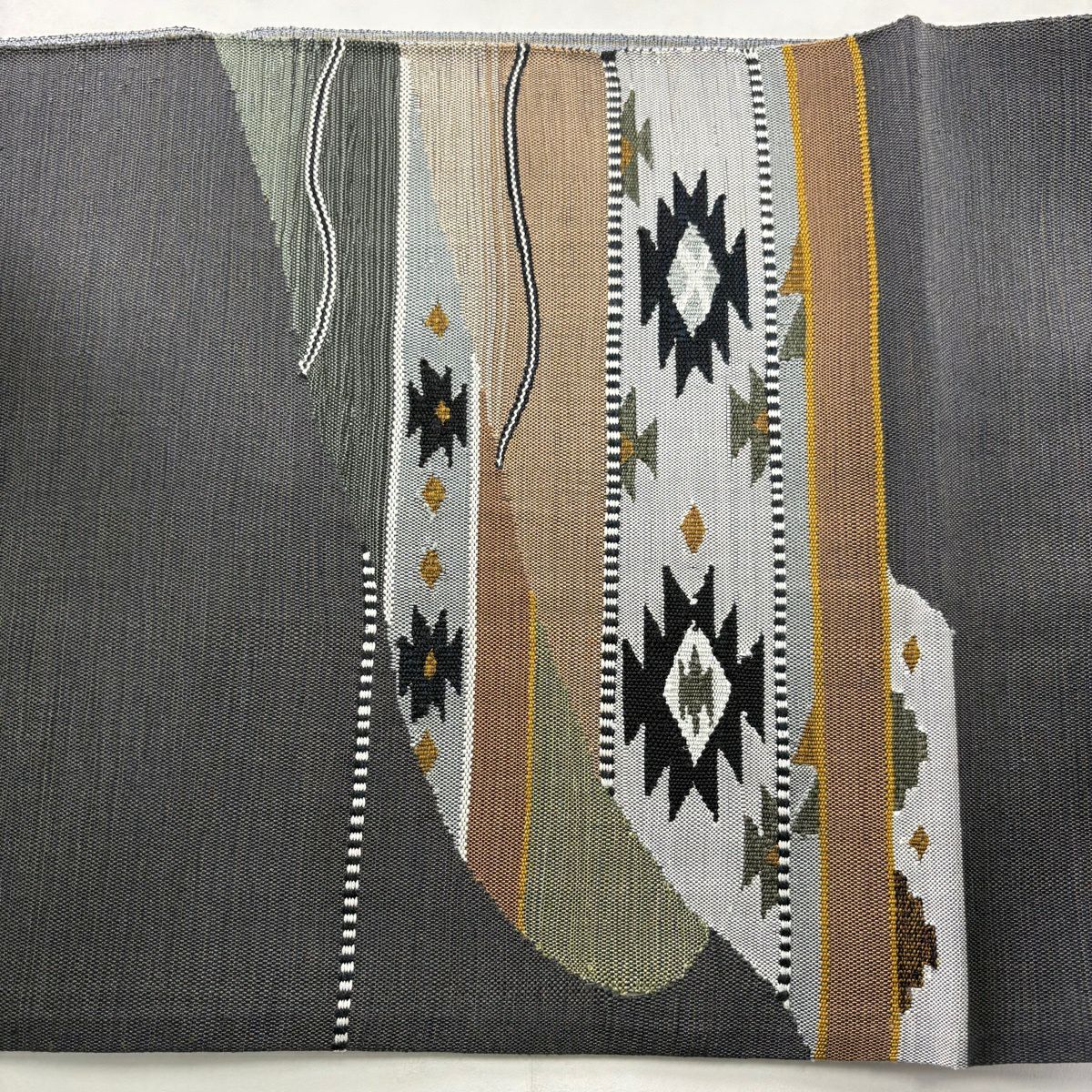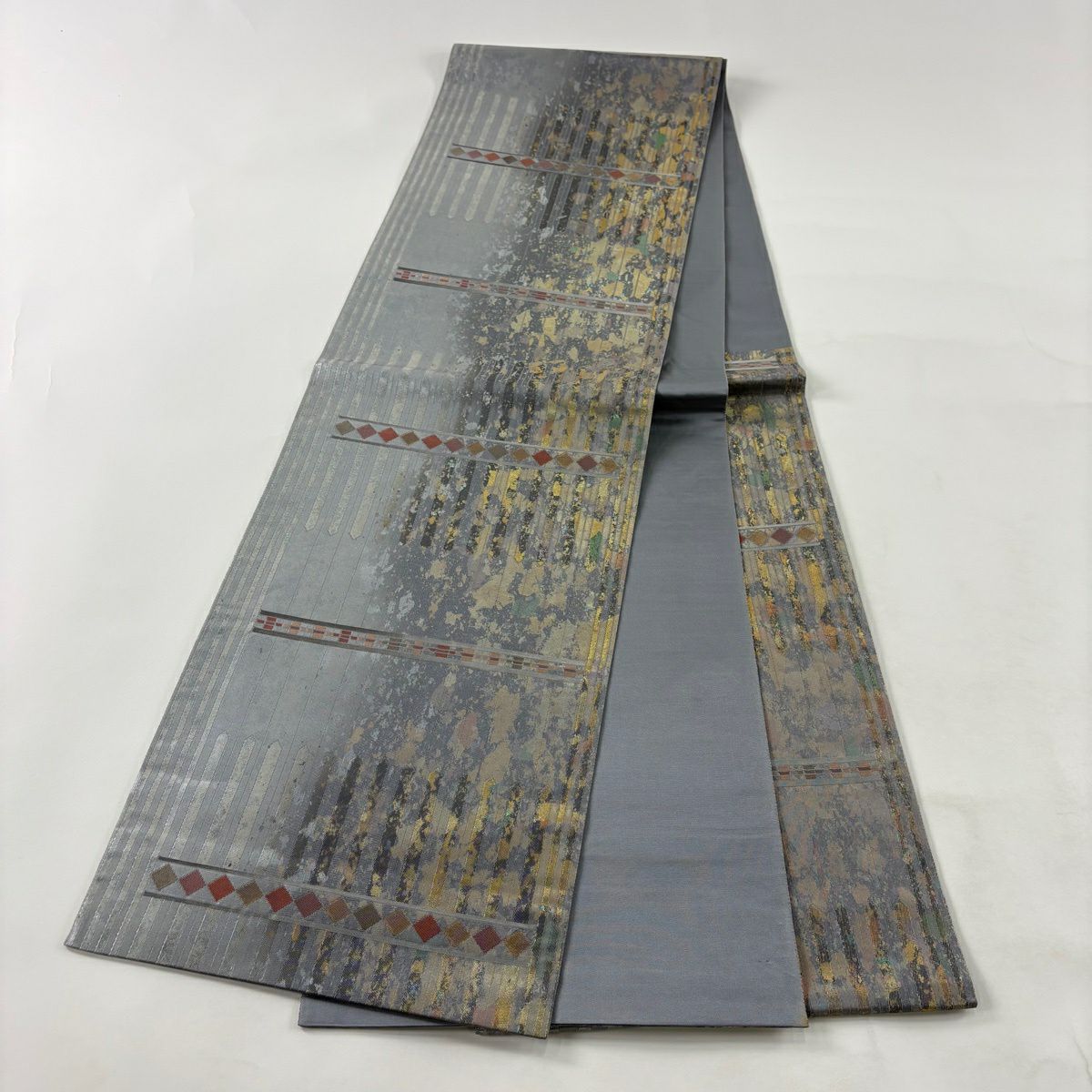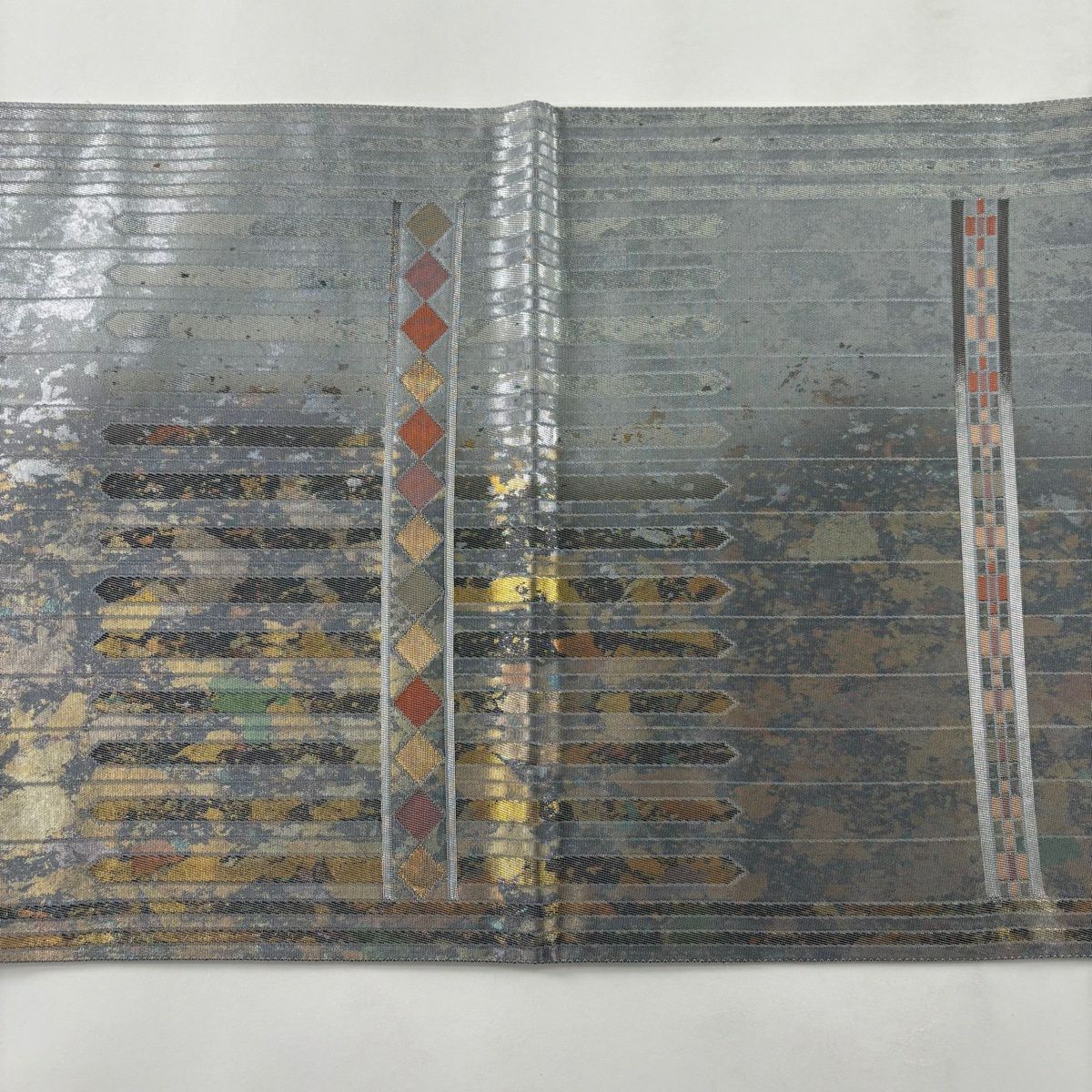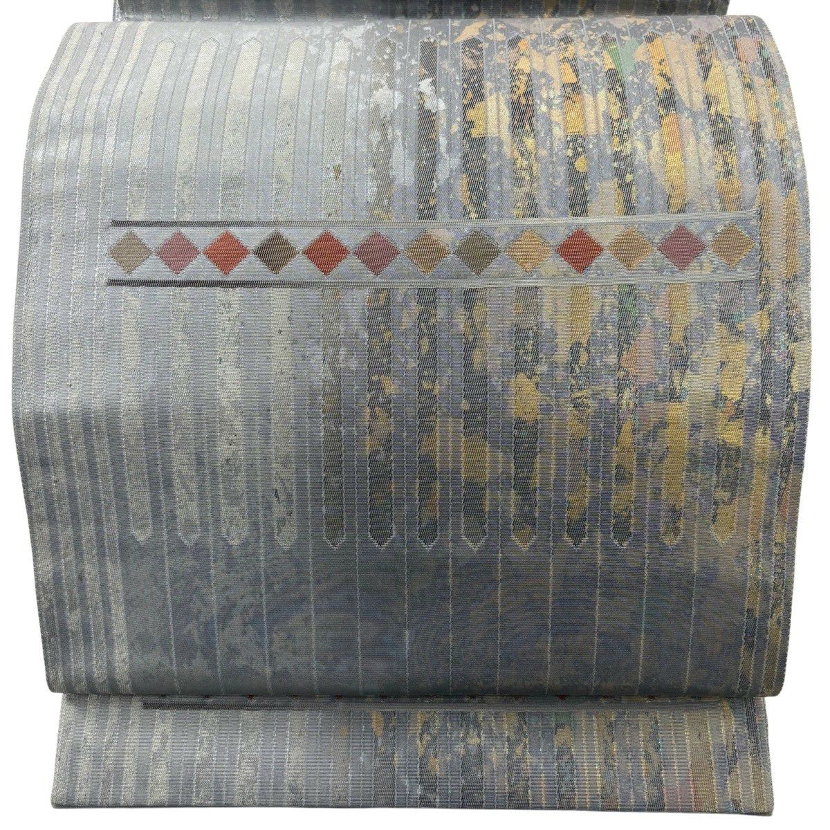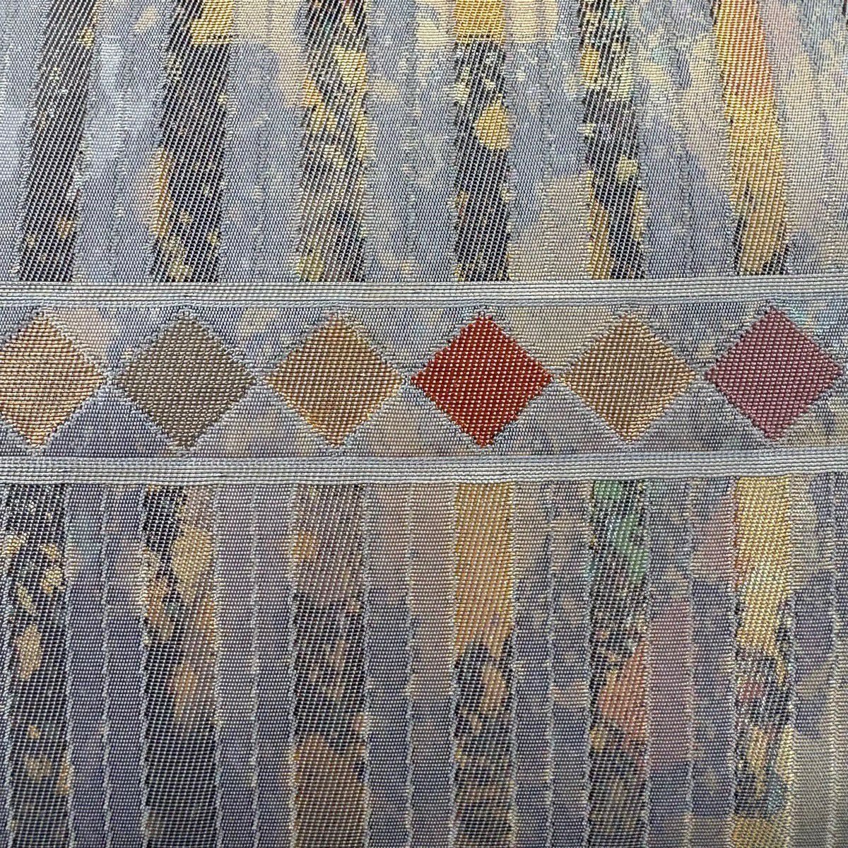 【美品】 袋帯 秀品 鈴乃屋 縞 菱 金銀糸 箔 灰色 六通 正絹