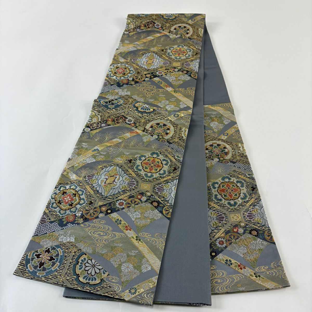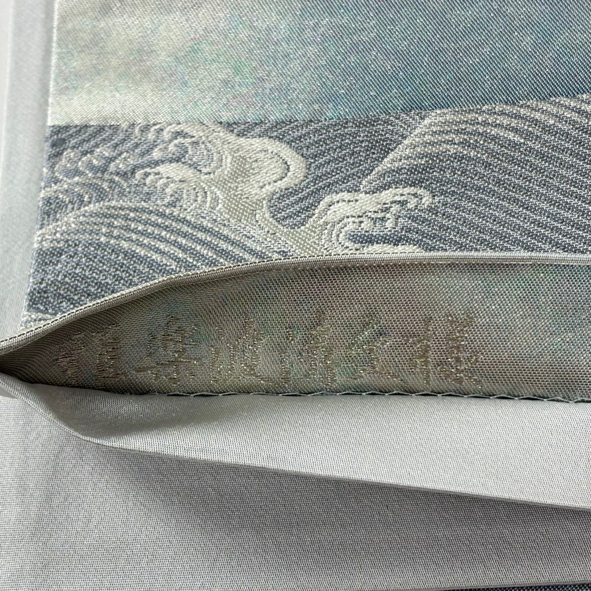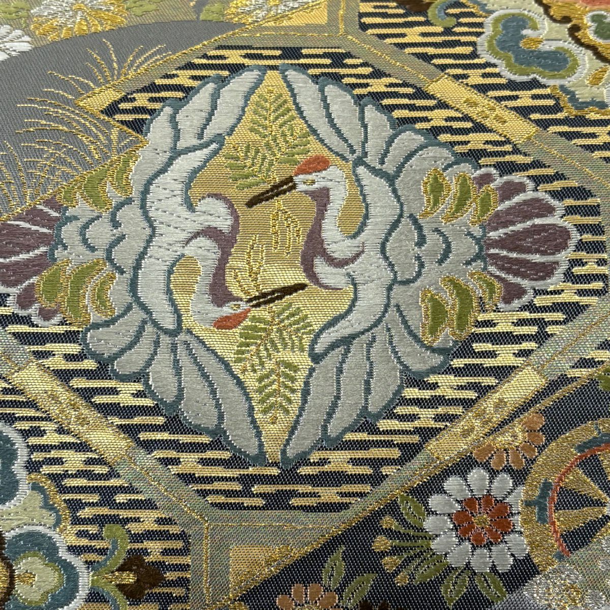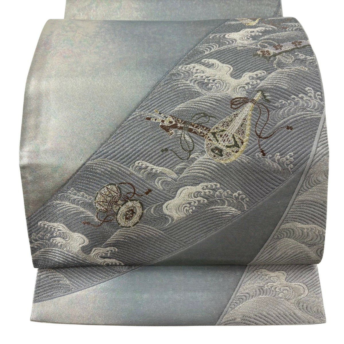【美品】 袋帯 秀品 青海松皮華文 金銀糸 刺繍 灰色 六通 正絹