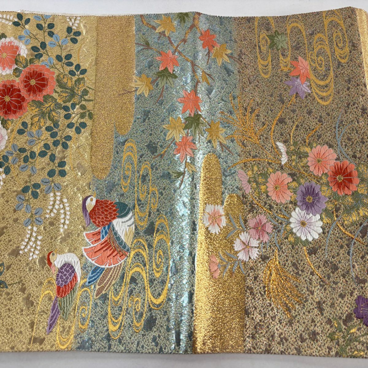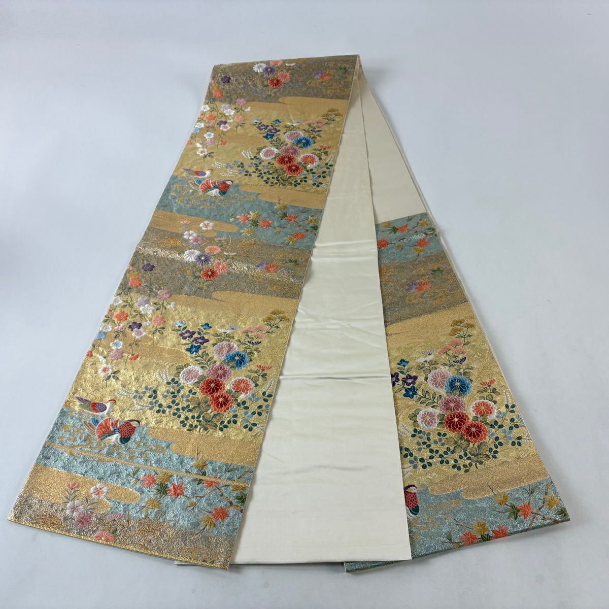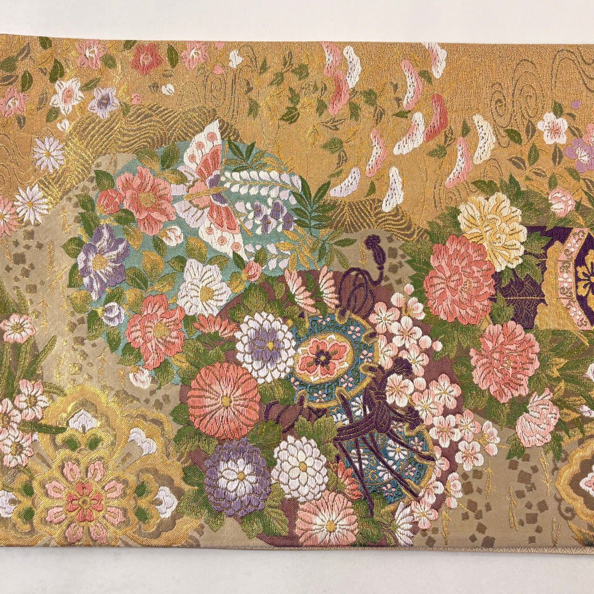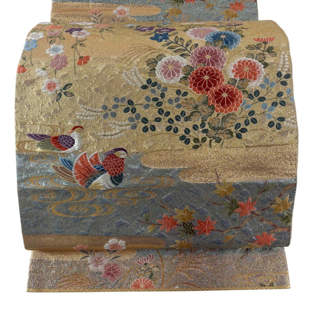 袋帯 秀品 関西仕立て 鴛鴦 春秋花園文 金糸 箔 金色 六通 正絹