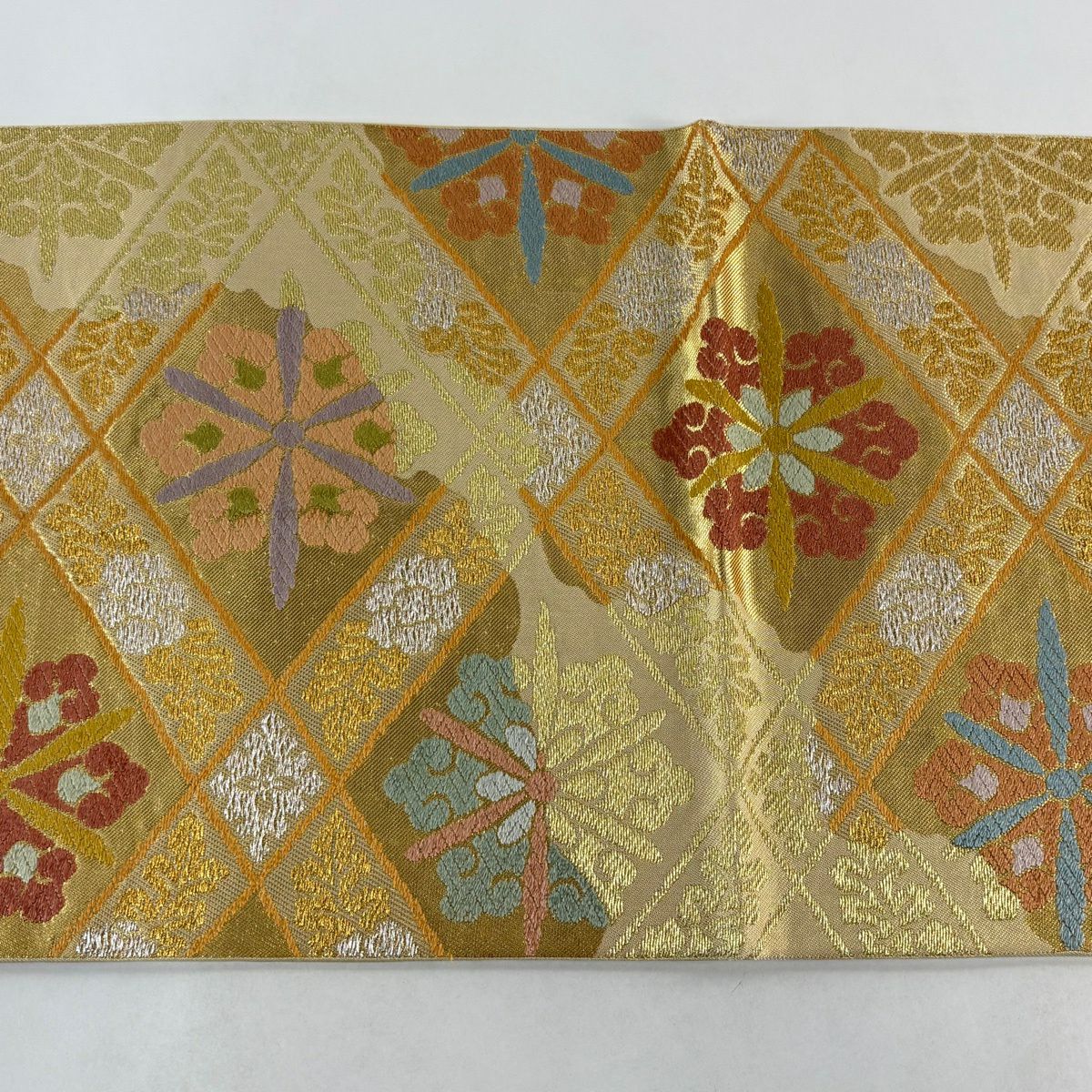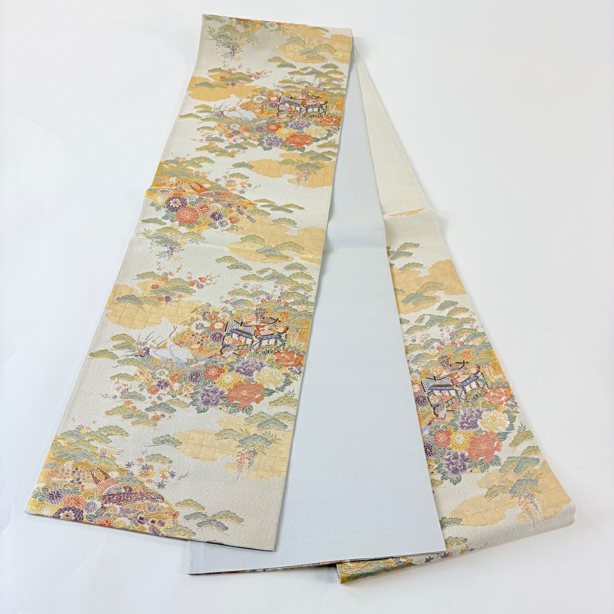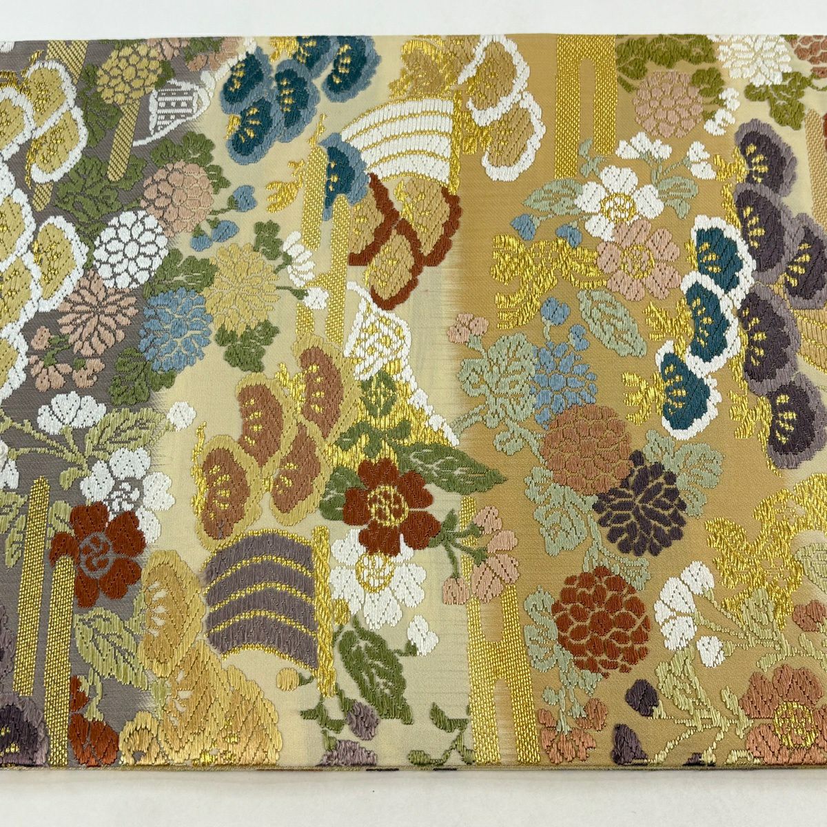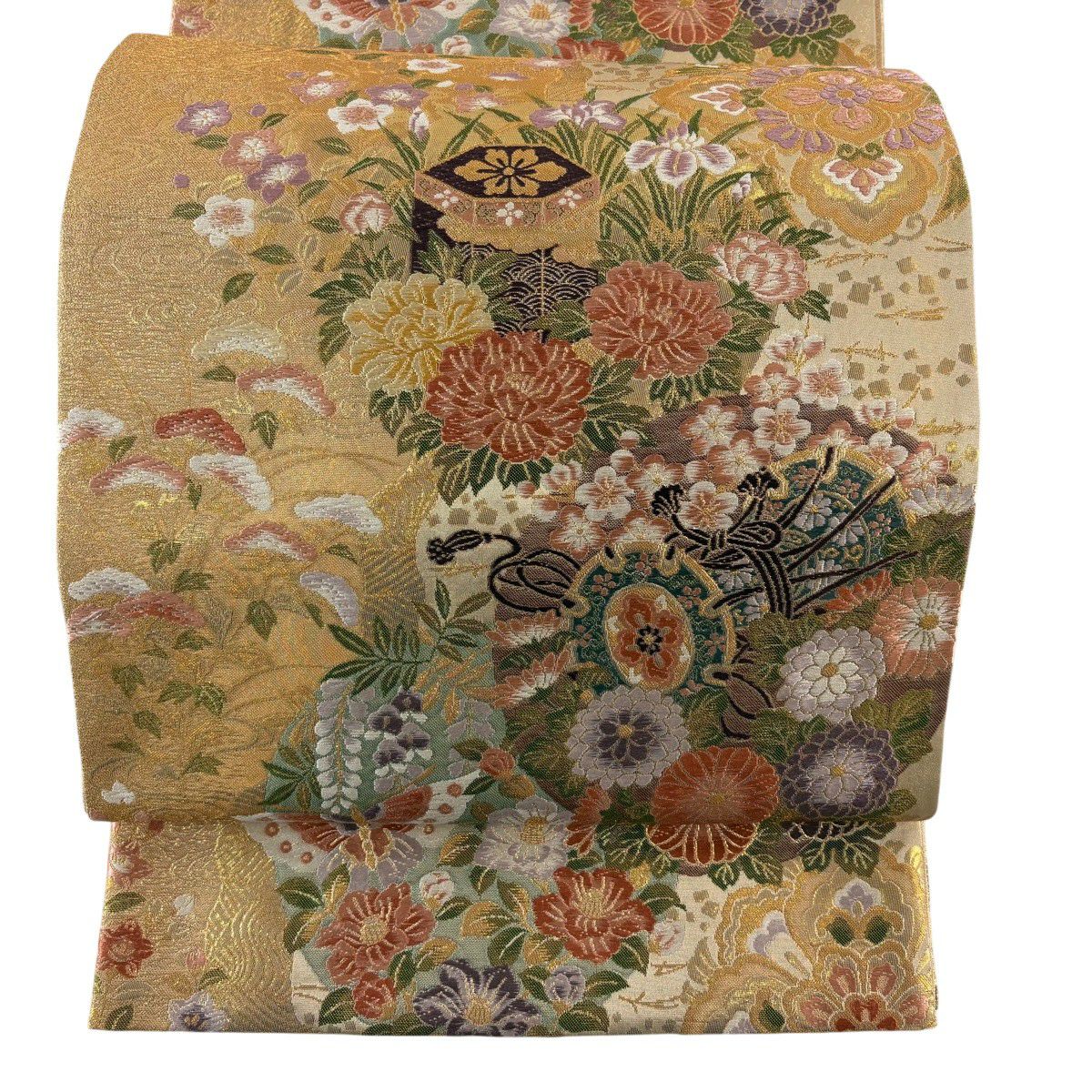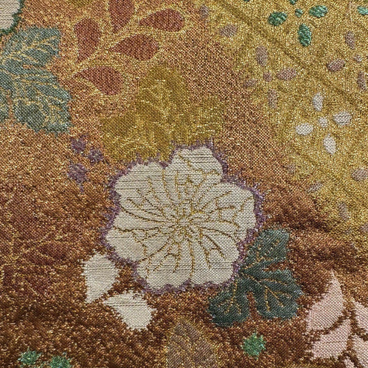 【美品】 袋帯 秀品 秋草 亀甲 唐織 金糸 クリーム 六通 正絹