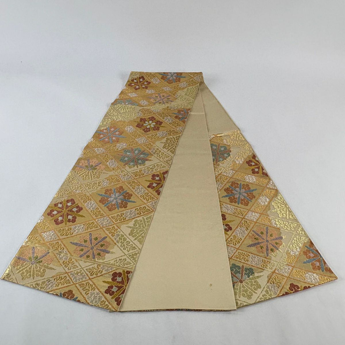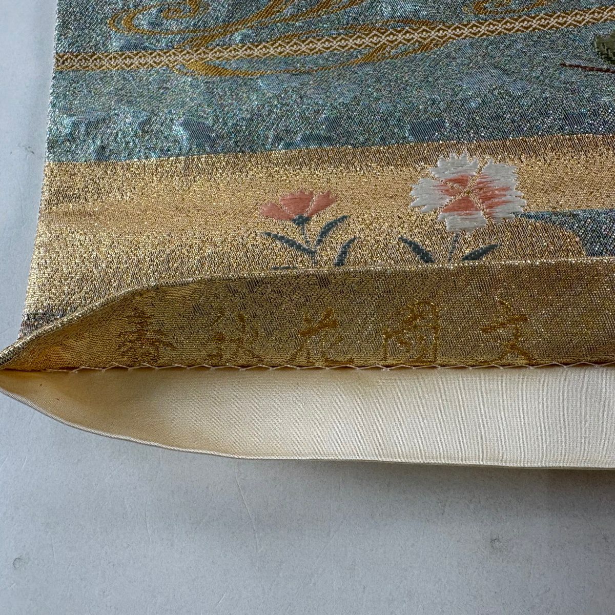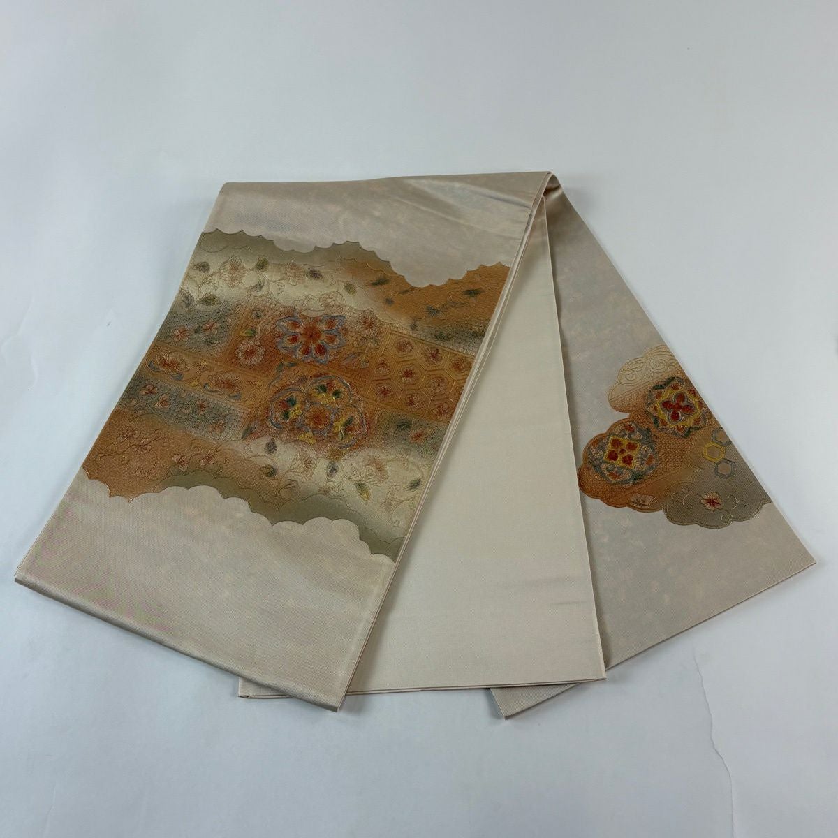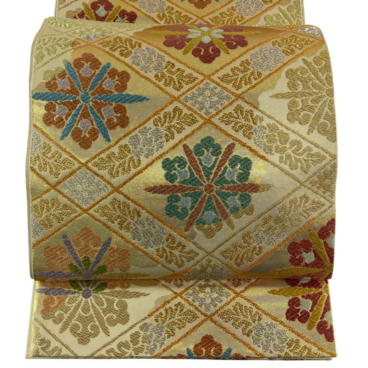 【美品】 袋帯 秀品 秋草 亀甲 唐織 金糸 クリーム 六通 正絹
