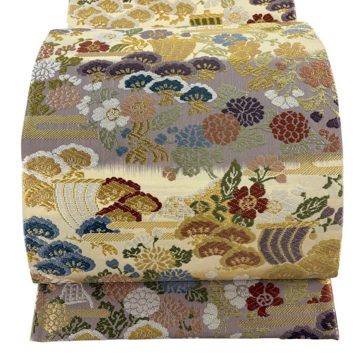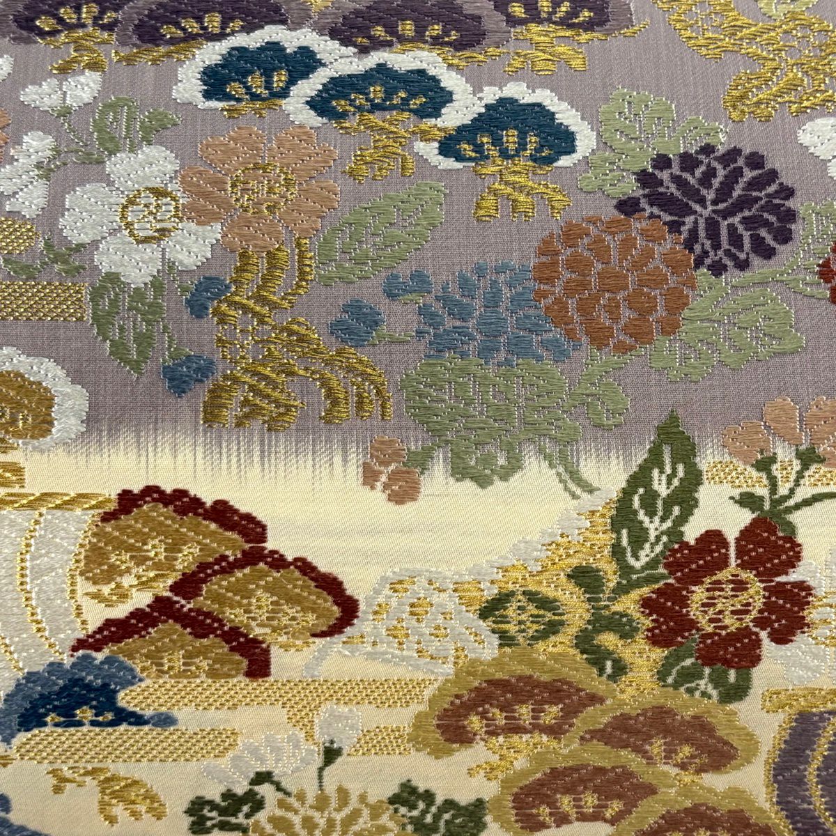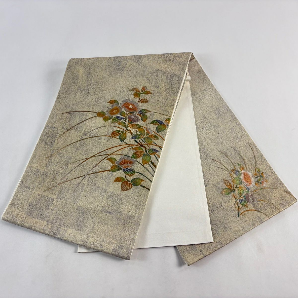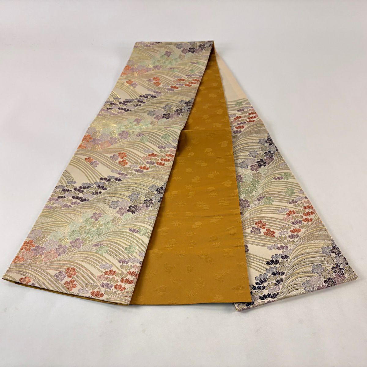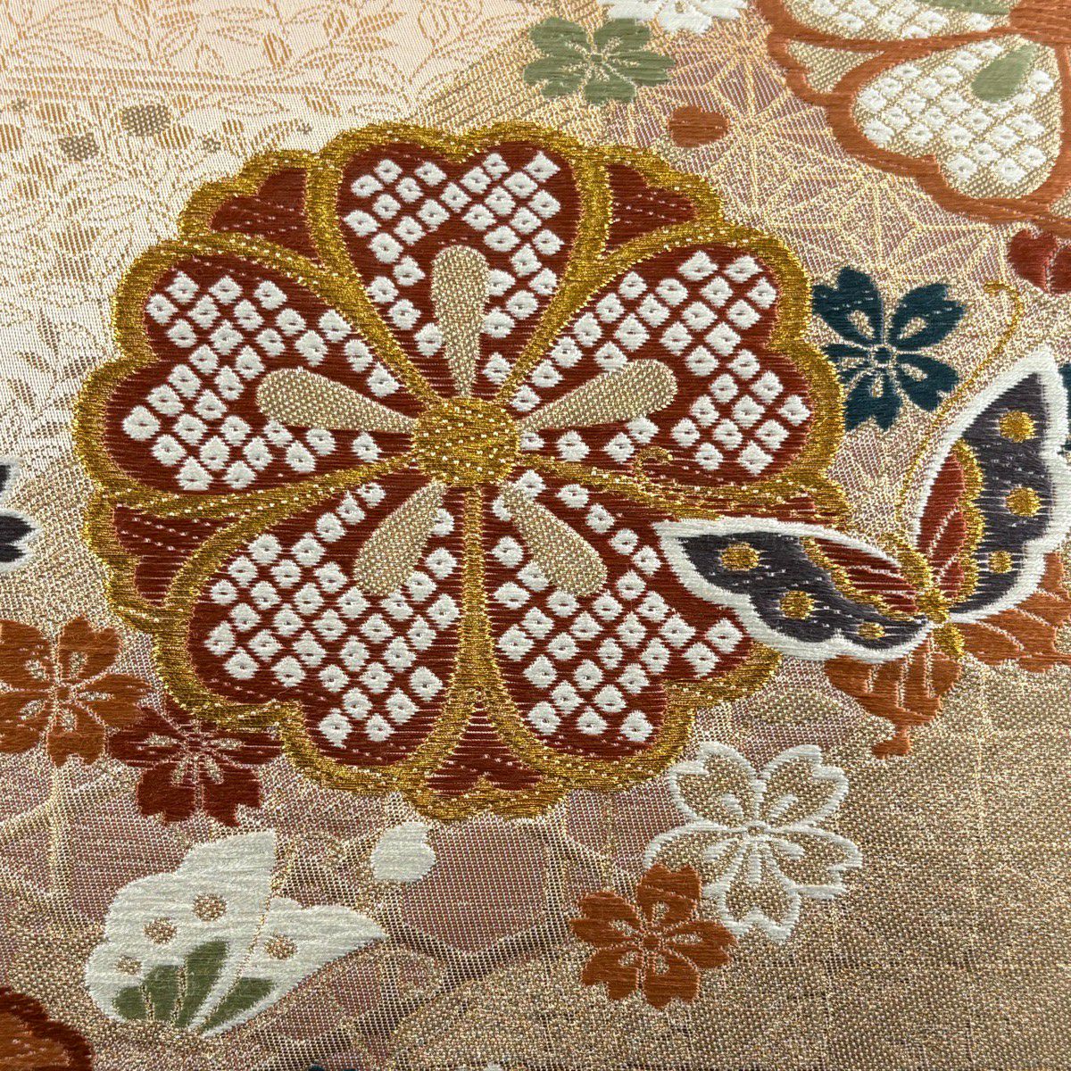 【美品】 袋帯 秀品 秋草 亀甲 唐織 金糸 クリーム 六通 正絹