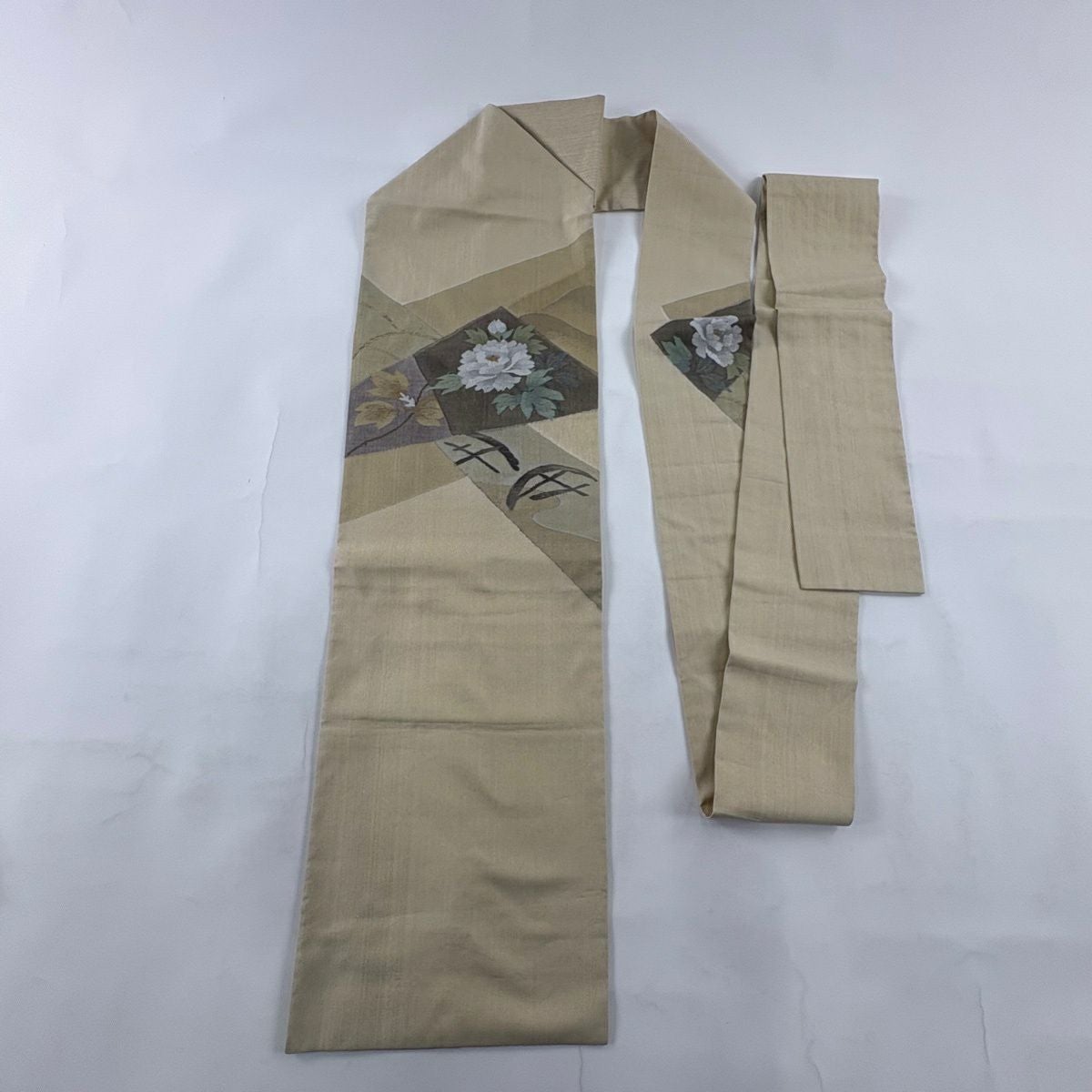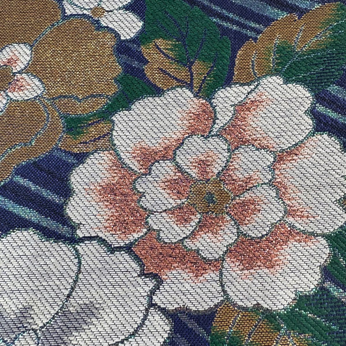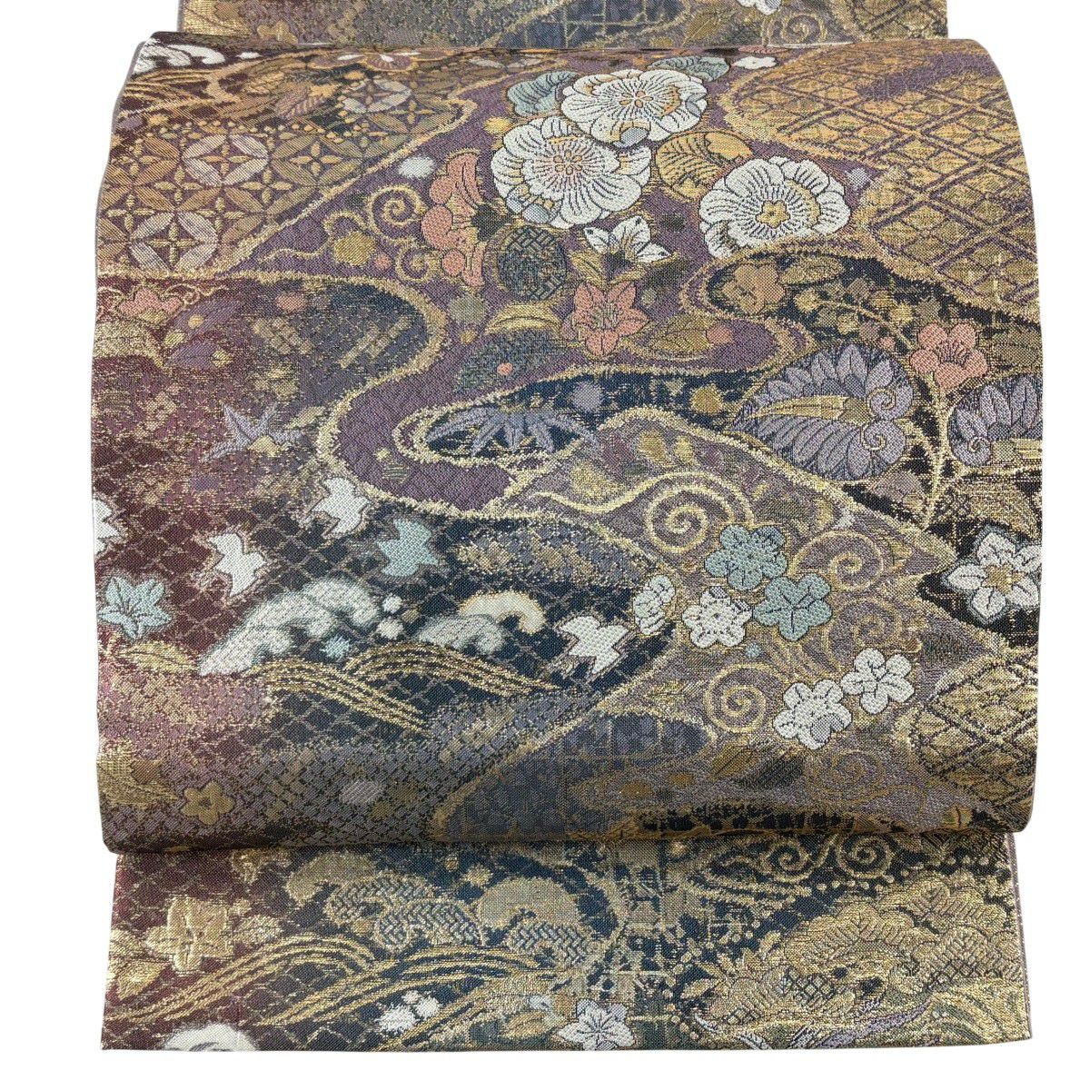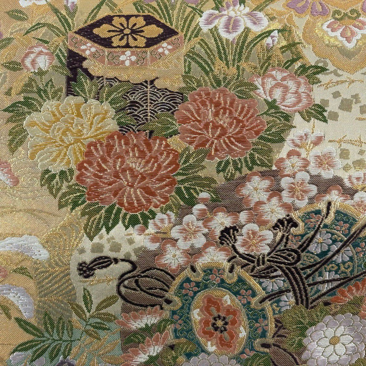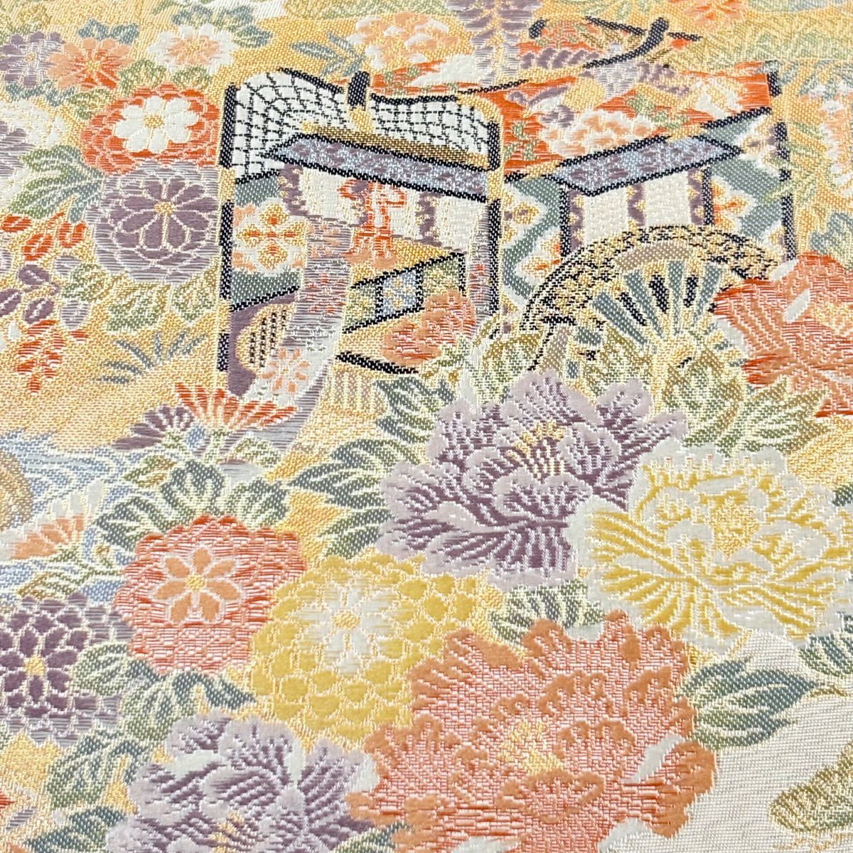 【美品】 袋帯 秀品 秋草 亀甲 唐織 金糸 クリーム 六通 正絹
