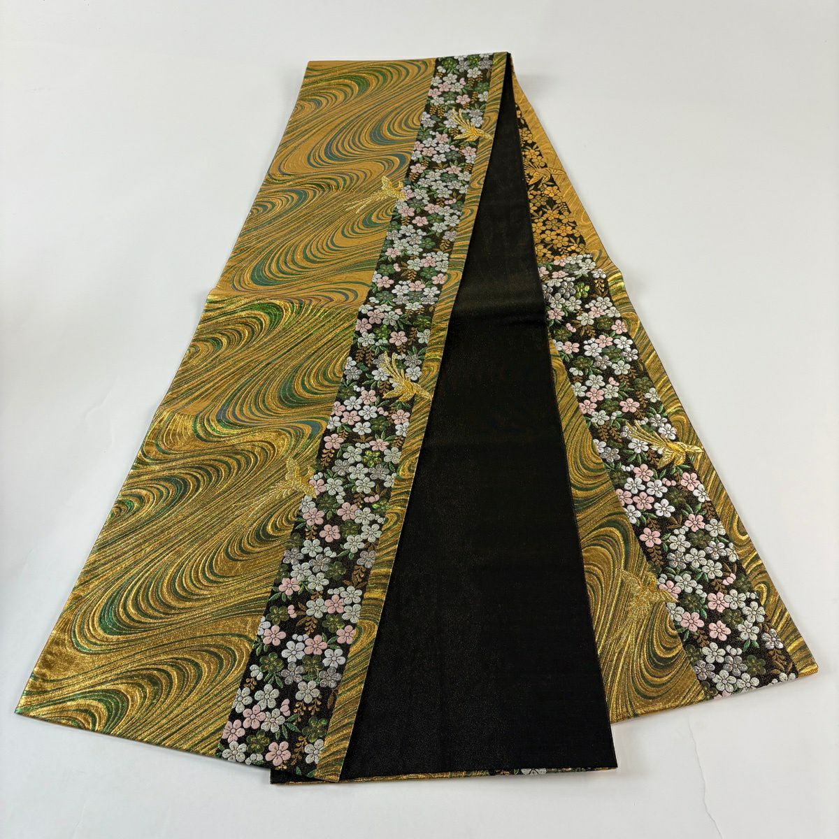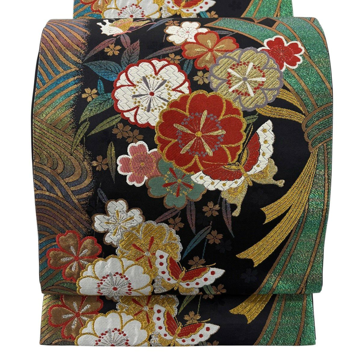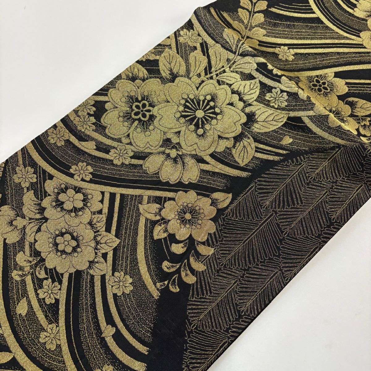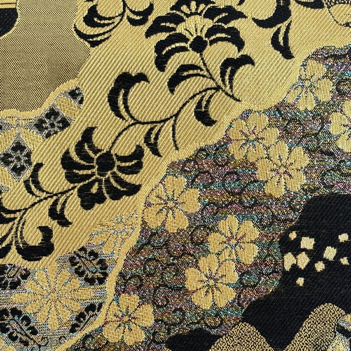 【美品】 袋帯 秀品 振袖向き 桜 波 金銀糸 箔 黒 六通 正絹