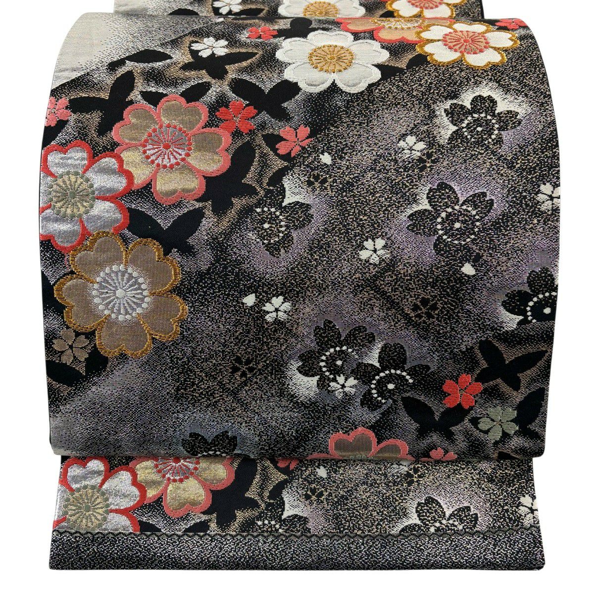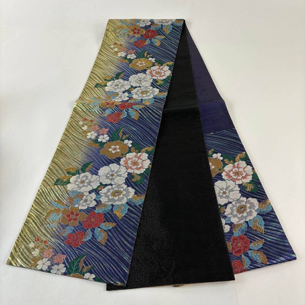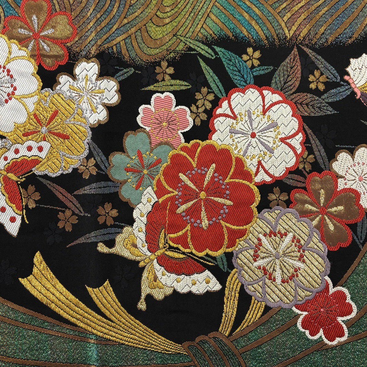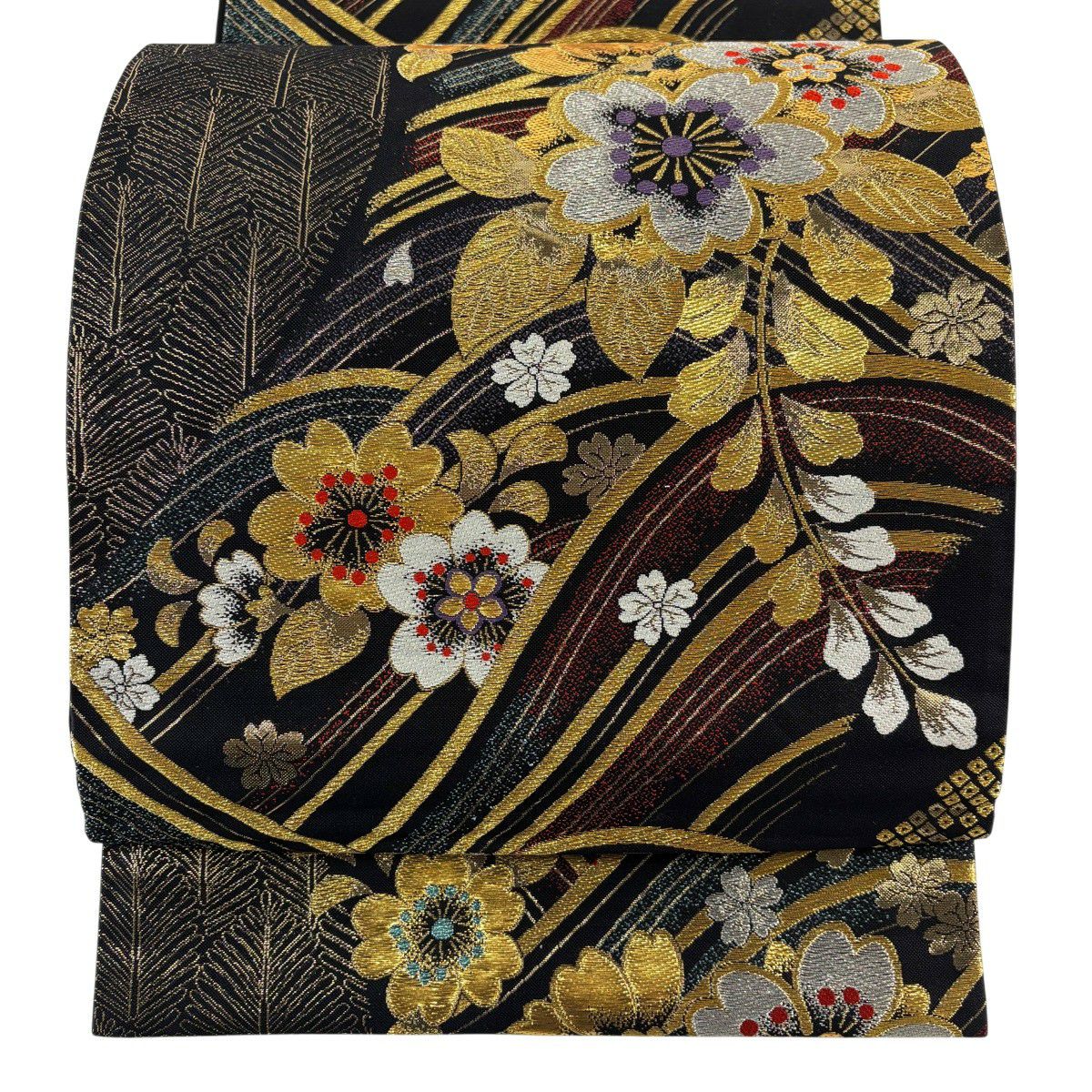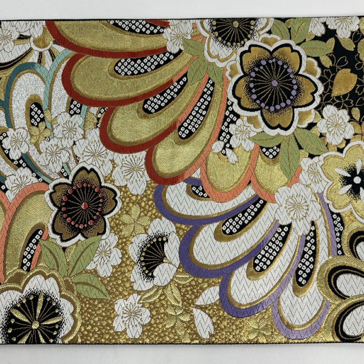 【美品】 袋帯 秀品 振袖向き 桜 波 金銀糸 箔 黒 六通 正絹