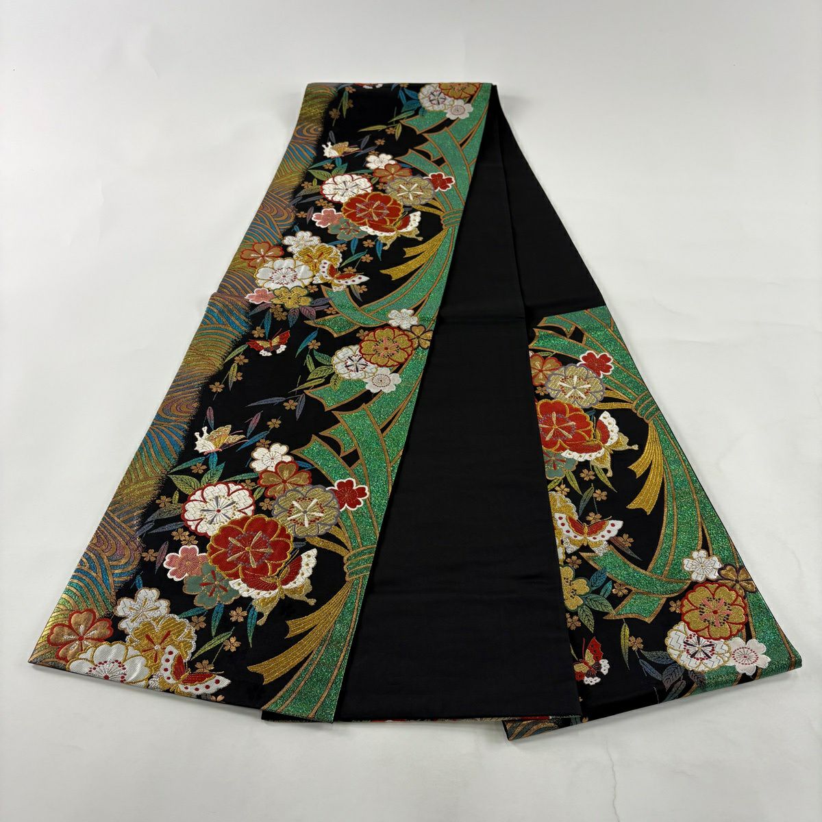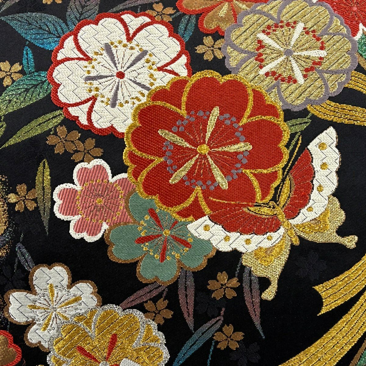 【美品】 袋帯 秀品 振袖向き 桜 蝶 金糸 刺繍 黒 六通 正絹