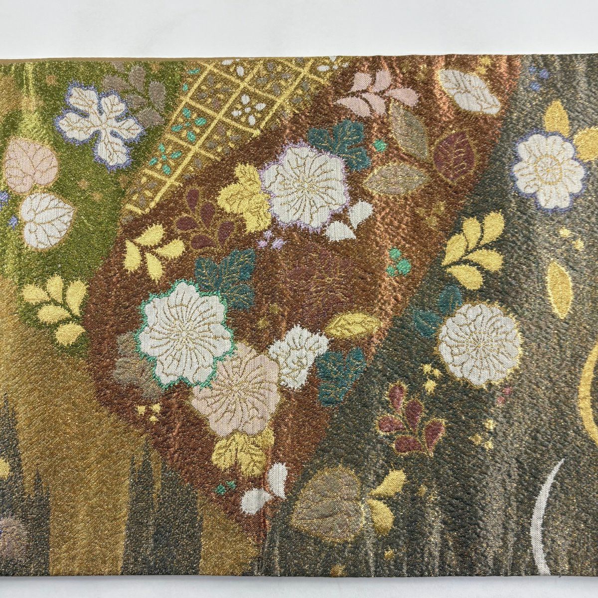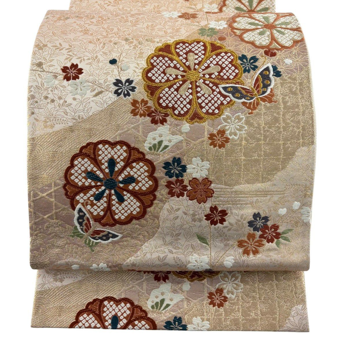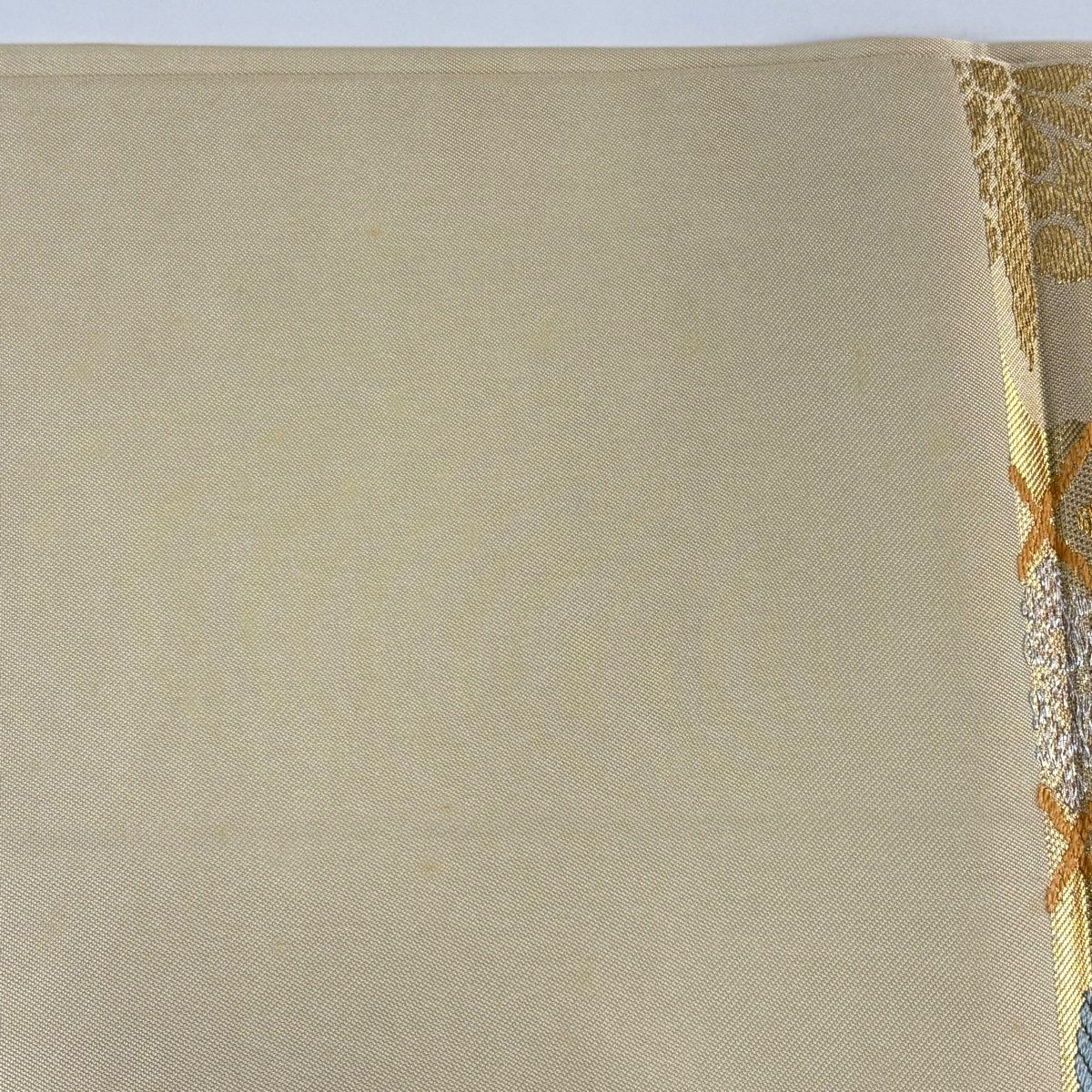 袋帯 秀品 草花 格子 金銀彩 螺鈿 ベージュ お太鼓柄 正絹