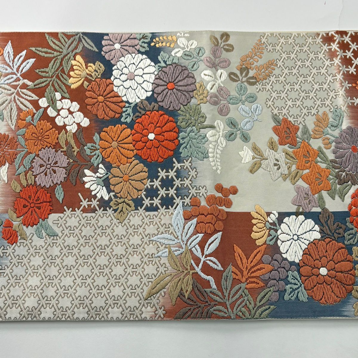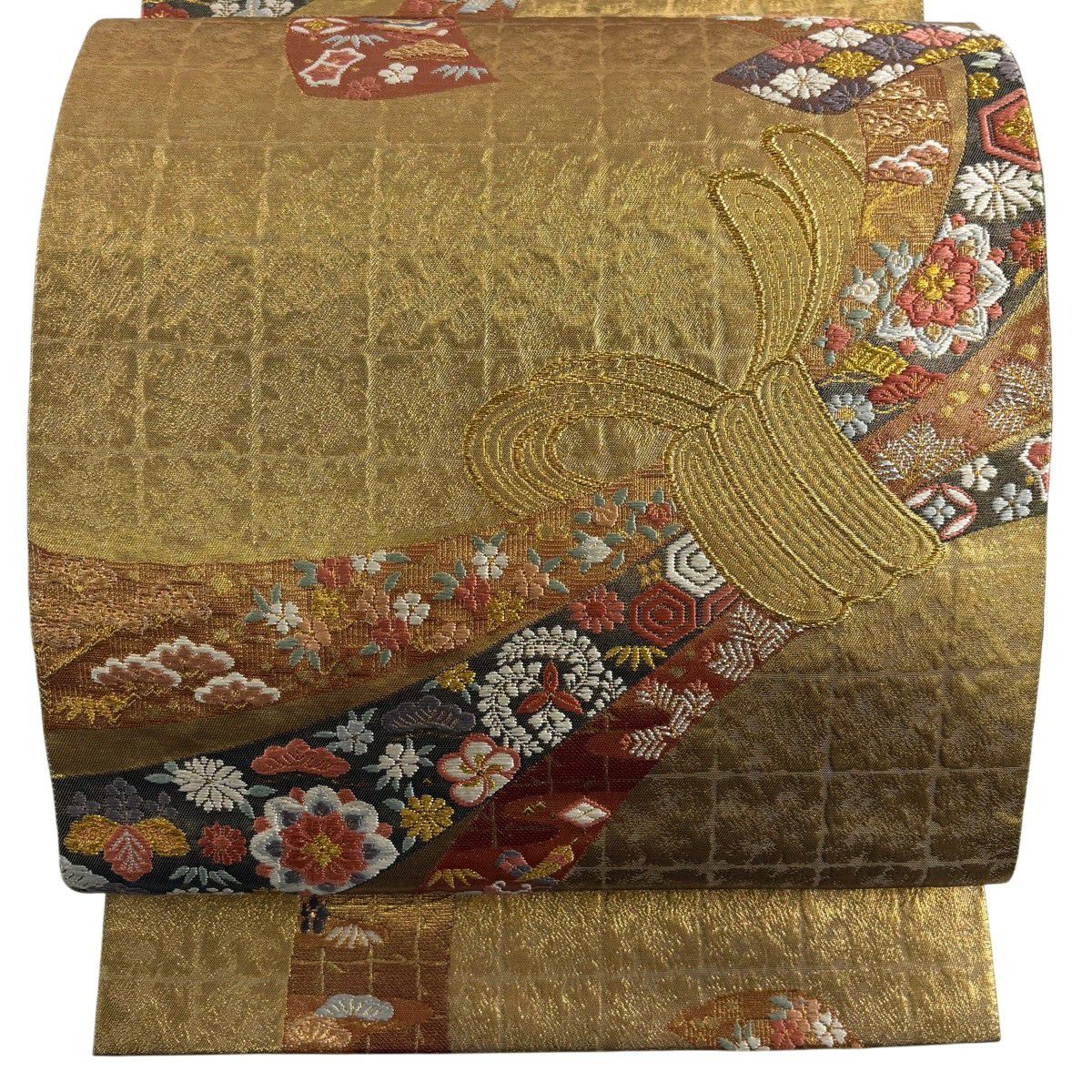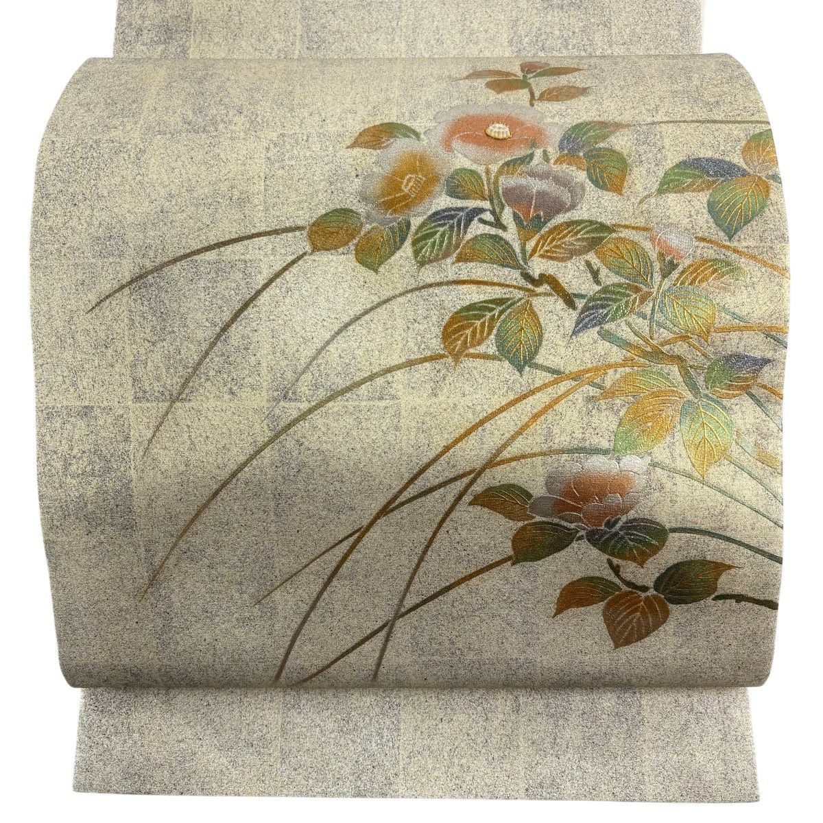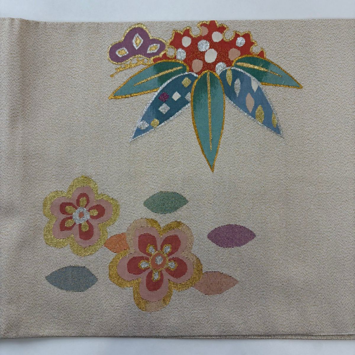 袋帯 秀品 草花 格子 金銀彩 螺鈿 ベージュ お太鼓柄 正絹