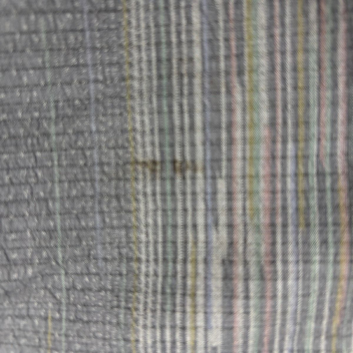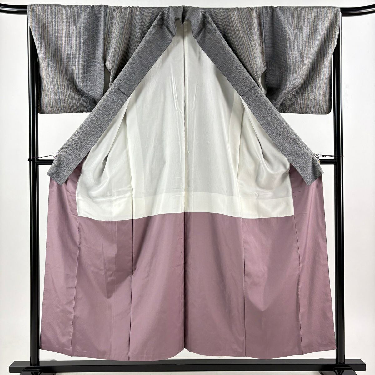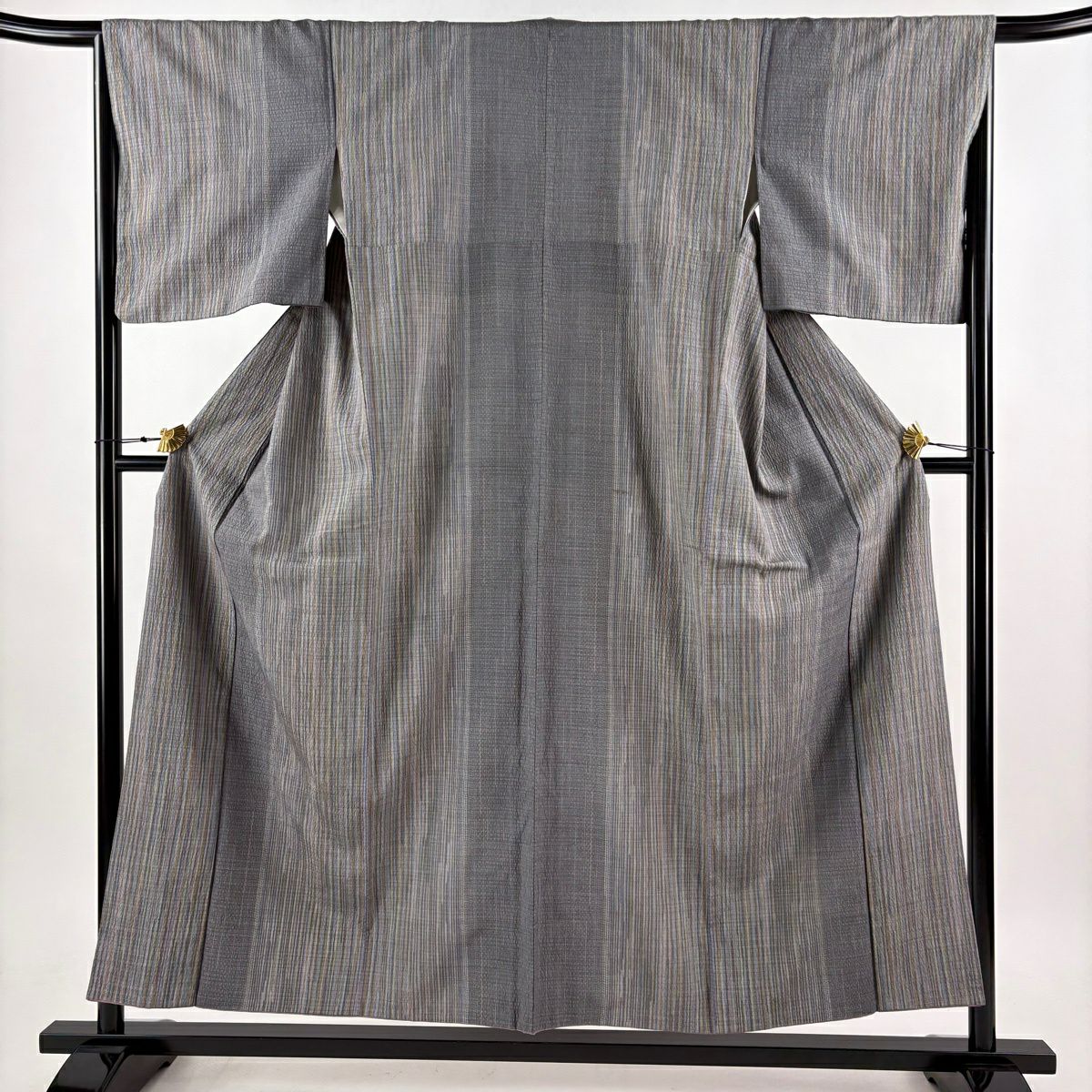 紬 身丈154cm 裄丈66.5cm M 袷 縦縞 灰色 正絹 秀品