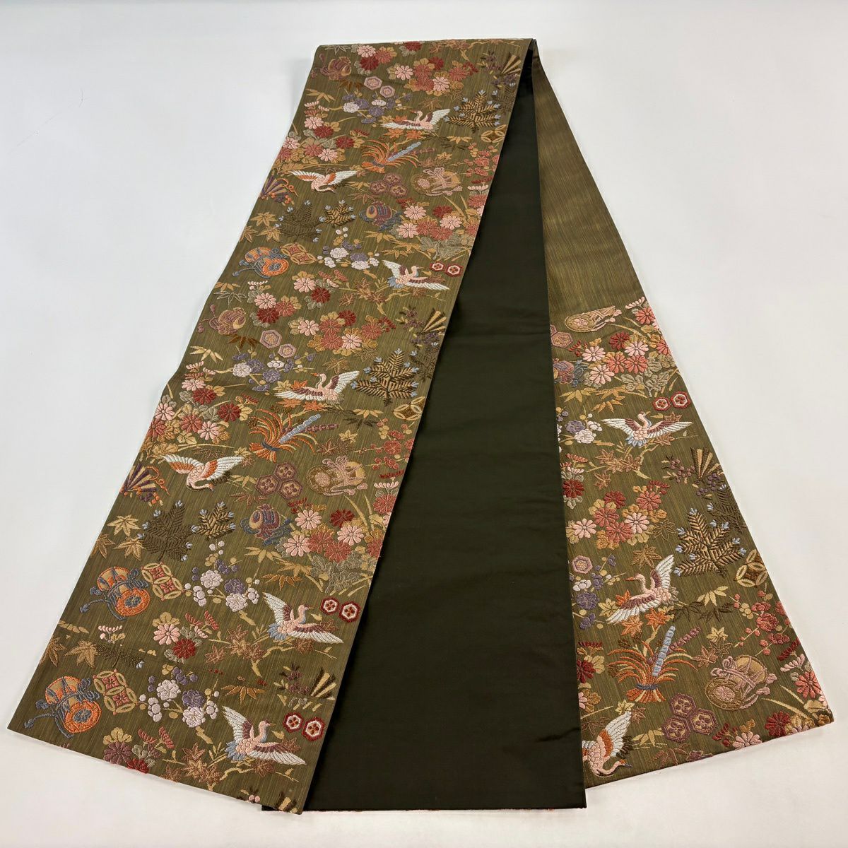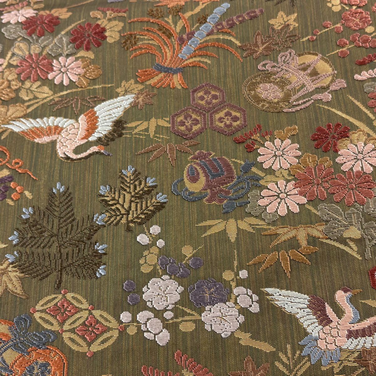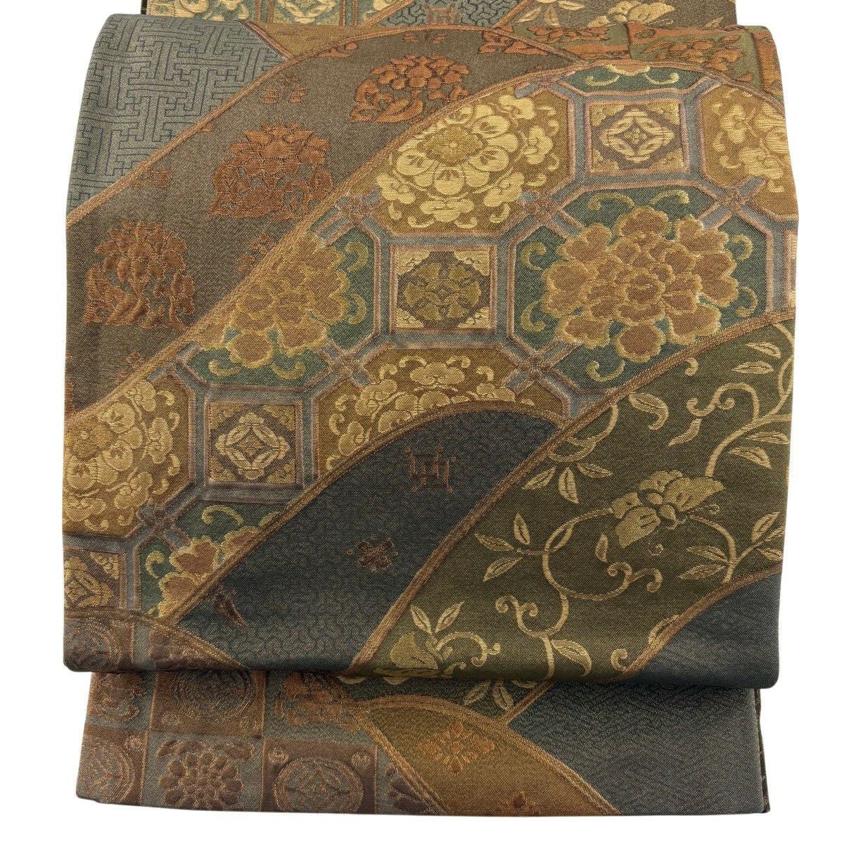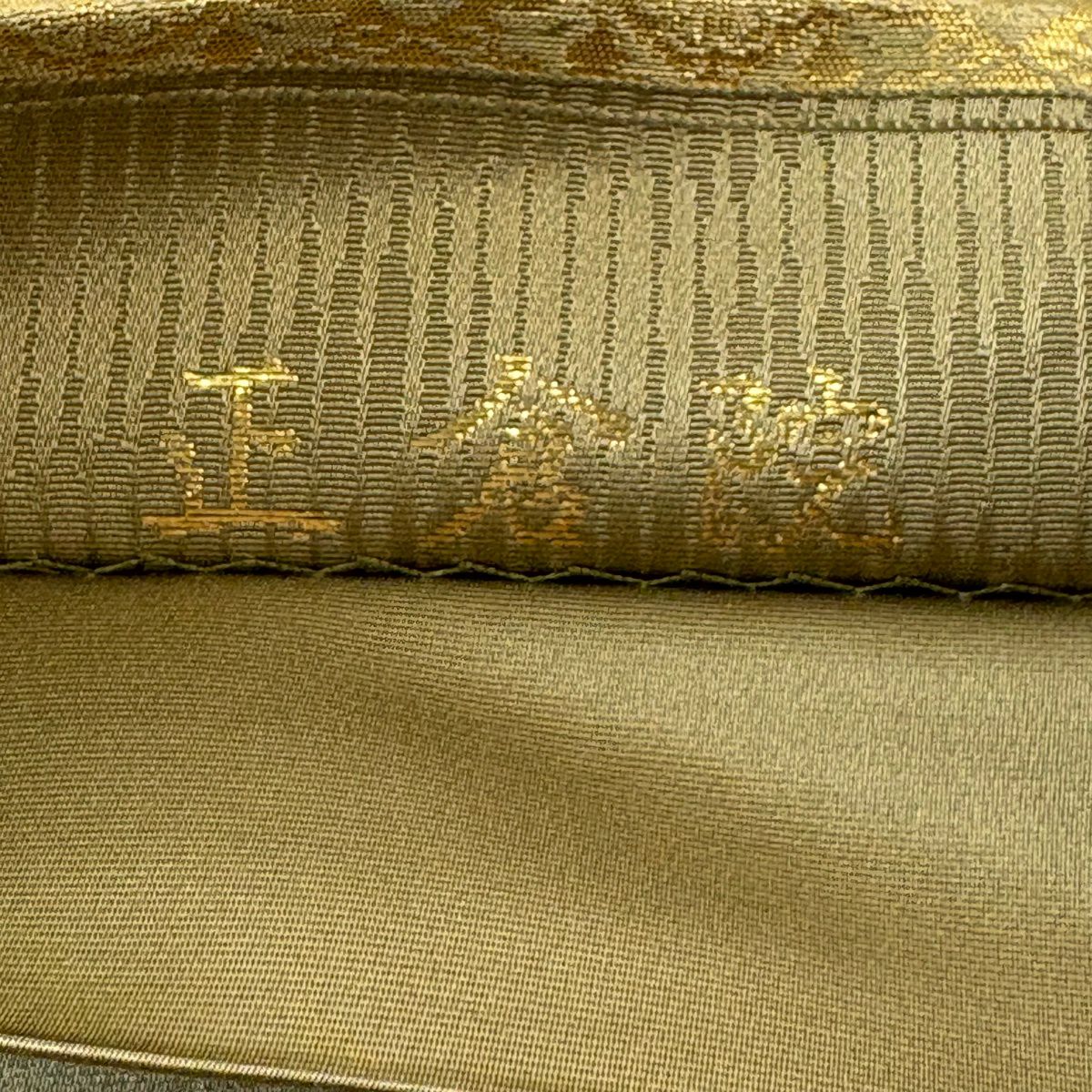 【美品】 袋帯 秀品 宝尽くし 花鳥 箔 唐織 茶緑色 六通 正絹