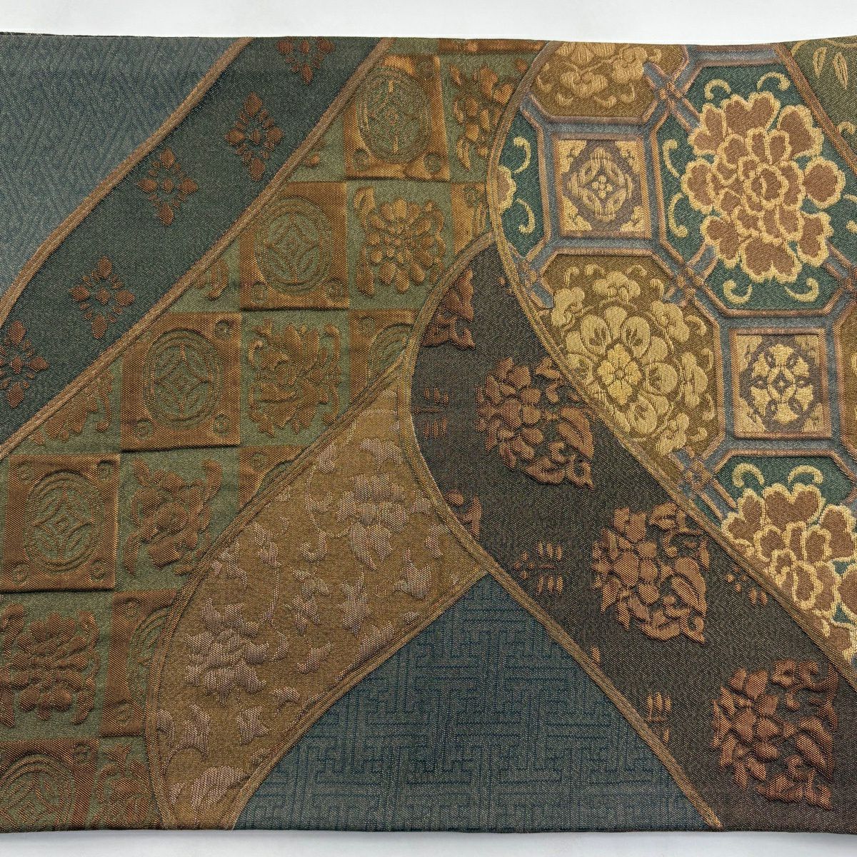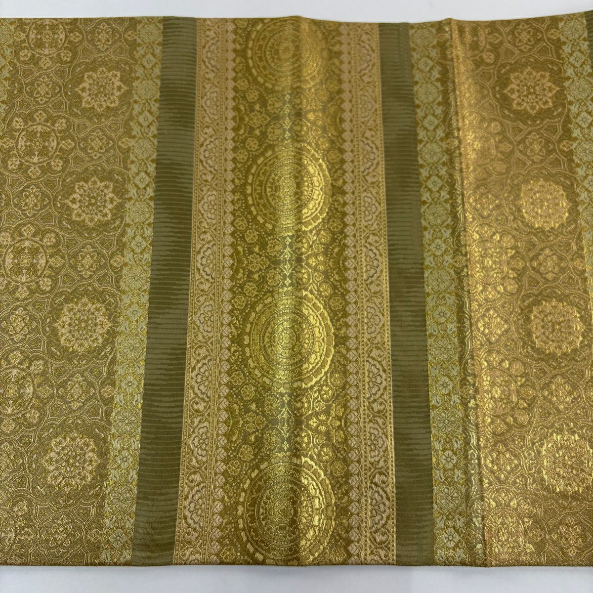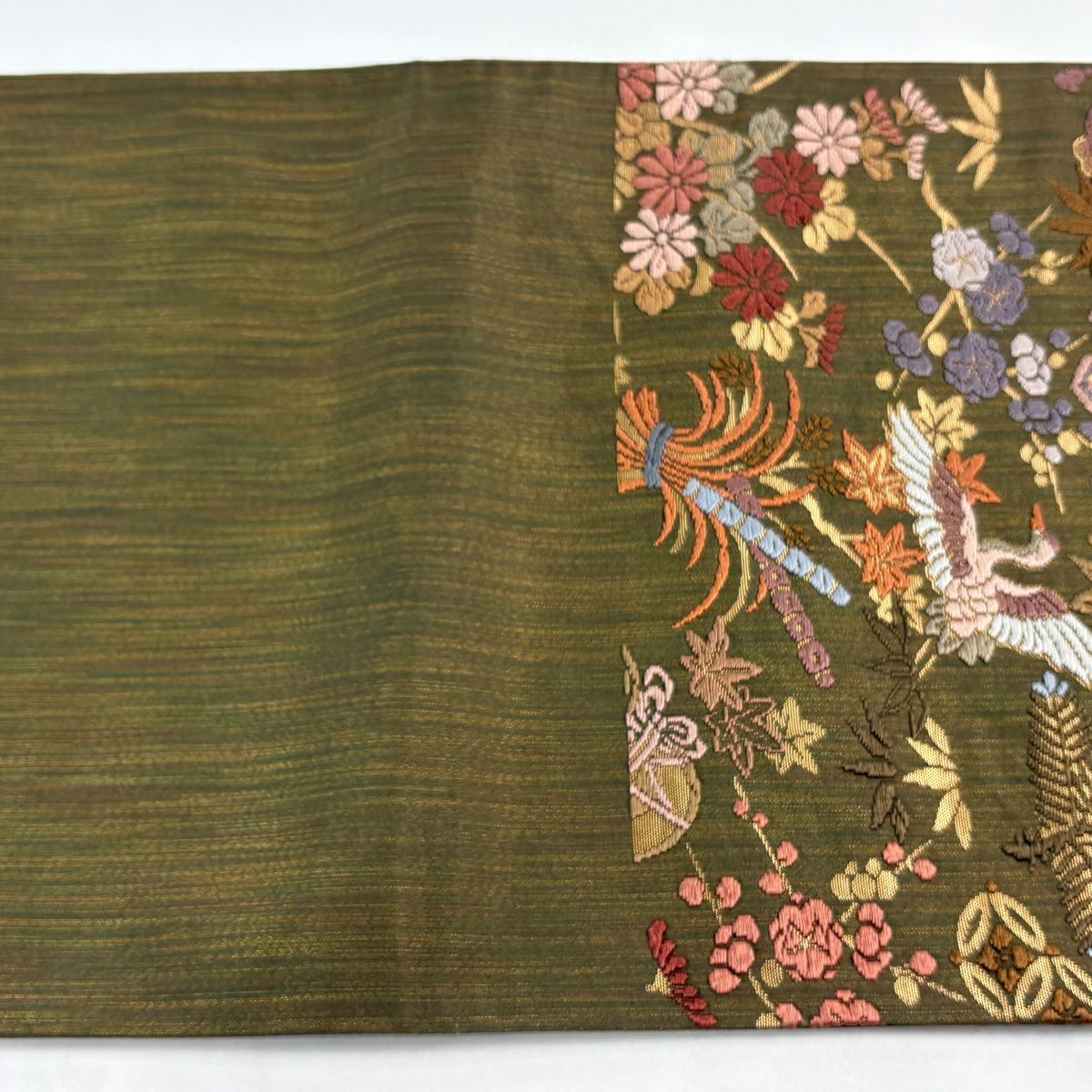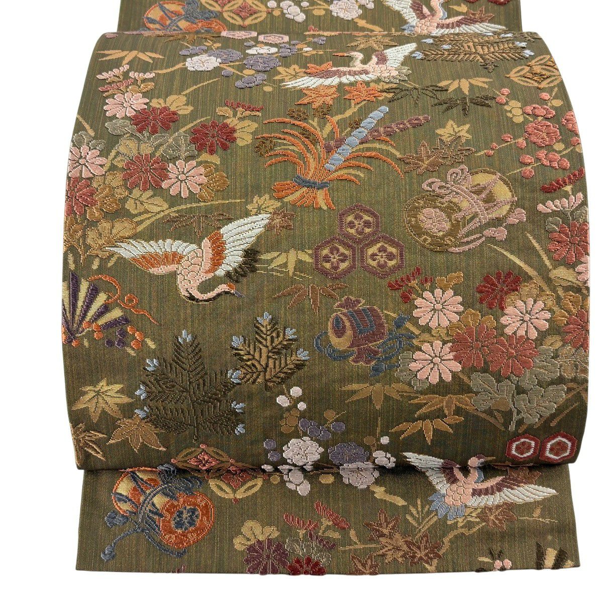 【美品】 袋帯 秀品 宝尽くし 花鳥 箔 唐織 茶緑色 六通 正絹