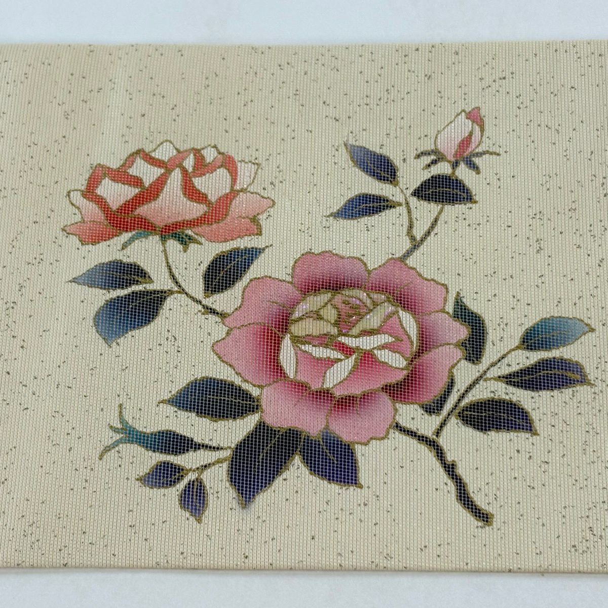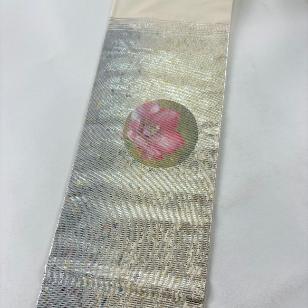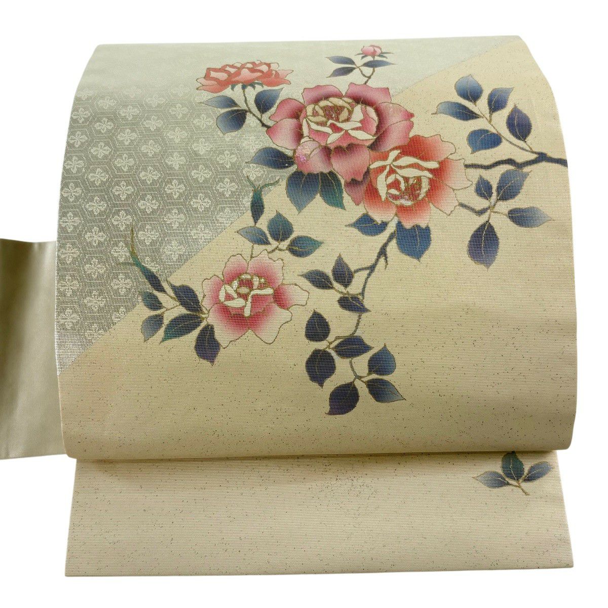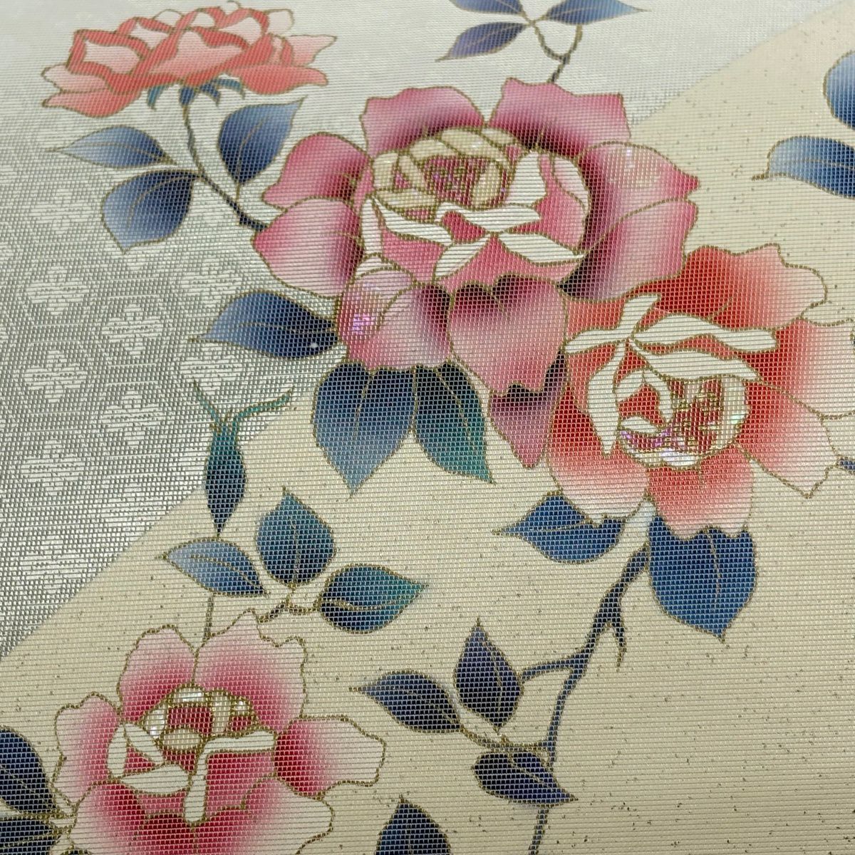 【美品】 名古屋帯 秀品 螺鈿織 薔薇 金銀彩 箔 クリーム 正絹