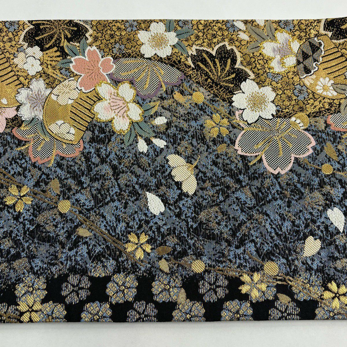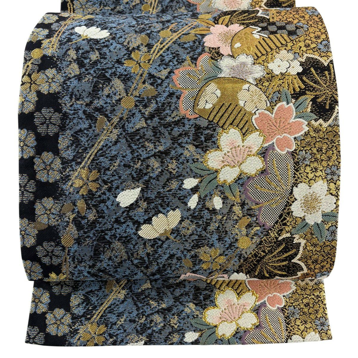 【美品】 袋帯 秀品 やまと 桜 櫛 箔 金糸 青灰色 六通 正絹