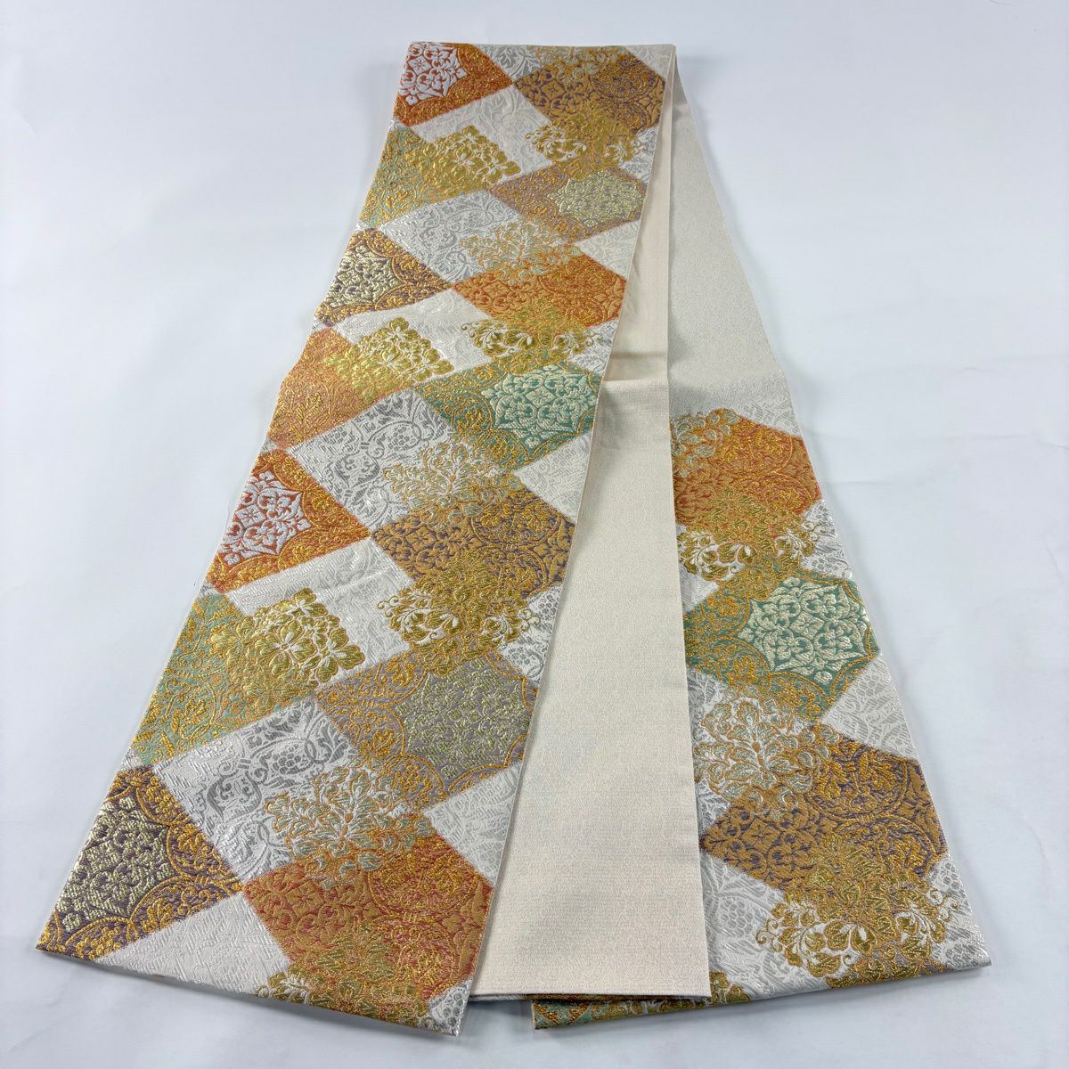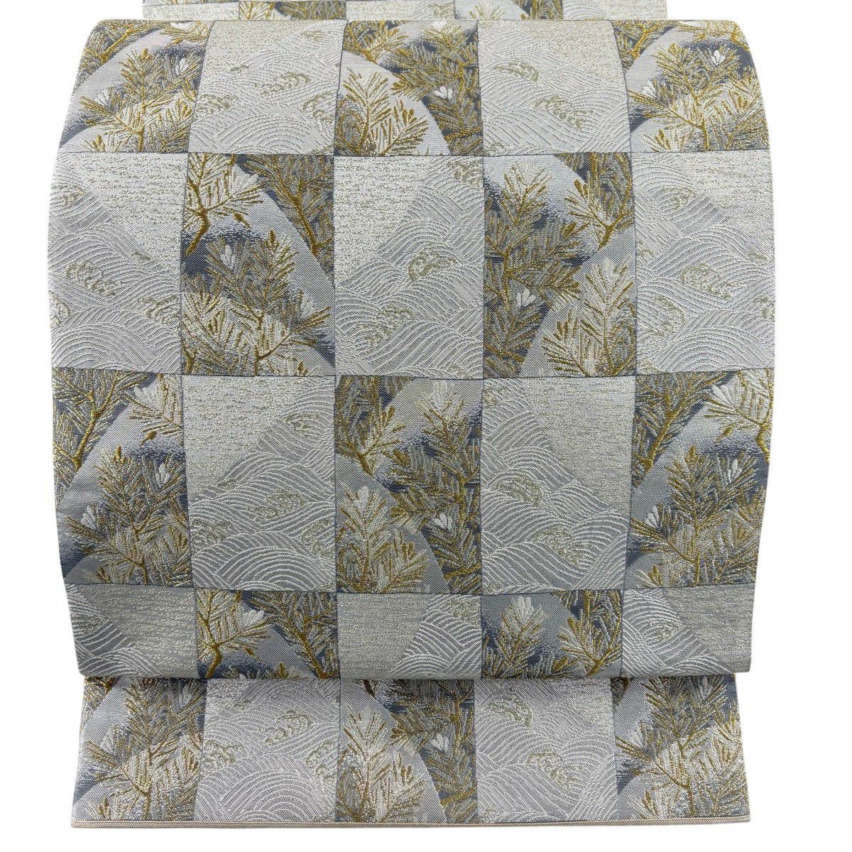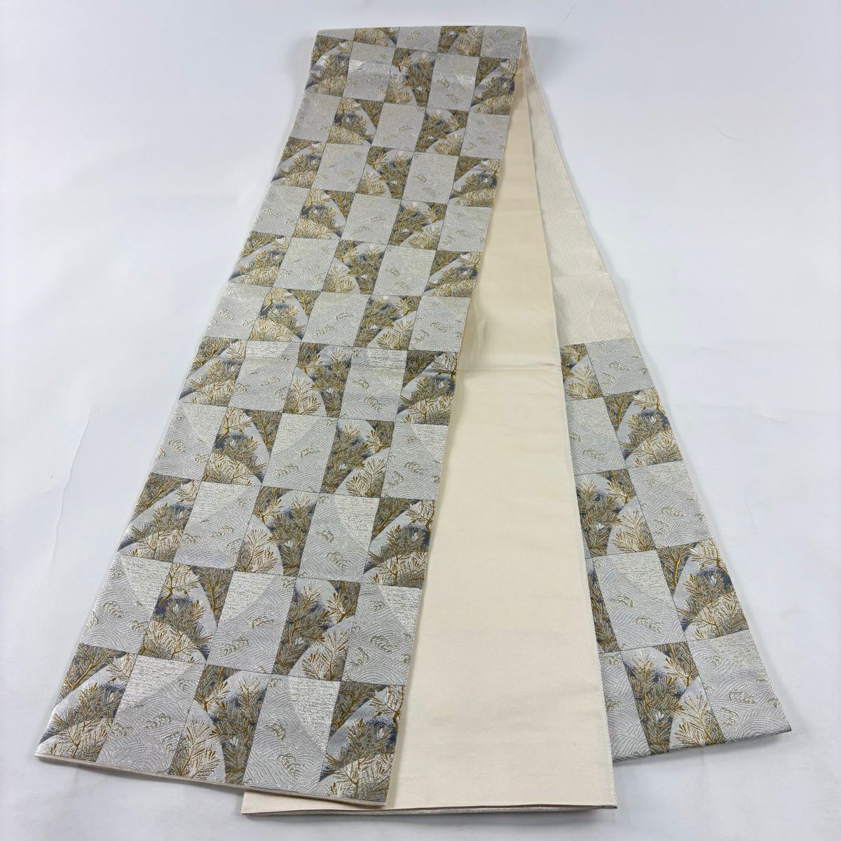 【美品】 袋帯 秀品 献上色紙市松文 金銀糸 箔 銀色 六通 正絹