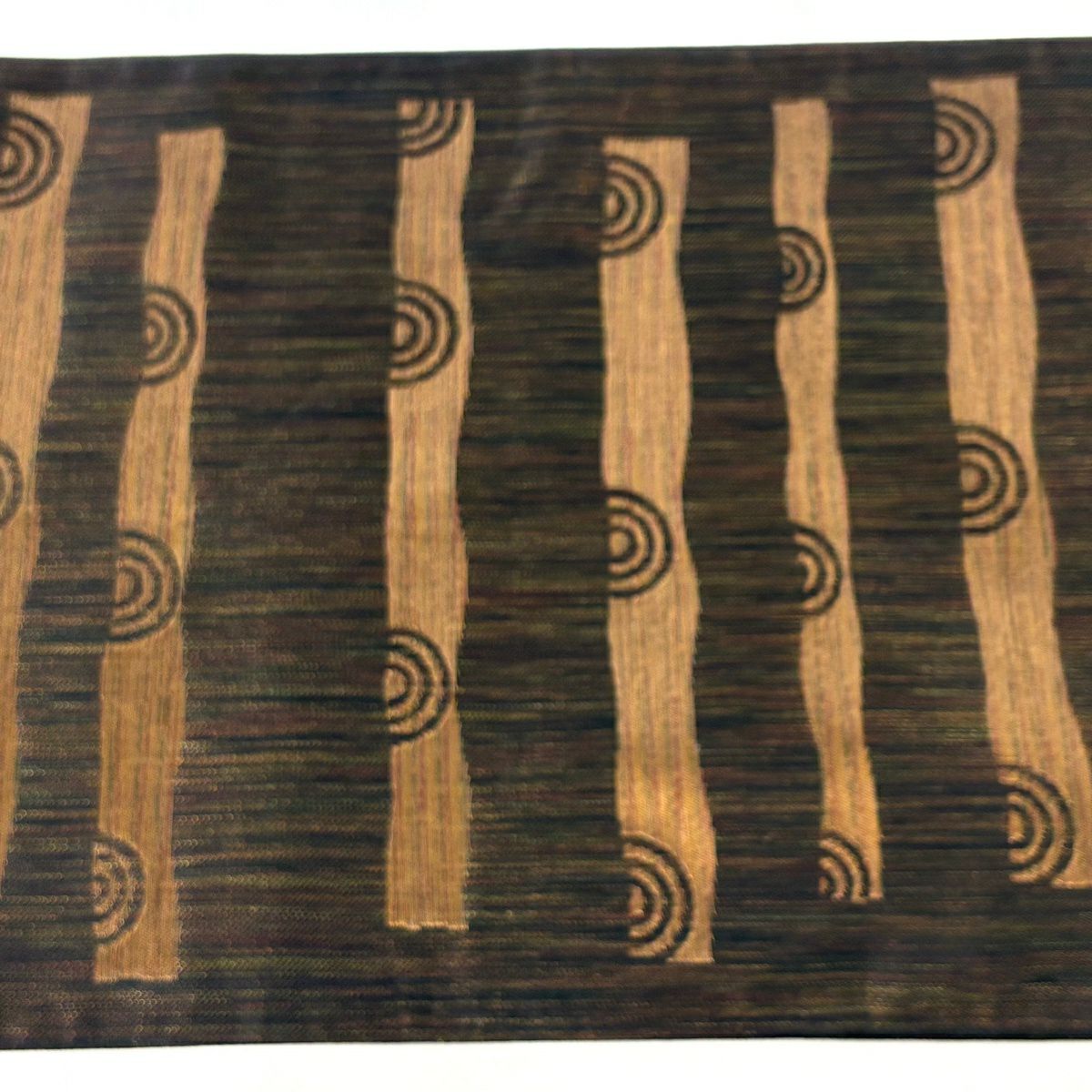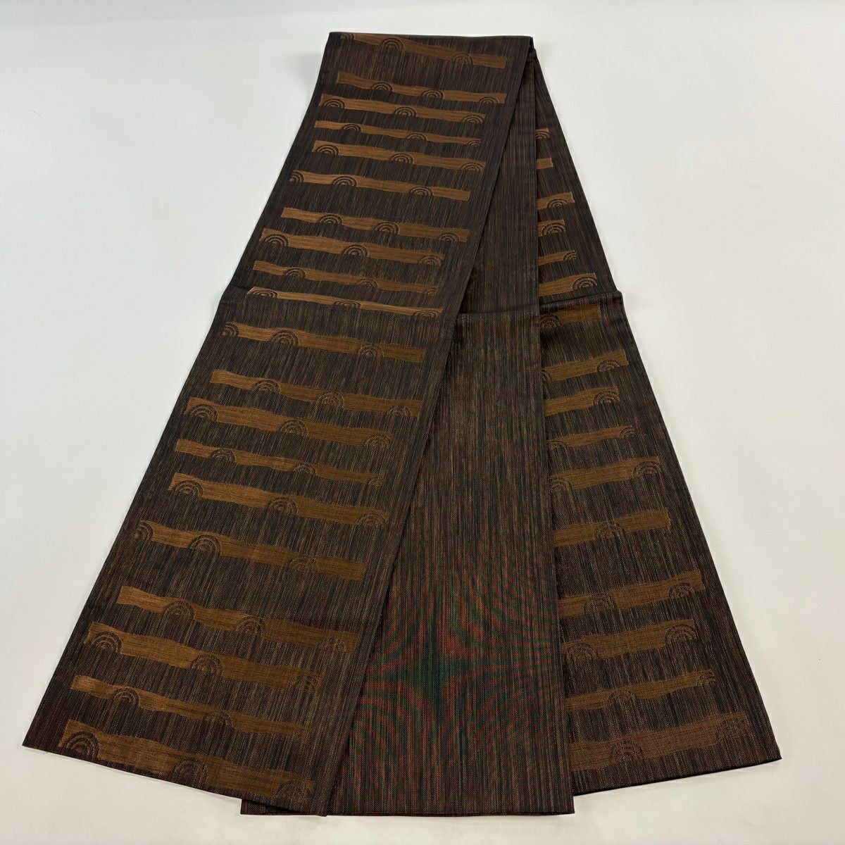 【美品】 袋帯 秀品 渦巻き 幾何学模様 金糸 焦茶色 全通 正絹