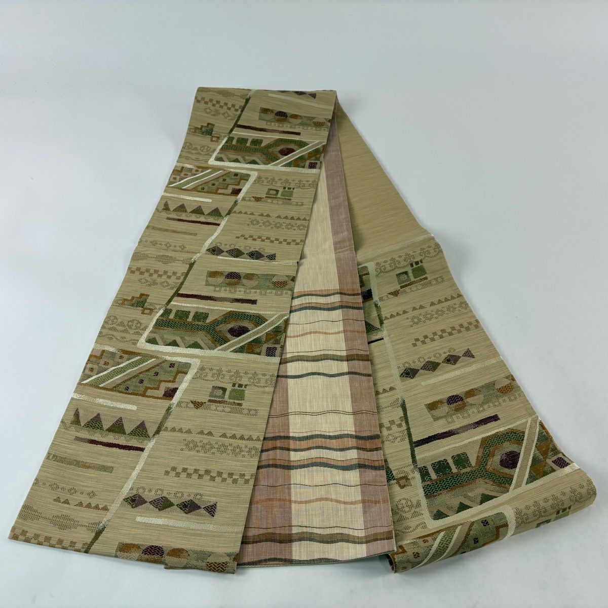 【美品】 袋帯 秀品 やまと 幾何学模様 ベージュ 六通 正絹