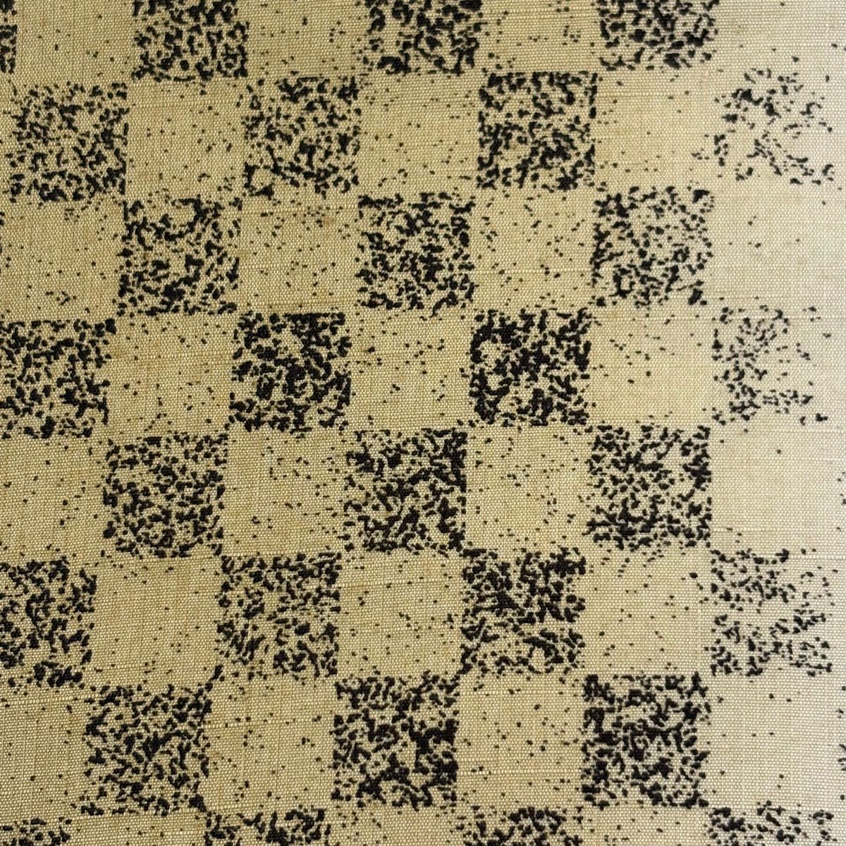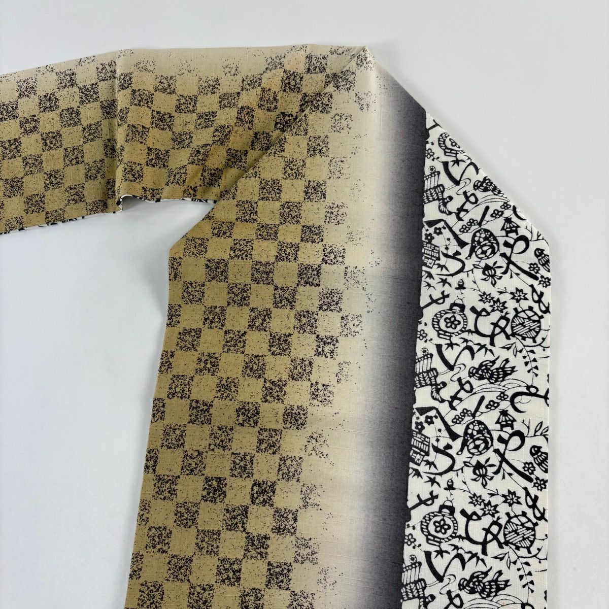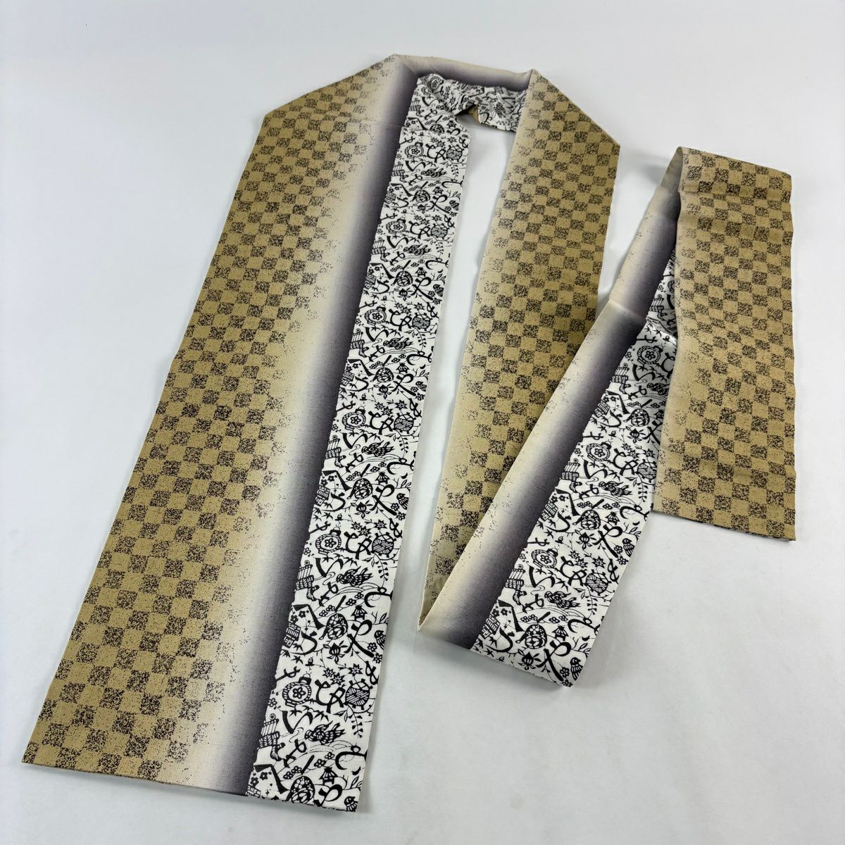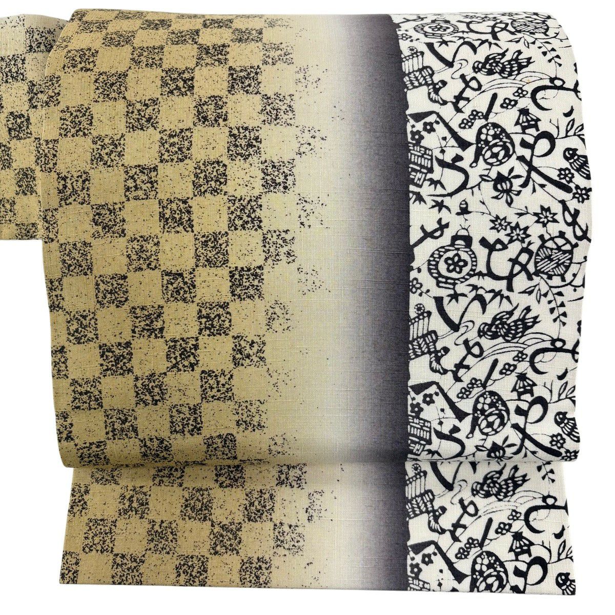 【美品】 名古屋帯 秀品 紬地 市松 文字文 ぼかし 黄土色 正絹