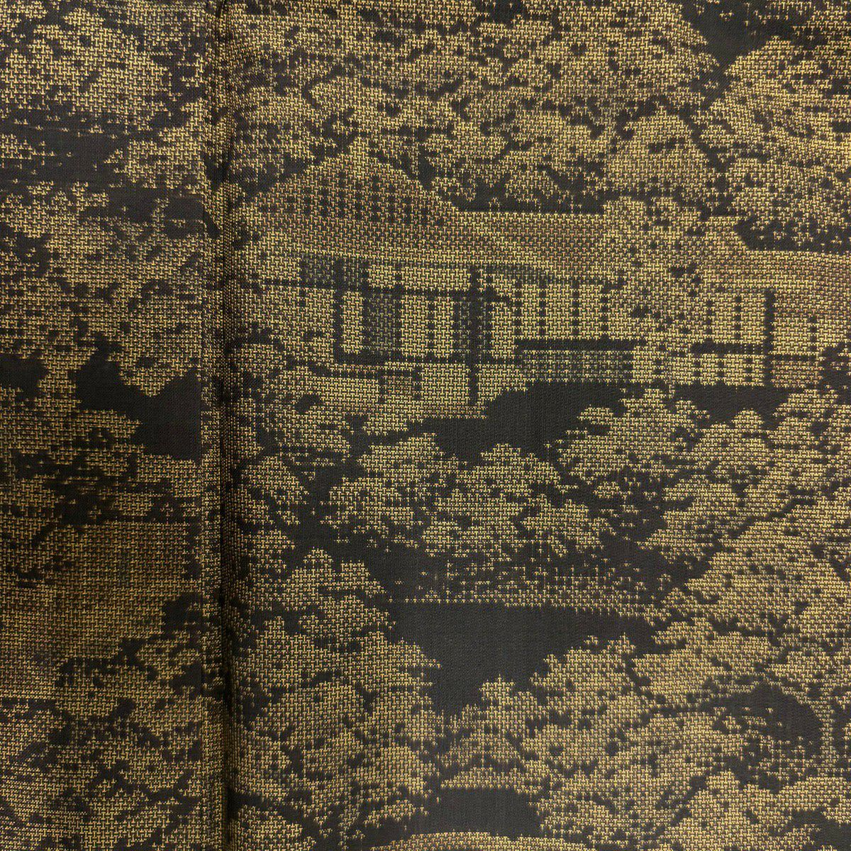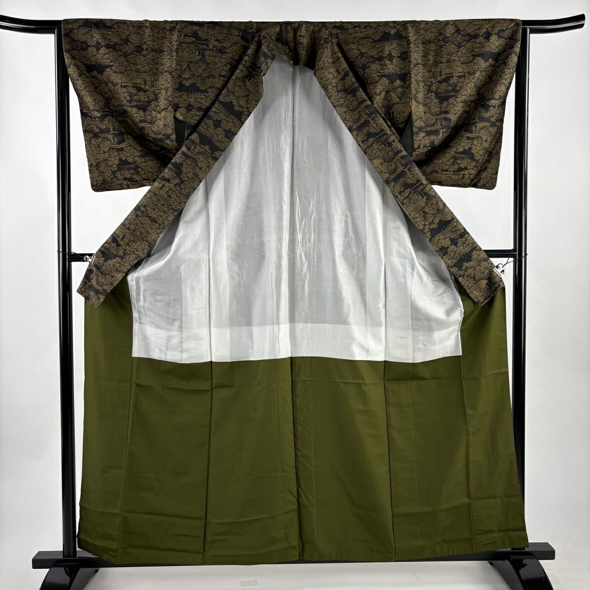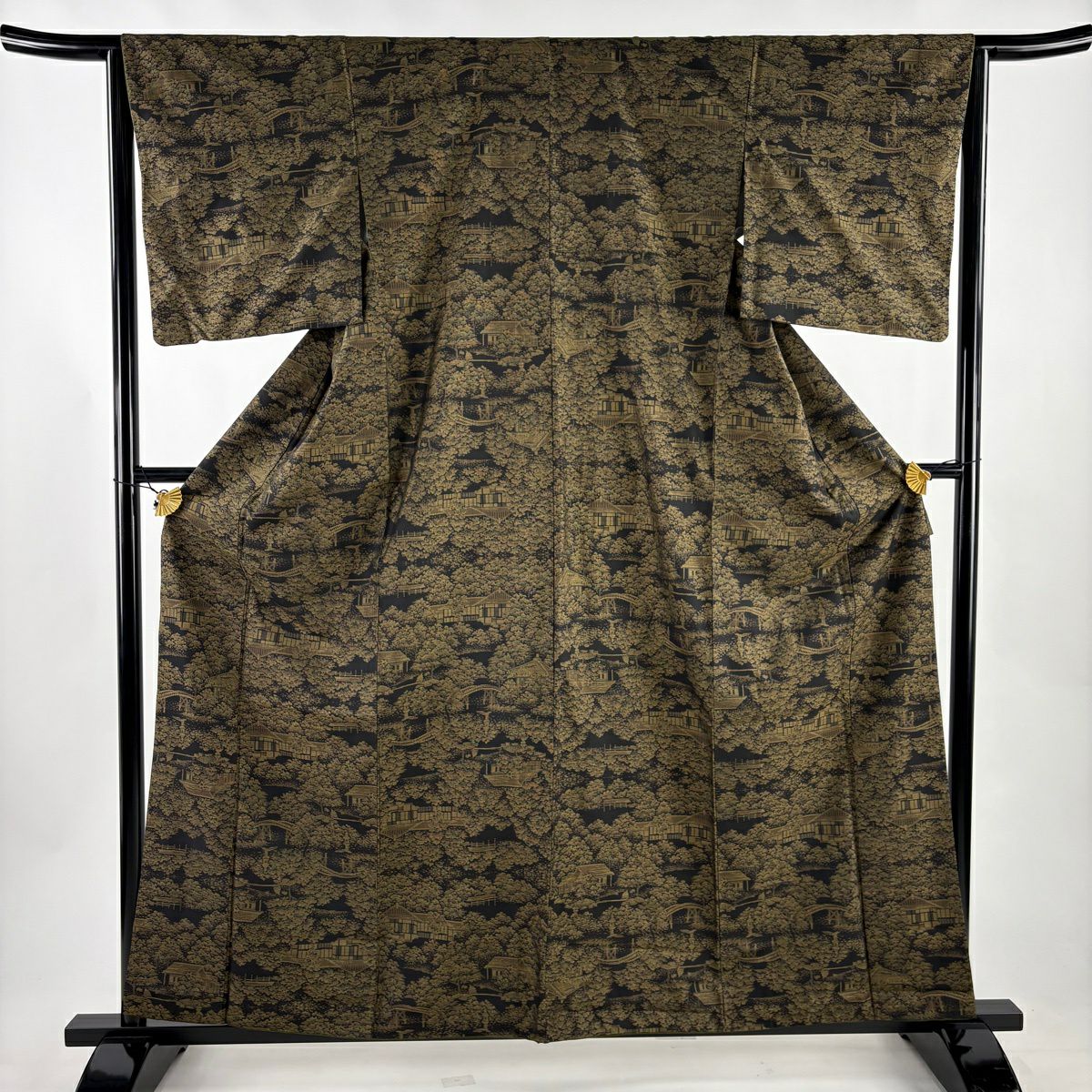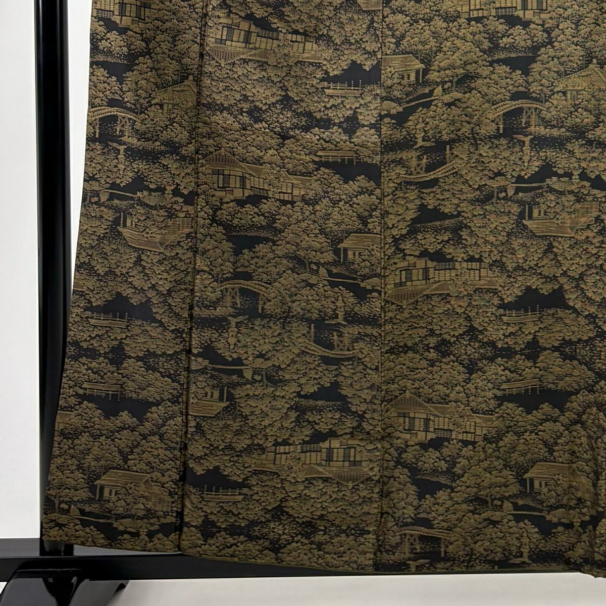 紬 身丈161cm 裄丈64cm M 袷 建物 樹木 黒 正絹 秀品