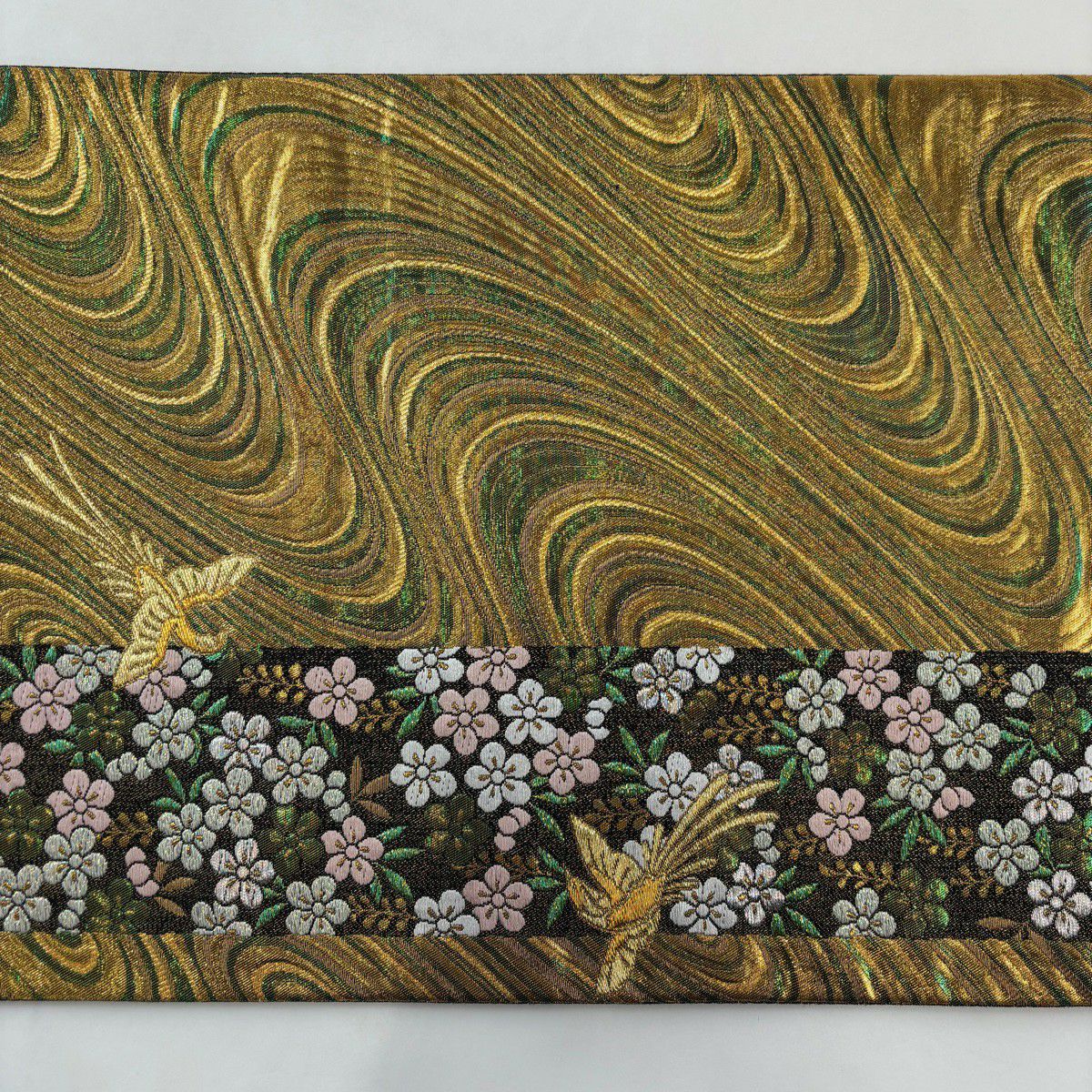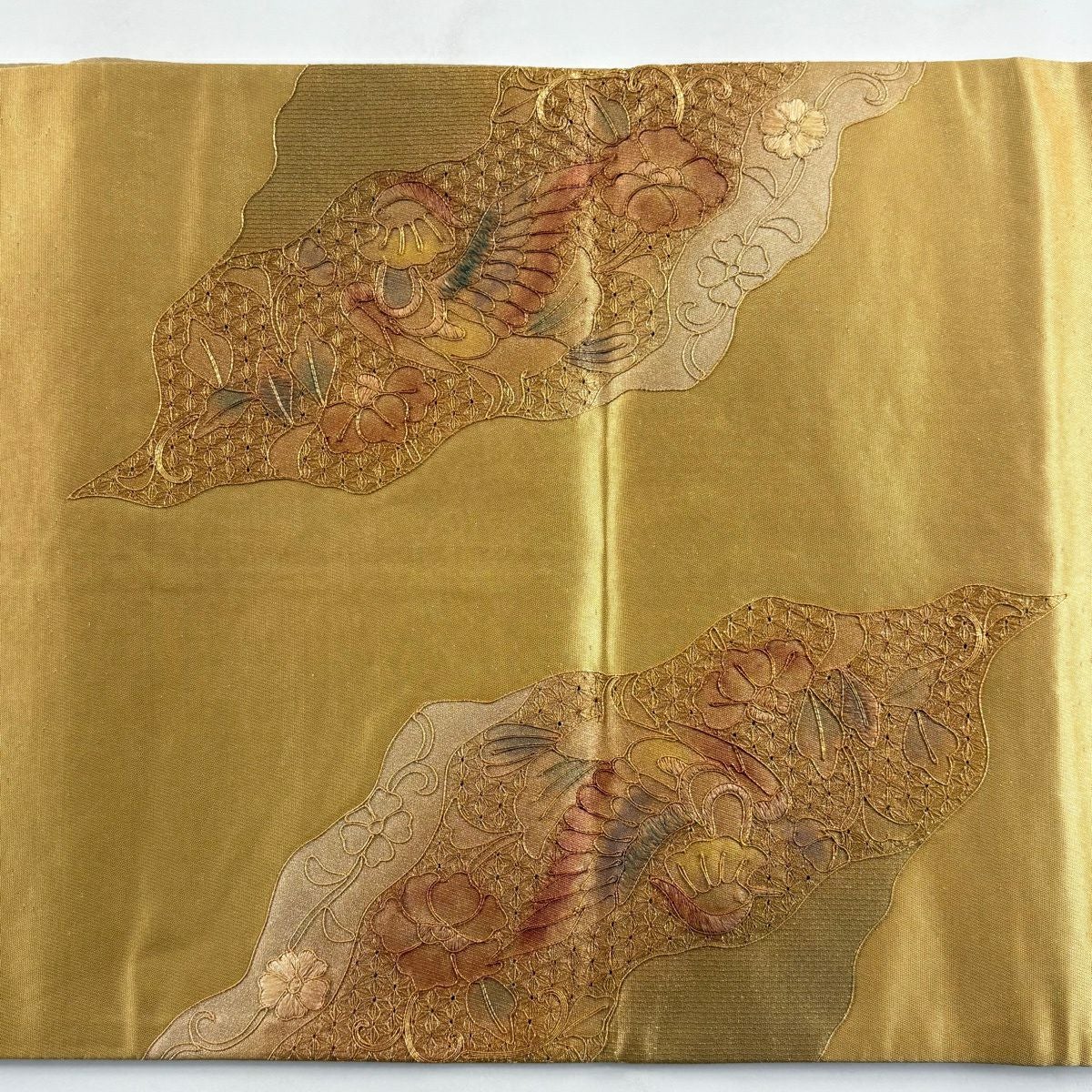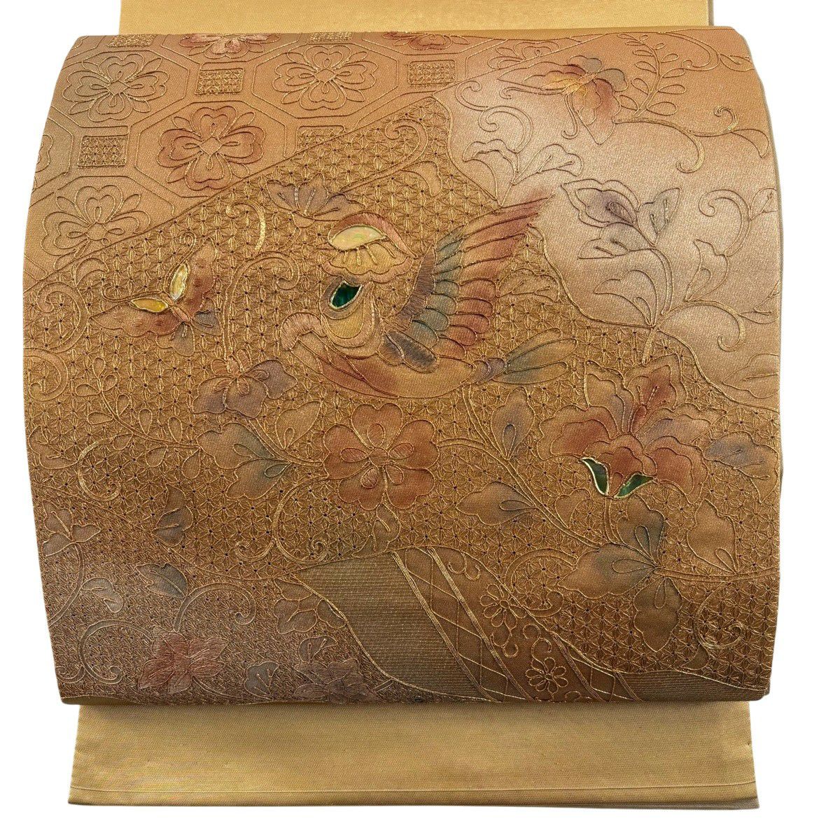 袋帯 秀品 関西仕立て 花鳥 蝶 刺繍 螺鈿 金色 お太鼓柄 正絹