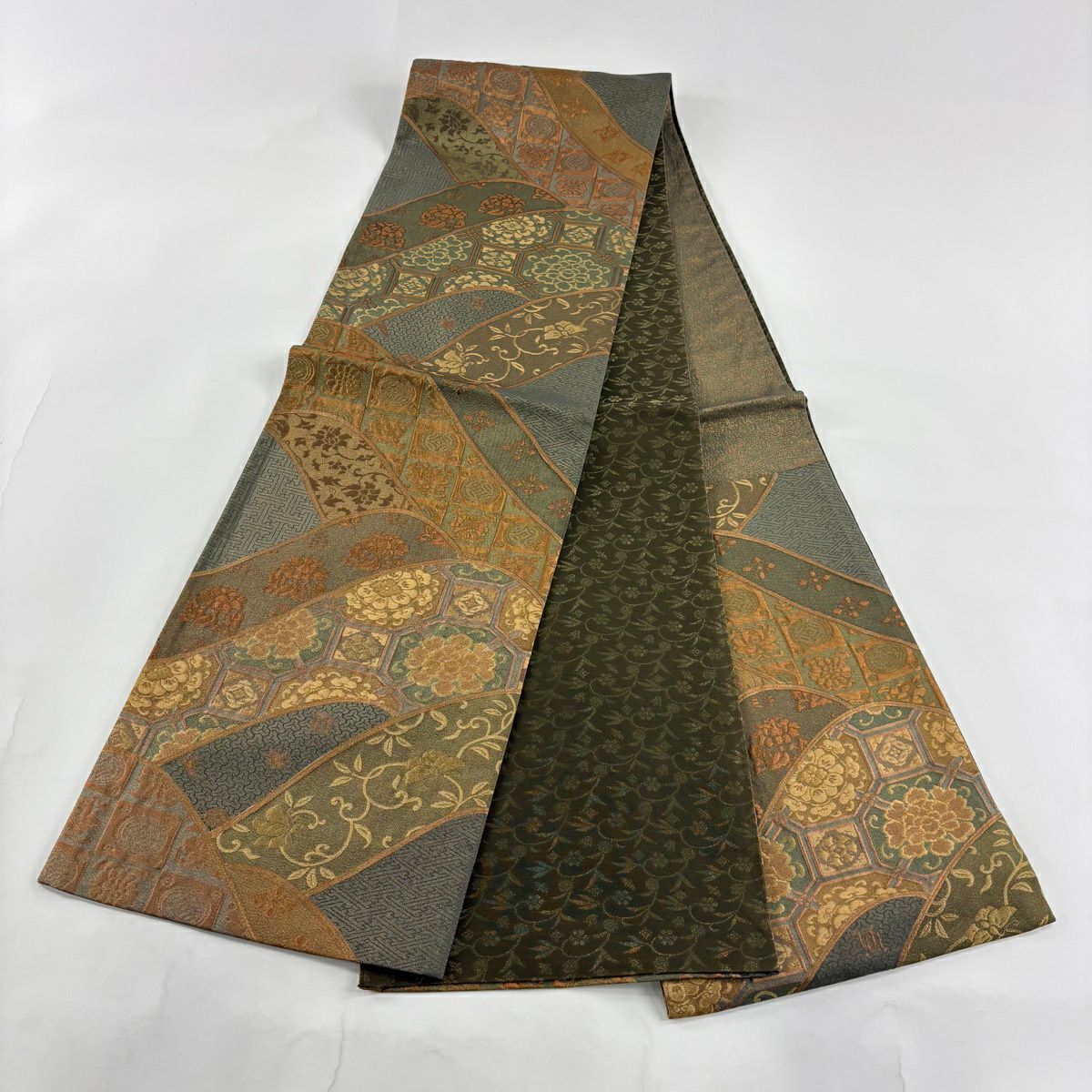 【美品】 袋帯 秀品 枝花 幾何学模様 箔 金糸 深緑 六通 正絹