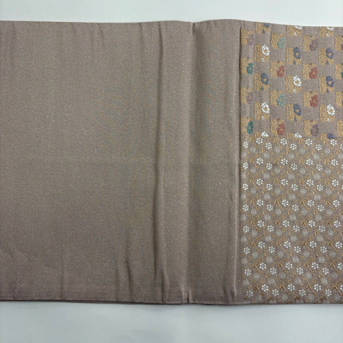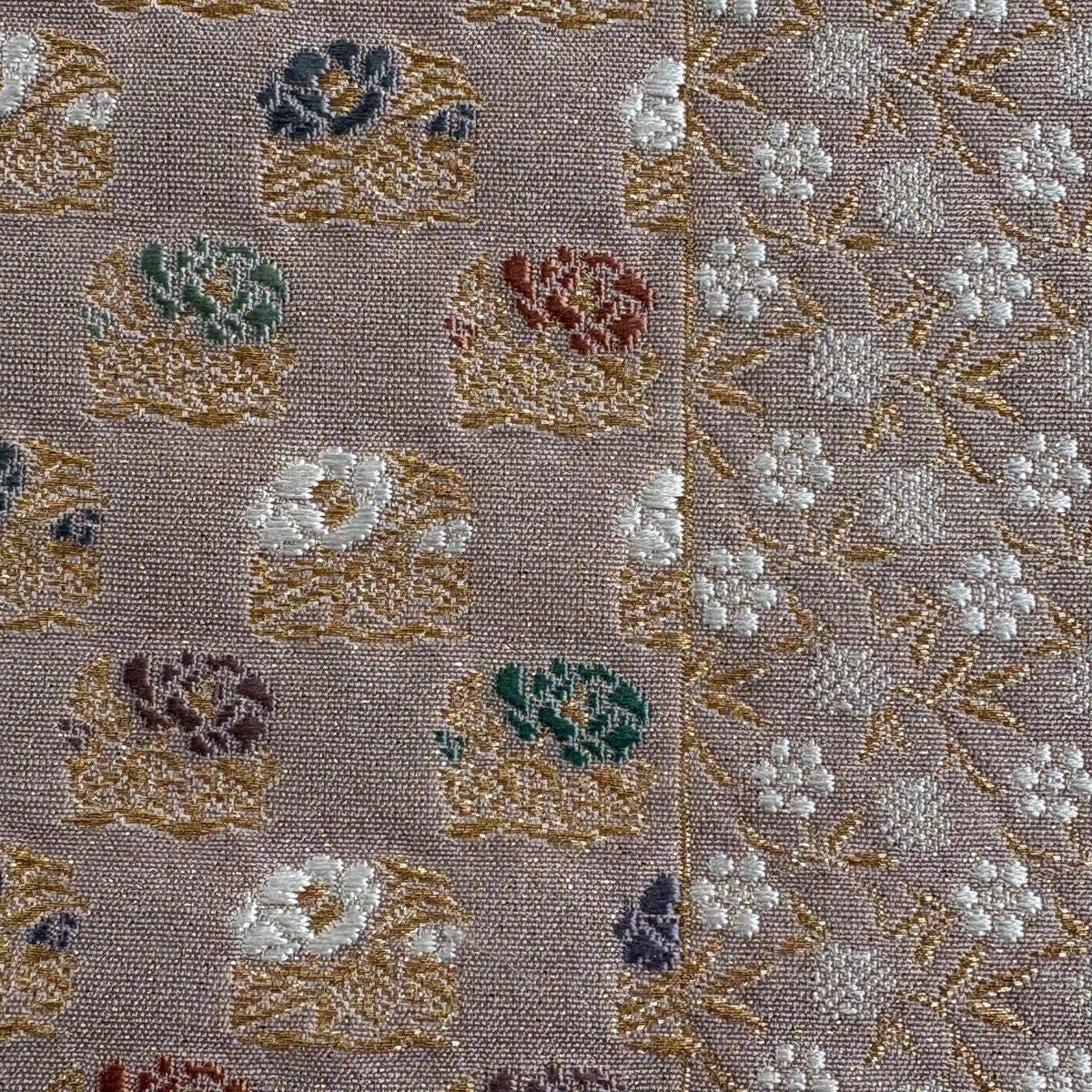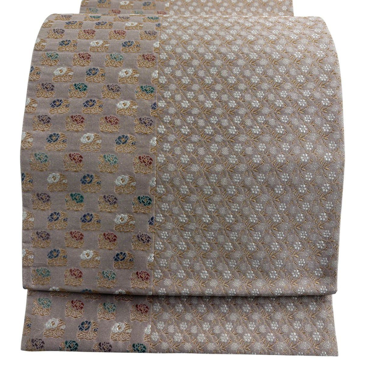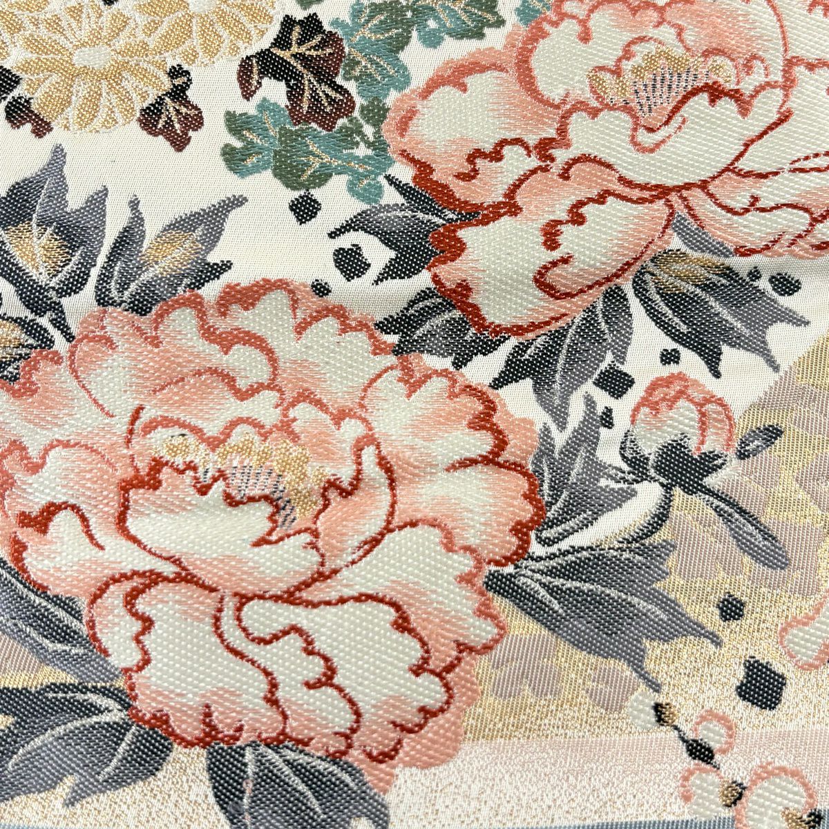 【美品】 袋帯 秀品 華文 牡丹 金銀糸 唐織 薄茶色 六通 正絹
